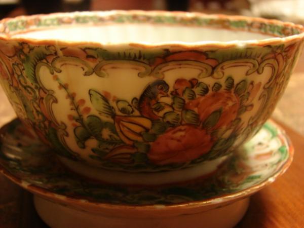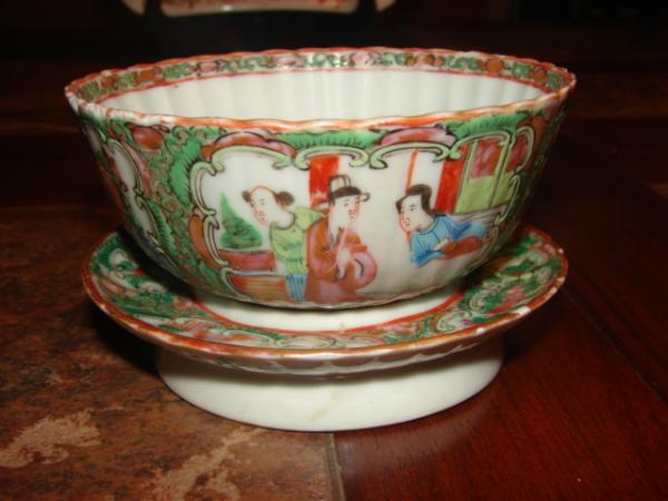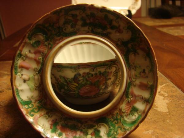 I don't know anything about this. I have never seen anything like these pieces. The saucer has a hole to place the bowl in. The dish has grooves all around and the you can feel the texture on the painting when you run your fingers over it. There are 2 paintings of 3 chinese men and on the other 2 sides the painting is of a bird in flowers. The dish is painted around the rim and decorated around the rim on the inside of the bowl as well. The saucer is painted 2 paintings of 2 men sitting and it seems like they are chatting with each other and 2 painting of flowers. Under the saucer there are flowers painted also. There are no stamps or markings on the dishes.