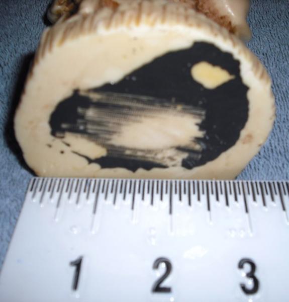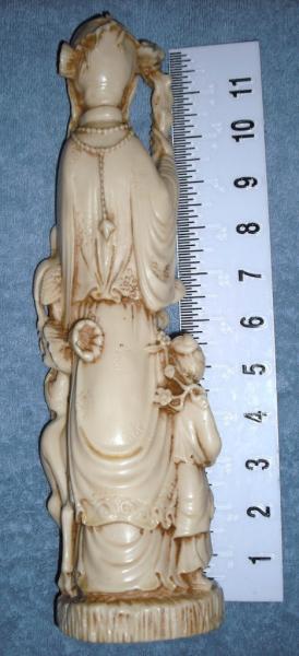 Statue depicting a Chinese male figure (maybe Chinese deity Sau, God of Longetivity?), with domed head, and long flowing beard, holding an upright branch/stick in both hands. Has what appears to be a deer (another symbol of longetivity) standing in front, with a small figure sitting on deer's back. Another small figure to right of male figure. Bird perched adjacent to male figure's left elbow. Item was originally glued to black display base (There is information in Chinese characters under the base). Item is intact, though there are what appear to be faded markings on male figure's clothing. Item is very solid, and heavy for size.
