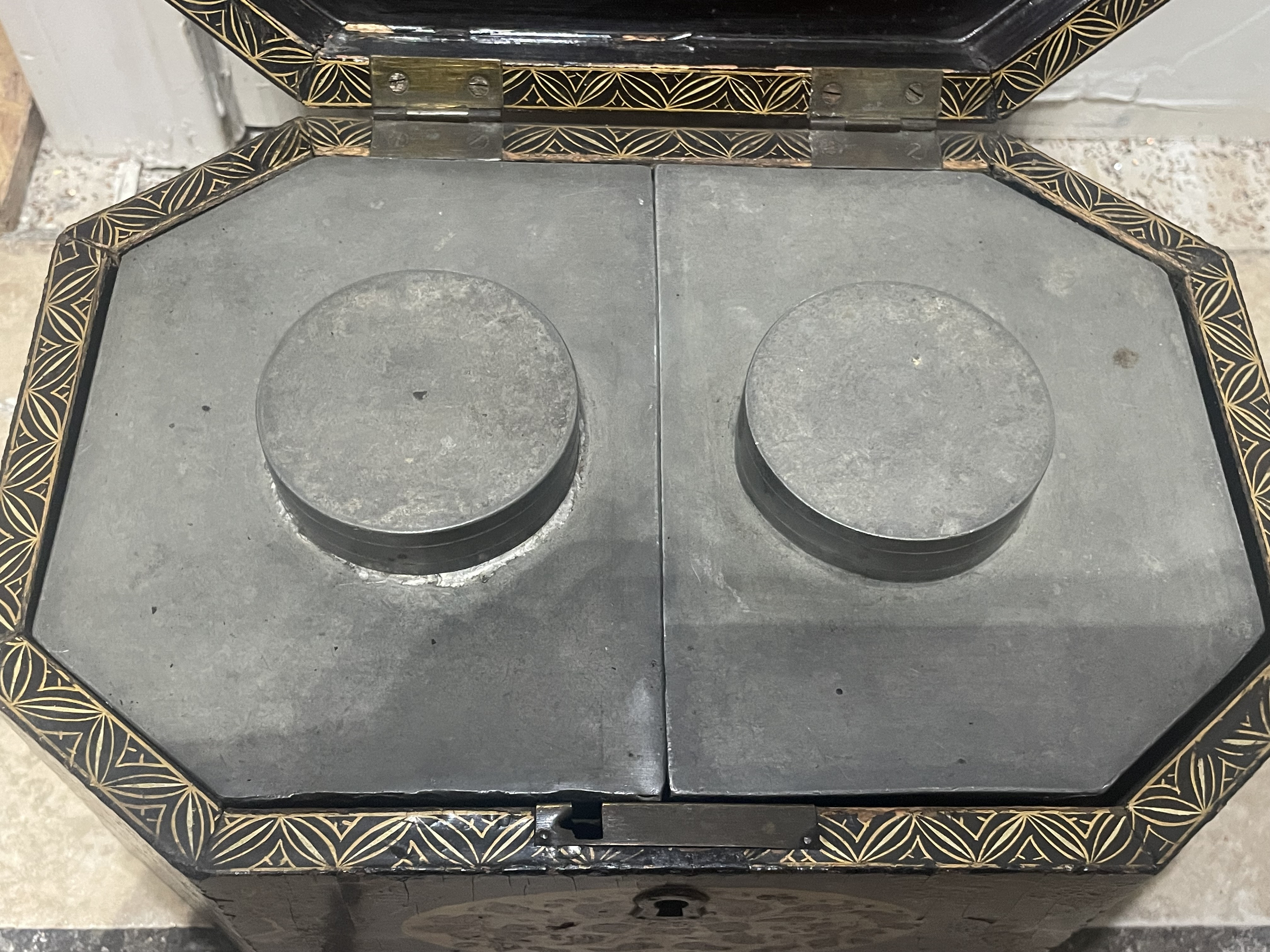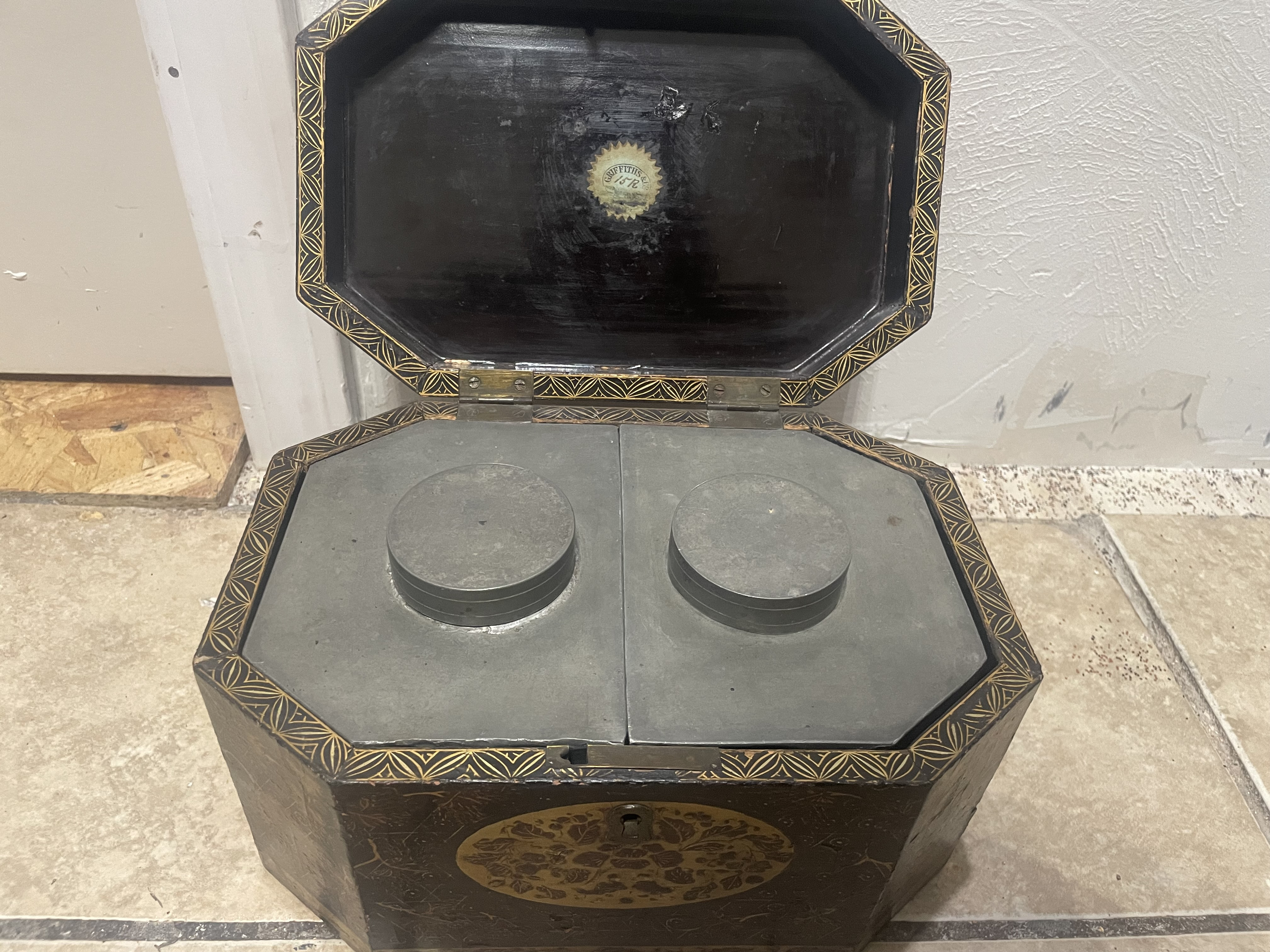 This is a Chinese lacquered tea caddy box, octagonal in shape, adorned with intricate hand-painted floral and gilded decorations. It includes two internal tea canisters made of tin or pewter with fitted lids. Inside the lid, there is a seal reading "Griffiths & Co," suggesting it may have been distributed by a historical British or Chinese export company. The exterior design, lacquerwork, and craftsmanship suggest it dates to the late 19th or early 20th century, a period when such tea caddies were popular for storing loose tea leaves.