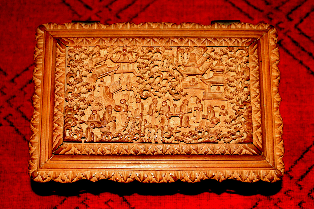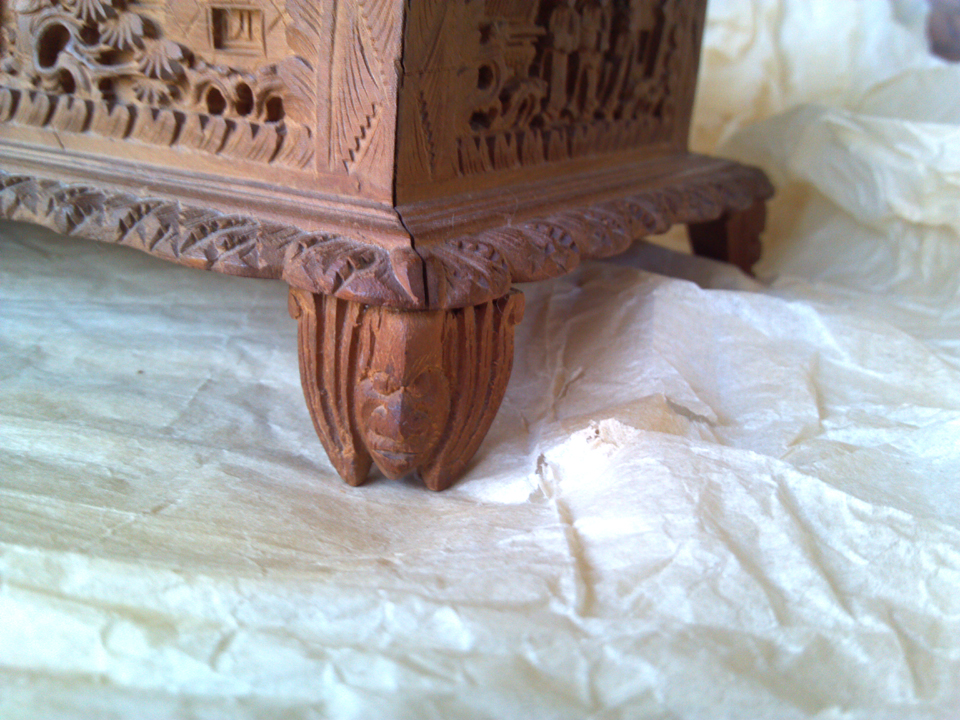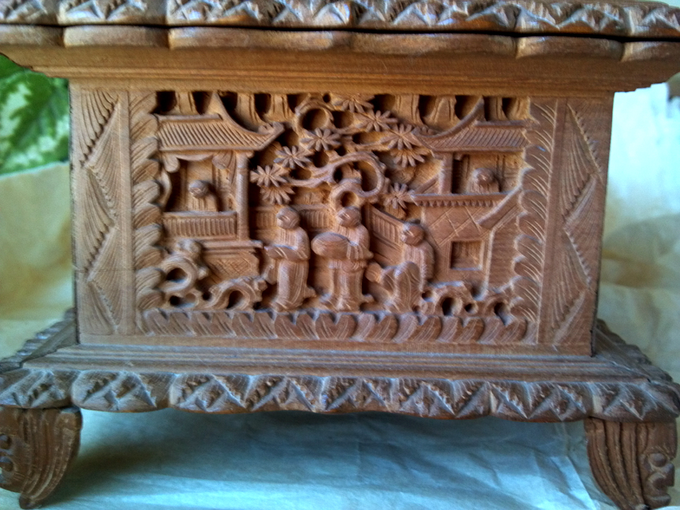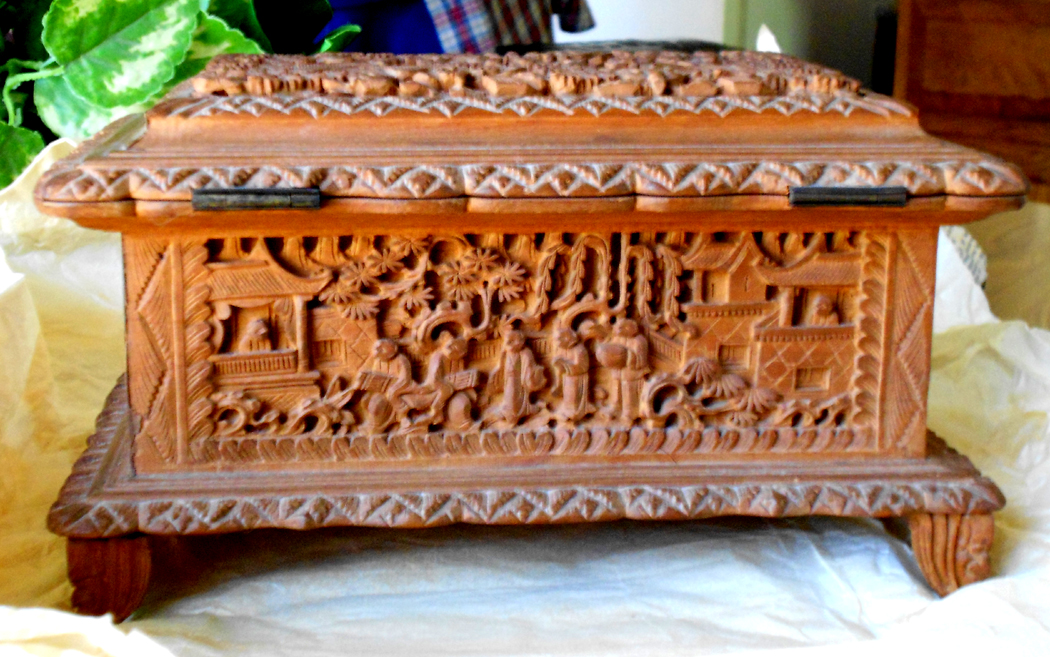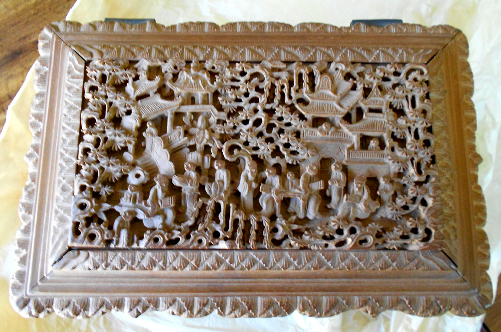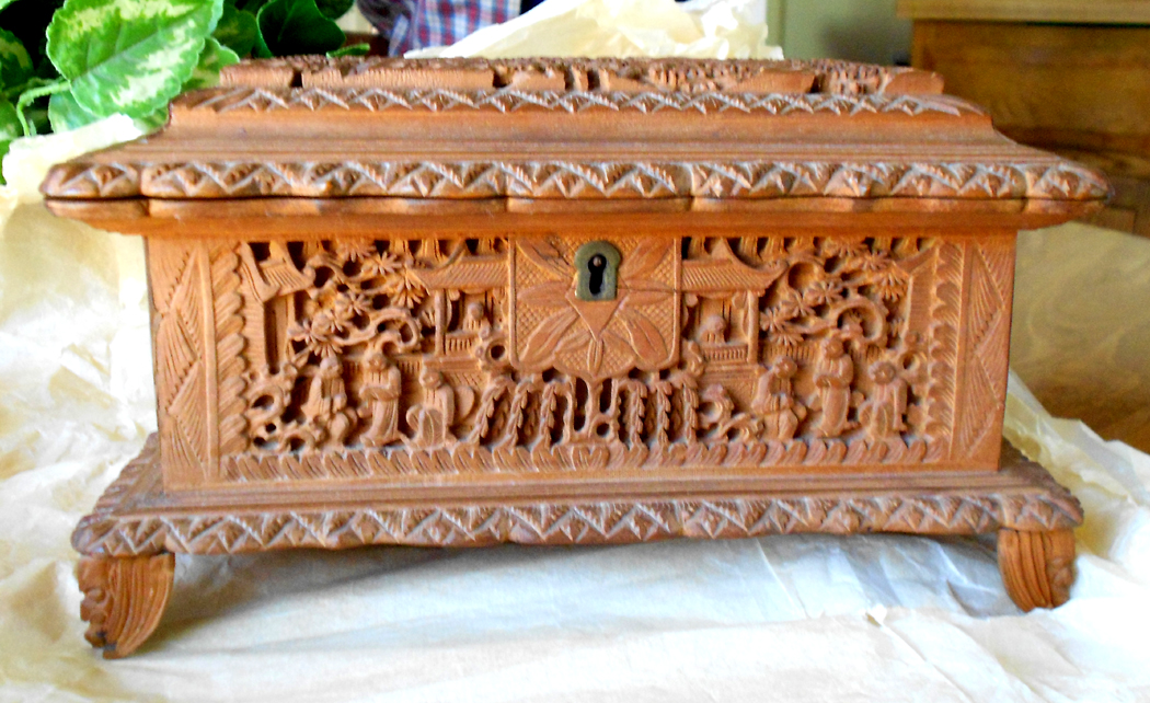 This is a jewelry box (I think) that is made out of teak, at least to the best of my knowledge. It has very detailed relief carving on the top and all 4 sides, even the feet have some detail. It was brought back from Amoy, China by a relative who was Vice Consul in 1902. It has been in my family ever since. It is kept in a wooden outer carrying box that has some Chinese writing on it, I have yet to be able to translate it. There is also some writing on the bottom of the box itself. The dimensions are 4 3/4" x 5" x 8 3/4". It is lined with red velvet, and has a lift-out tray, also lined with red velvet.