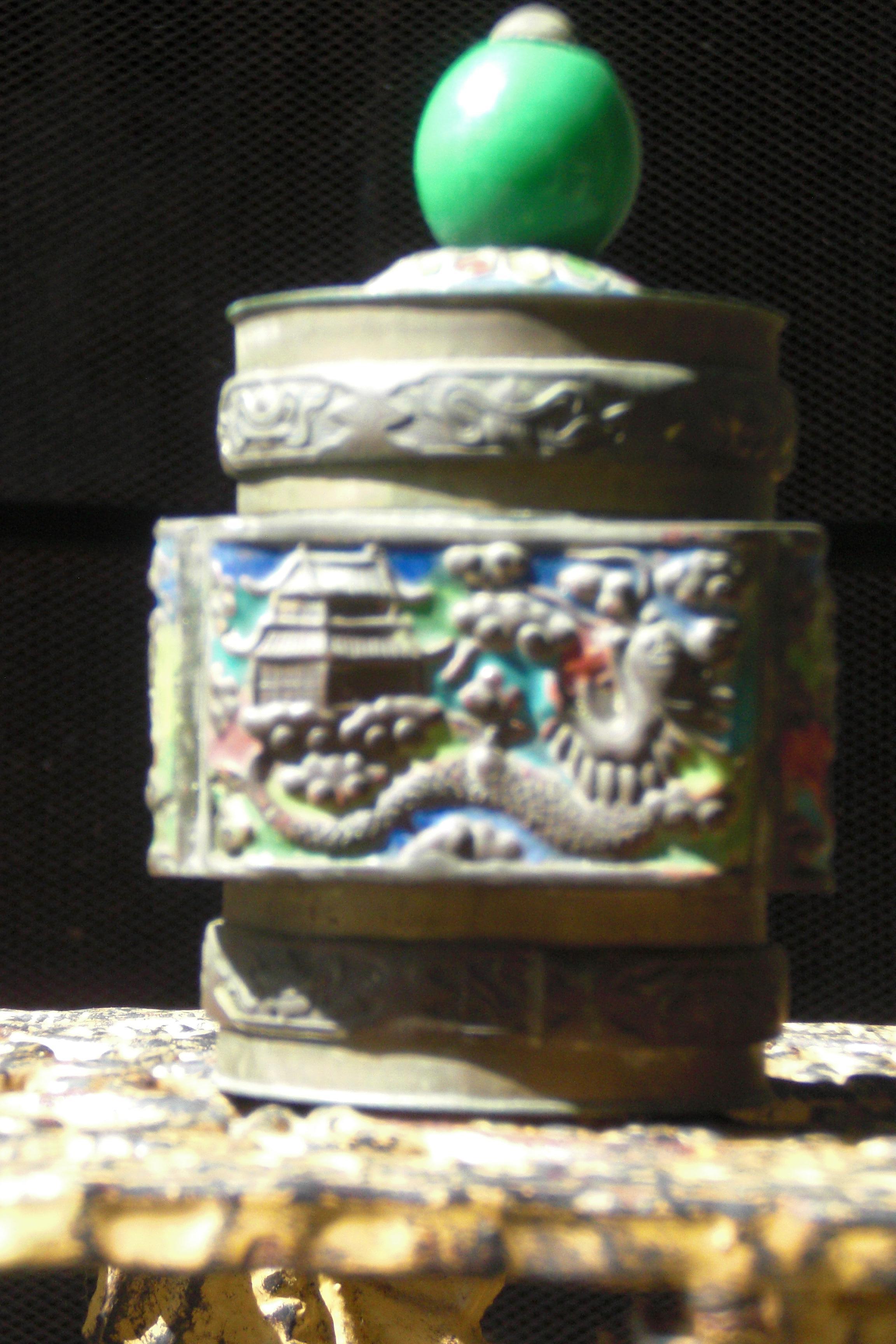 Beautiful little trinket box with blue, green and yellow enamel paint behind carved dragons and houses. Cute green enamel ball on top.