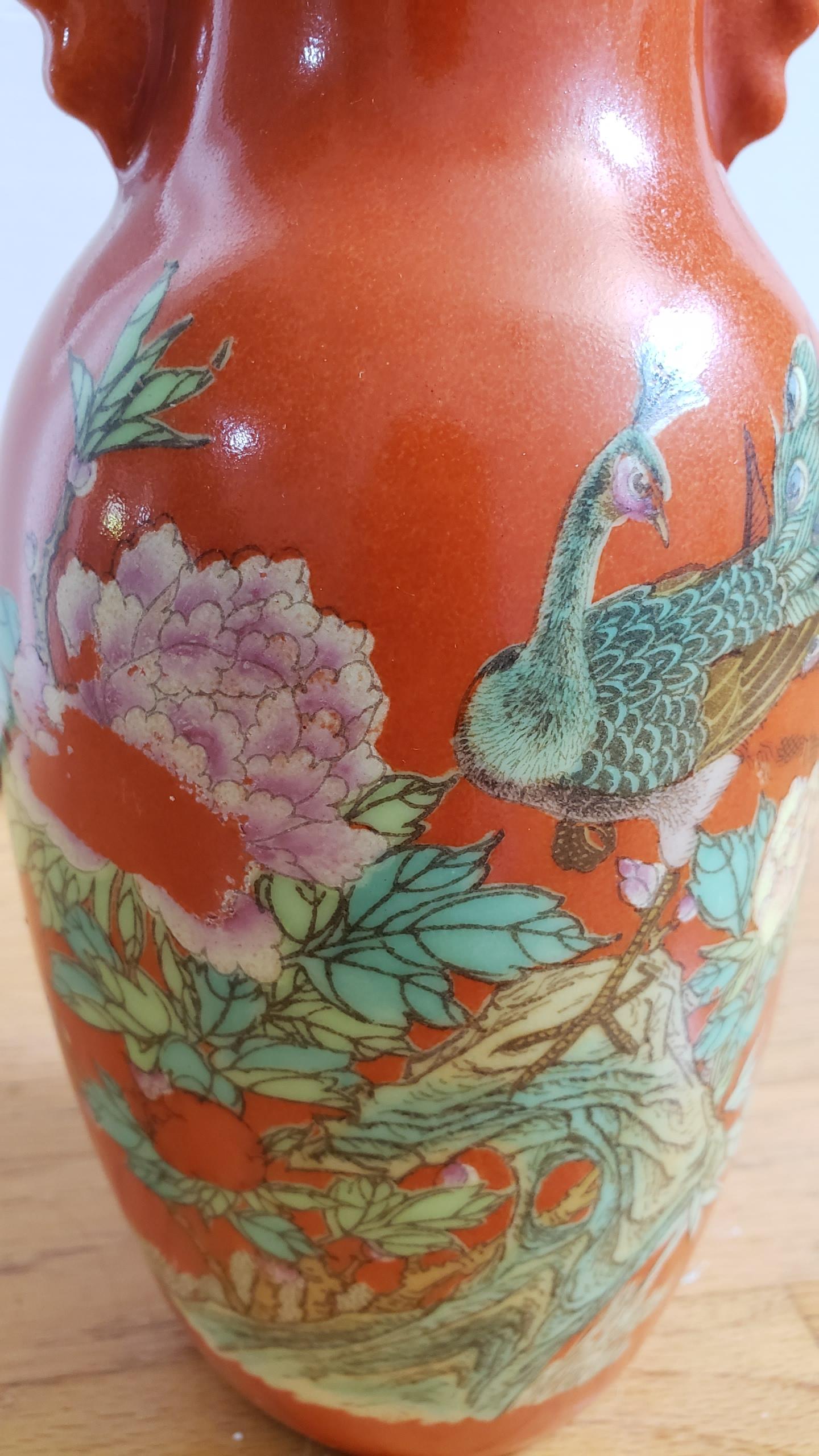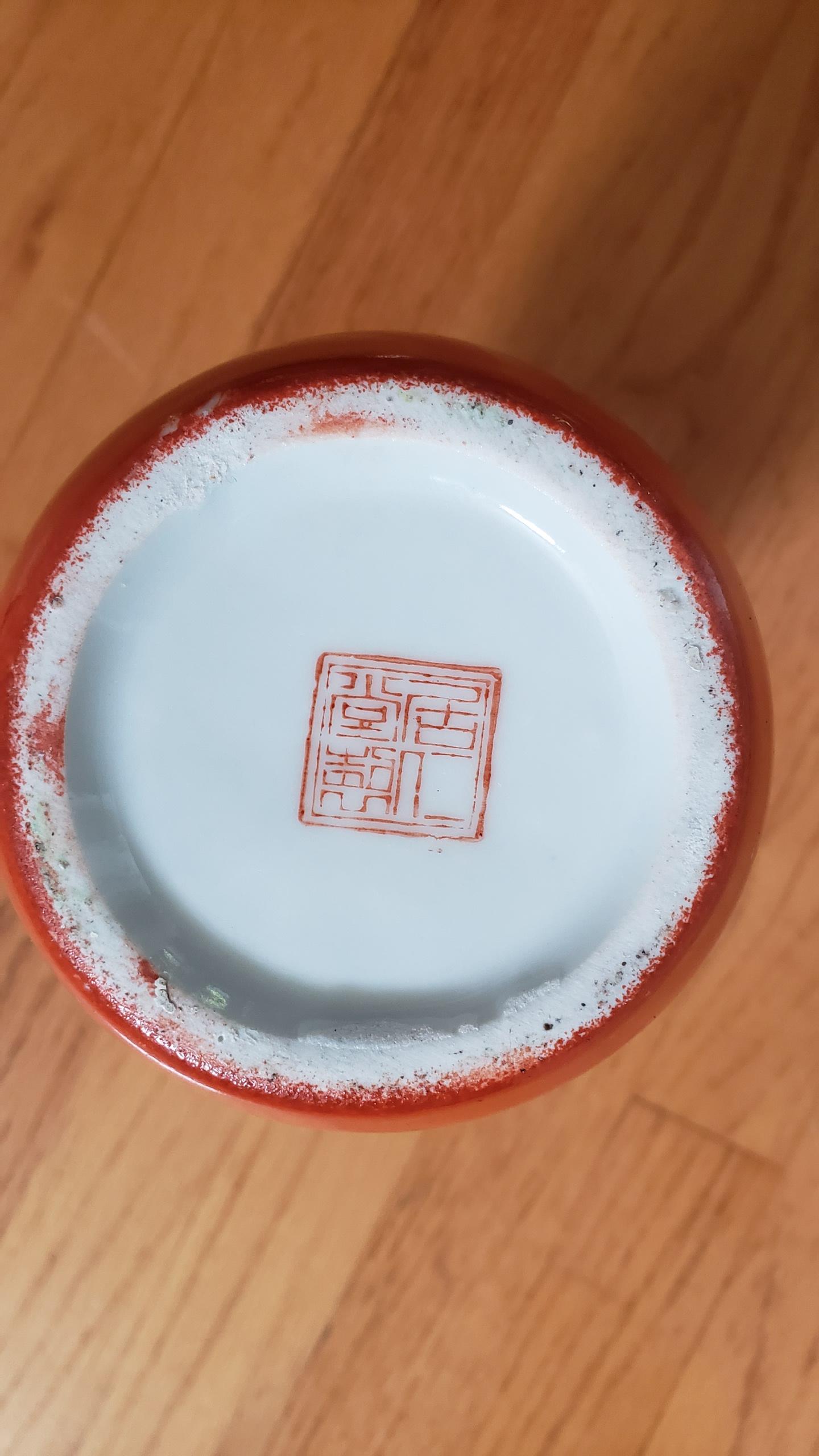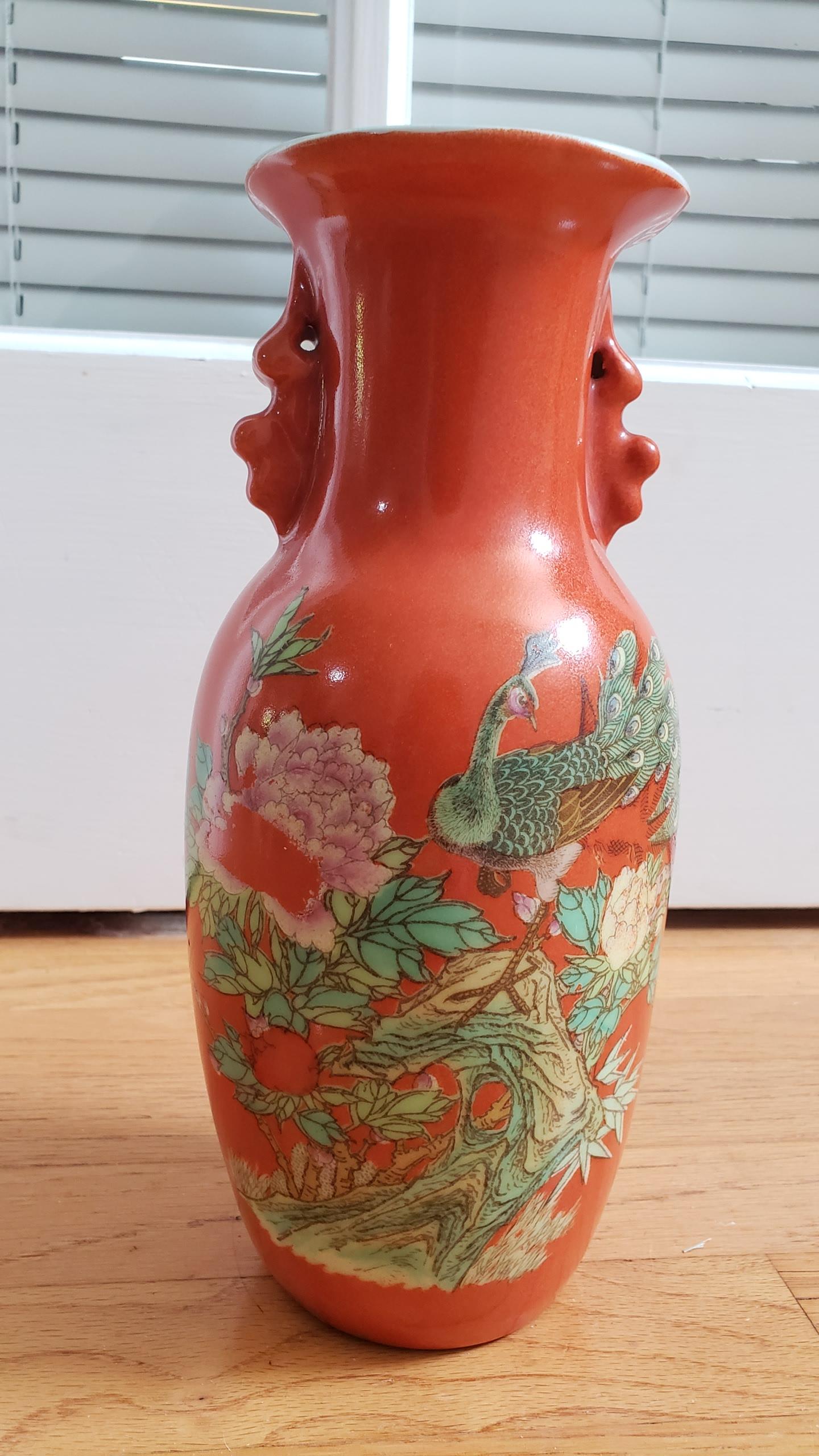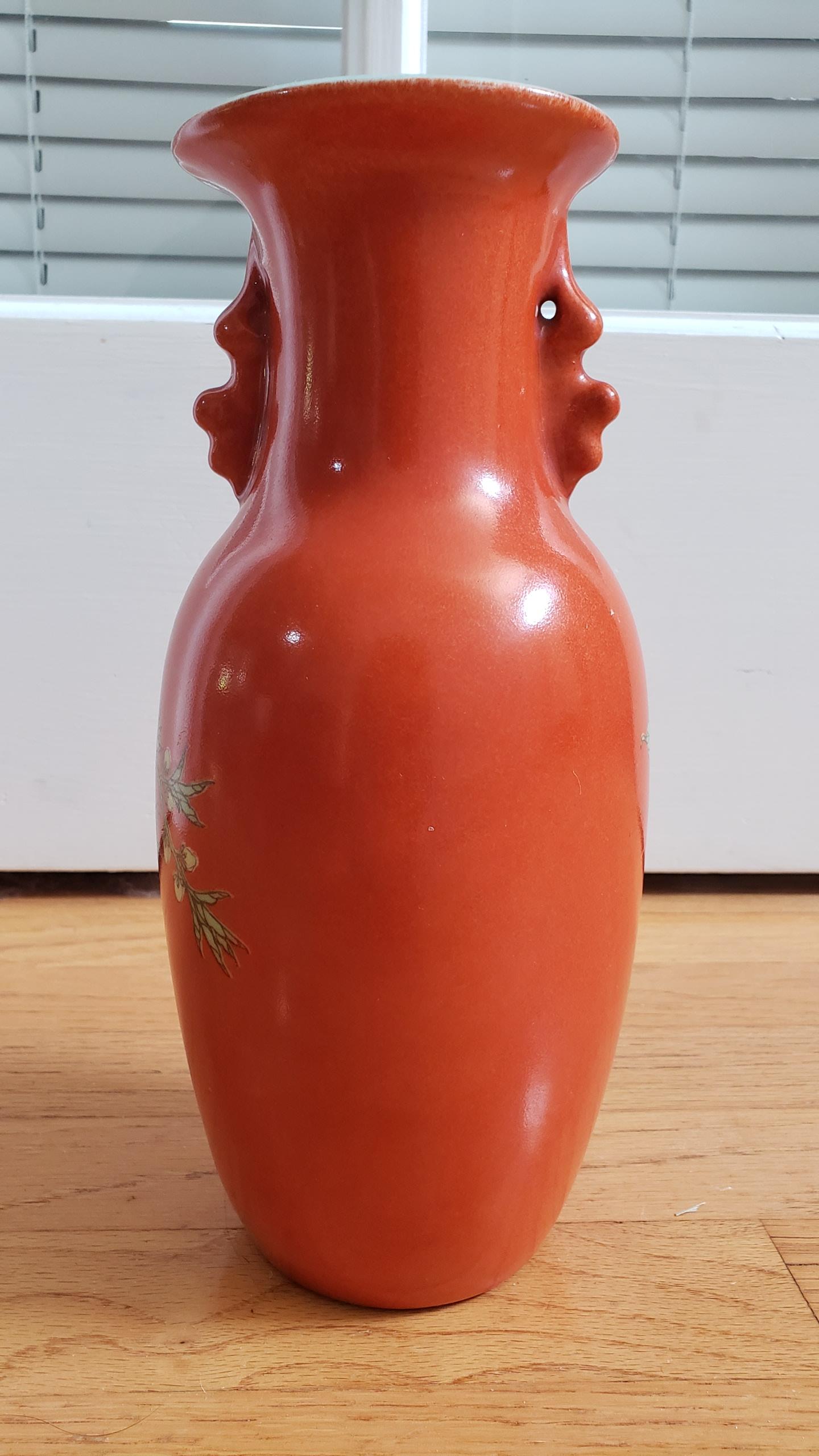 This was a gift to me from a friend who bought it in an antique shop. She usually buys nice gifts, so I have no idea whether this is junk sold deceptively, or if it's a decent piece. I noted that the middle of one of the flowers seems to be gone, but cannot "scrape" away any of the design, so I'm not sure when that happened or if it screams "decal"? I've had this thing for years and would love to know if I have an orange paperweight or something that had/has any value. The design is only on the front and it's about 10" tall and 4.5" at its widest.