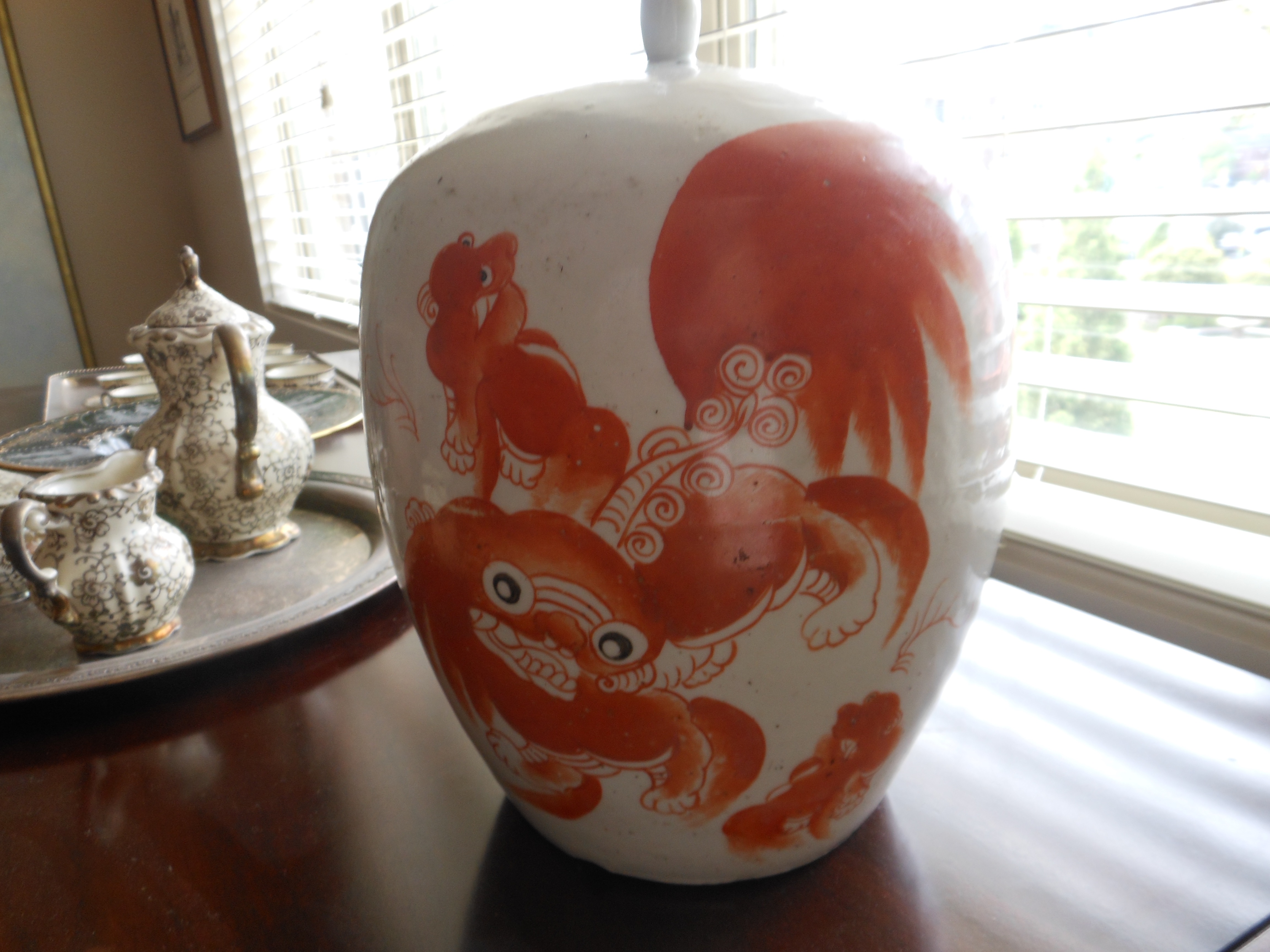 Chinese covered Jar with iron red painted foo dog, late 19/20th Century. Porcelain.