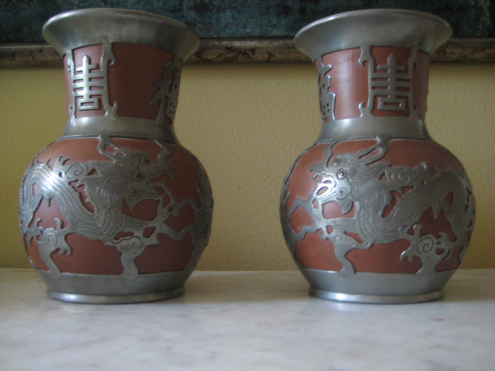 2 Chinese Vases, brown ceramic and pewter. The pewter is made with dragon designs.  150mm high.  The manufacturer is Hsin Ho Cheng Whieaiwe. Excellent condition. Bought them at a car boot sale for €8.00.