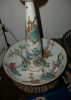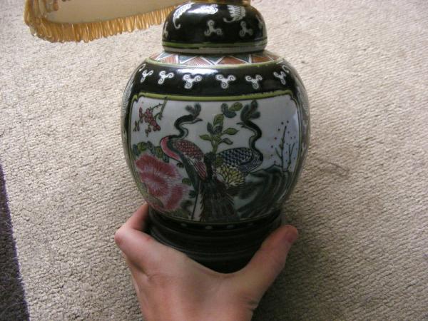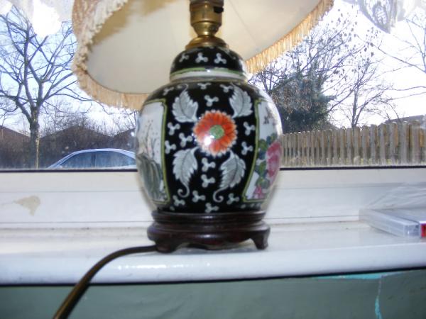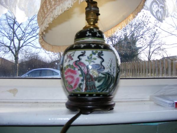 it seems to be a jar of sorts that has been turned into a lamp.it has a lid on the top.it has a wooden base that it stands on.it comes with a lamp shade but am unsure if it is the original lamp shade.the lamp does work.