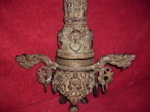 Inherited piece, moderate patina coverage. 3 footed base, double dragon head handles. ringed.