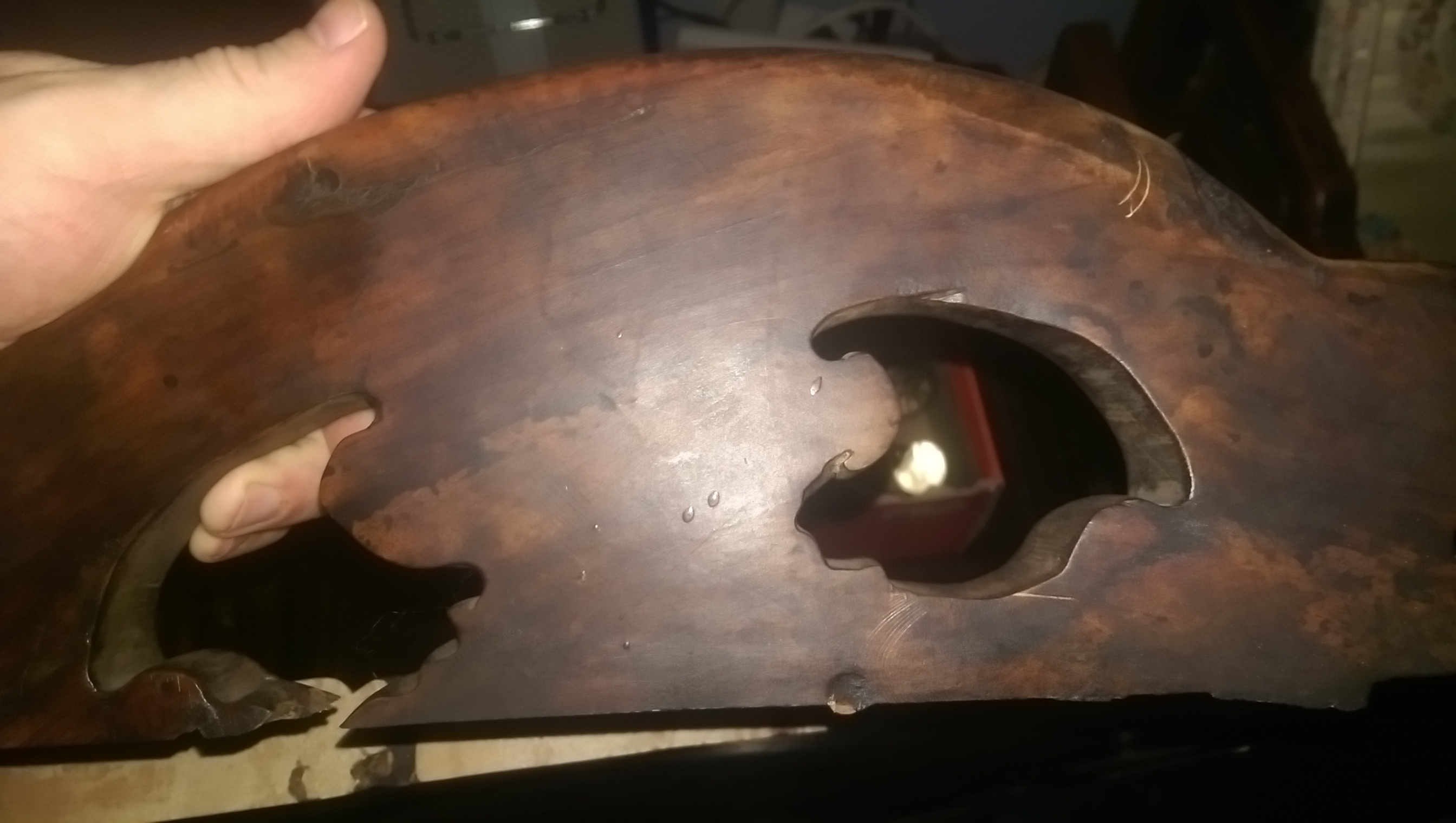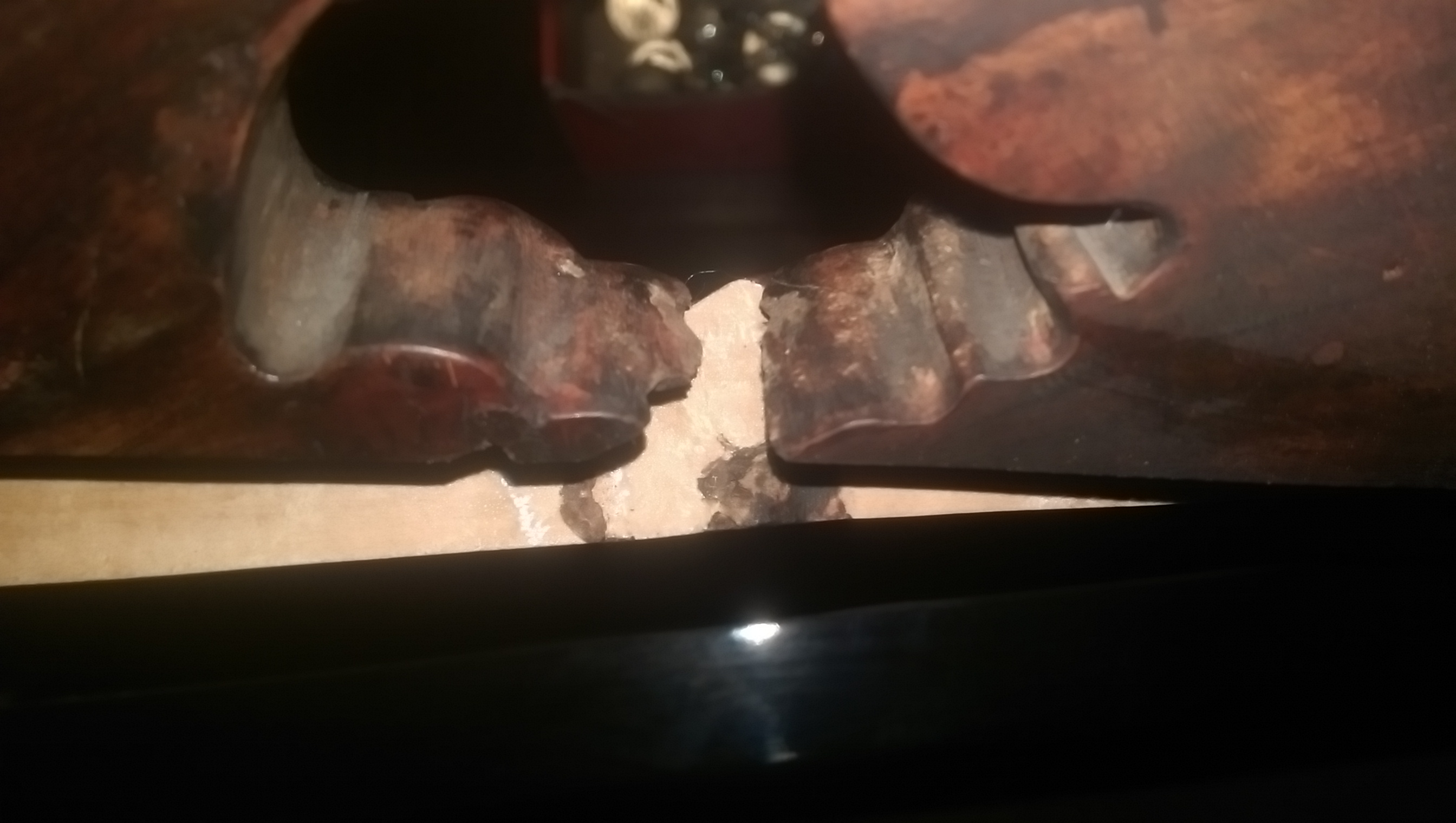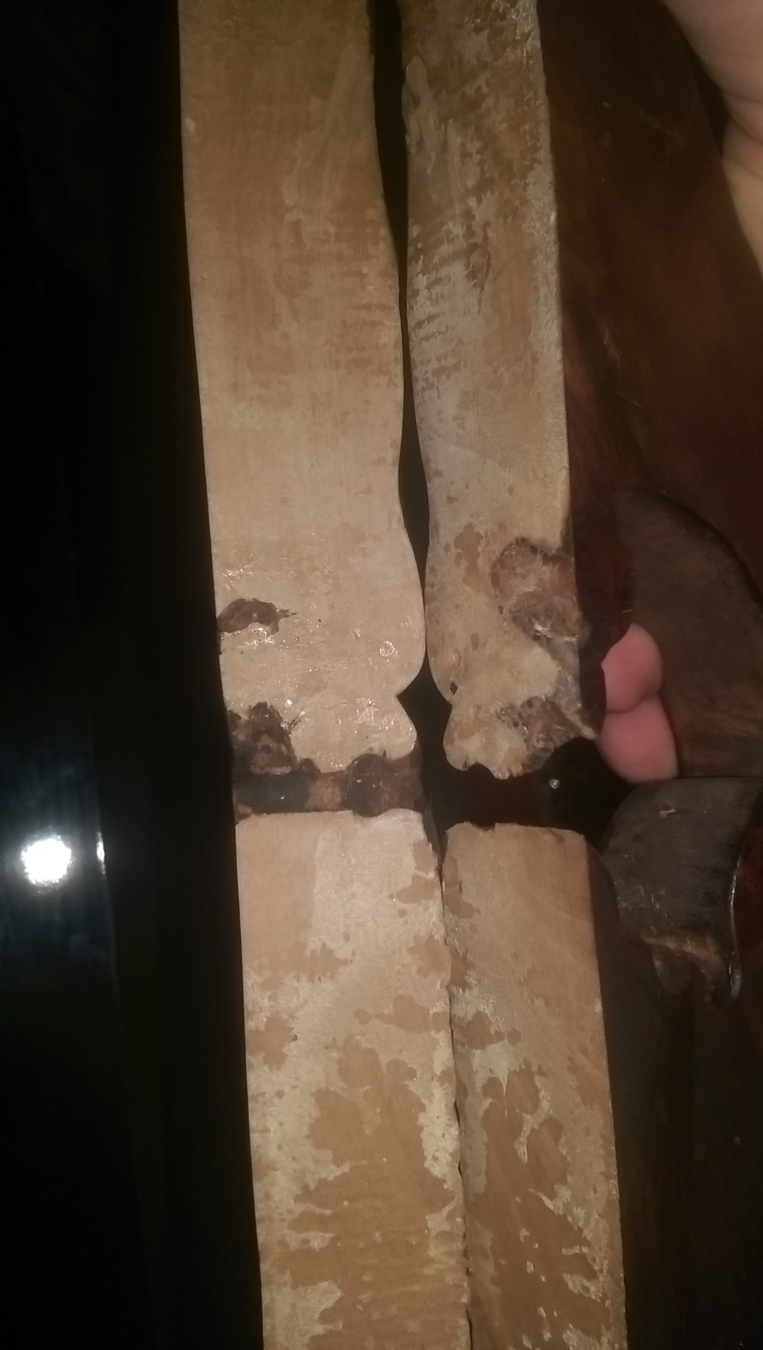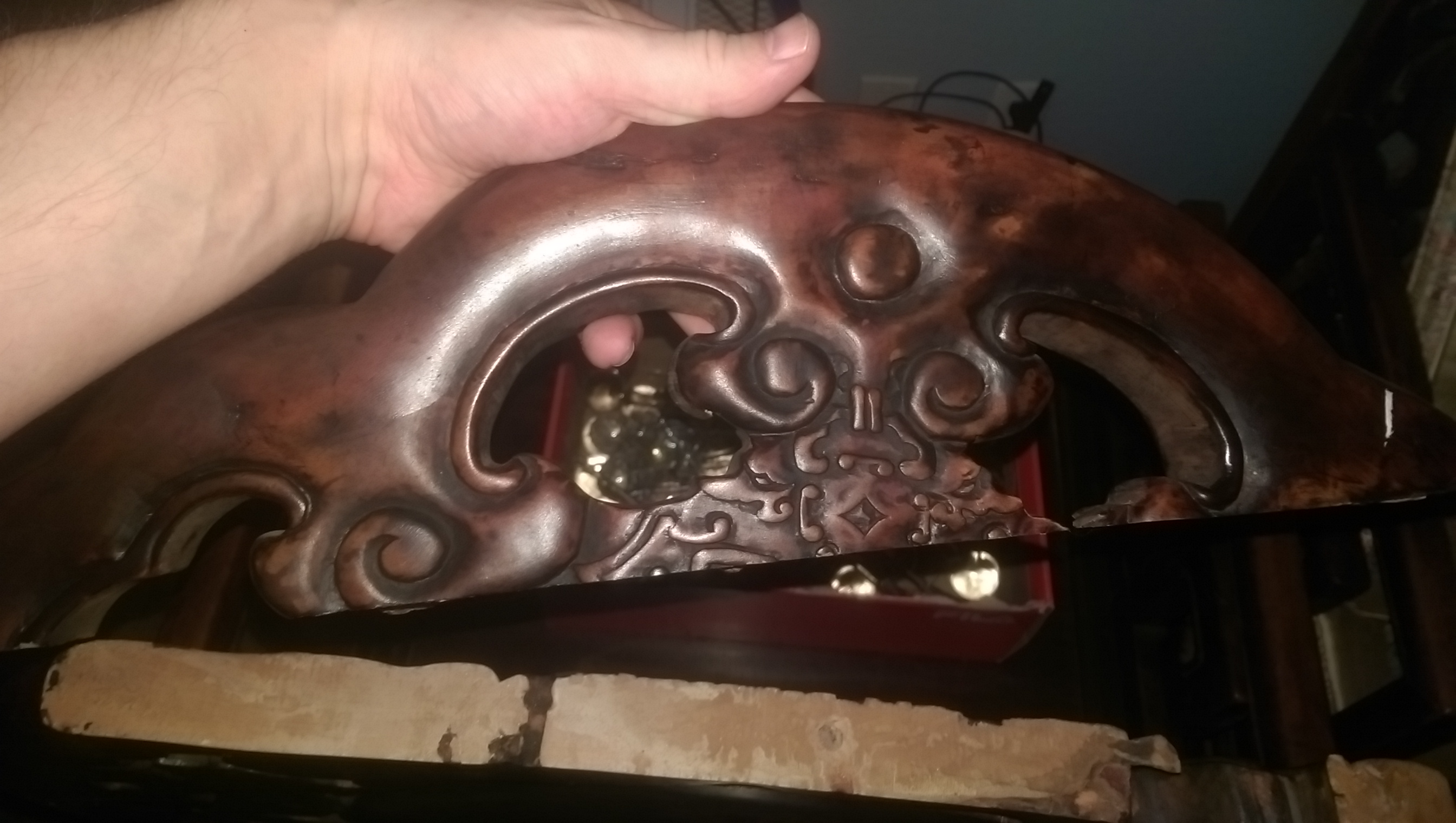One of the chair backs broke in a solid line along an area where there appeared to have been knot holes and other definciencies in the wood and it appears the piece was wood glued back on. I tool careful photos of the area showing the wood holes and knots and their line-up with the break. When I first saw it I was concened it was synthetic, but with the wood grain throughout and wood knots, etc, I am thinking it is at least natural wood and jade-like substance.