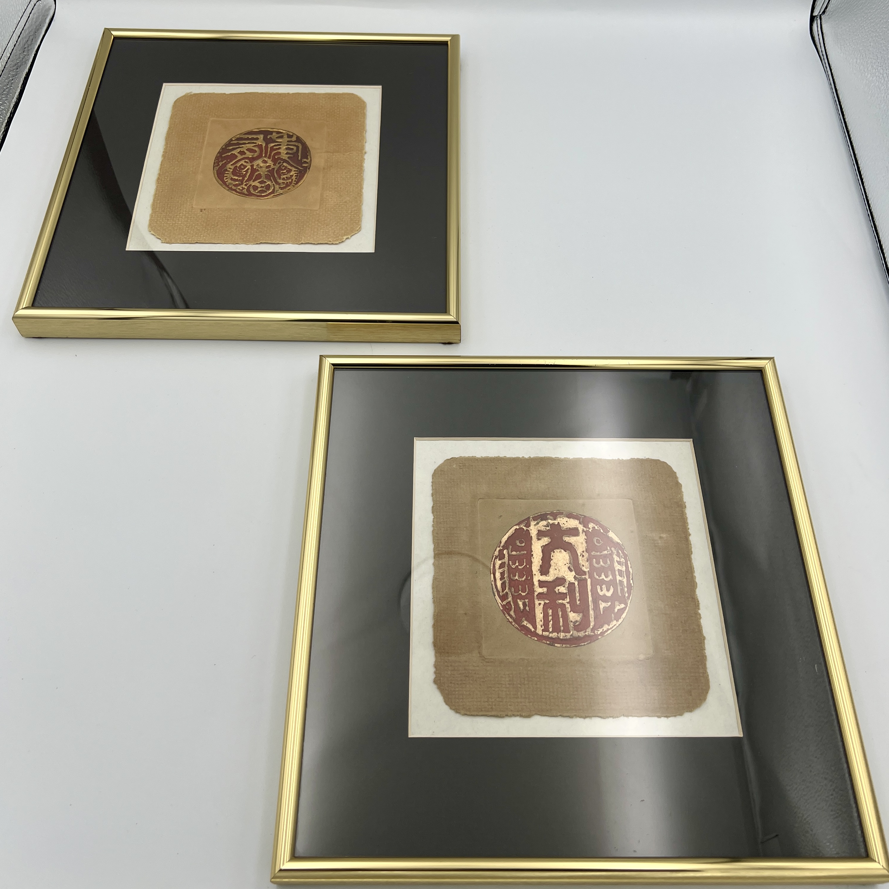 Set of two Framed Chinese red and gold Yin wall art on textured paper.
