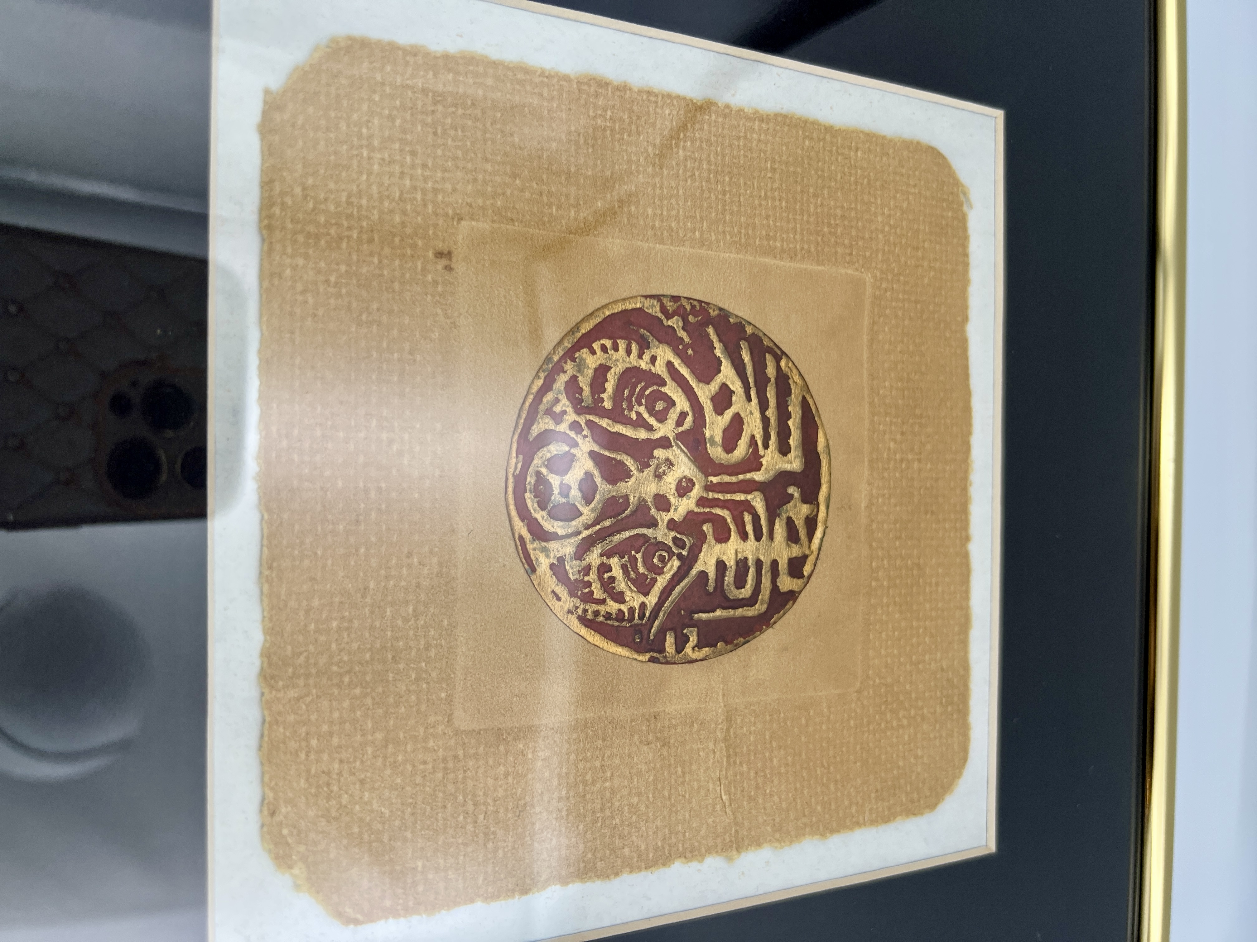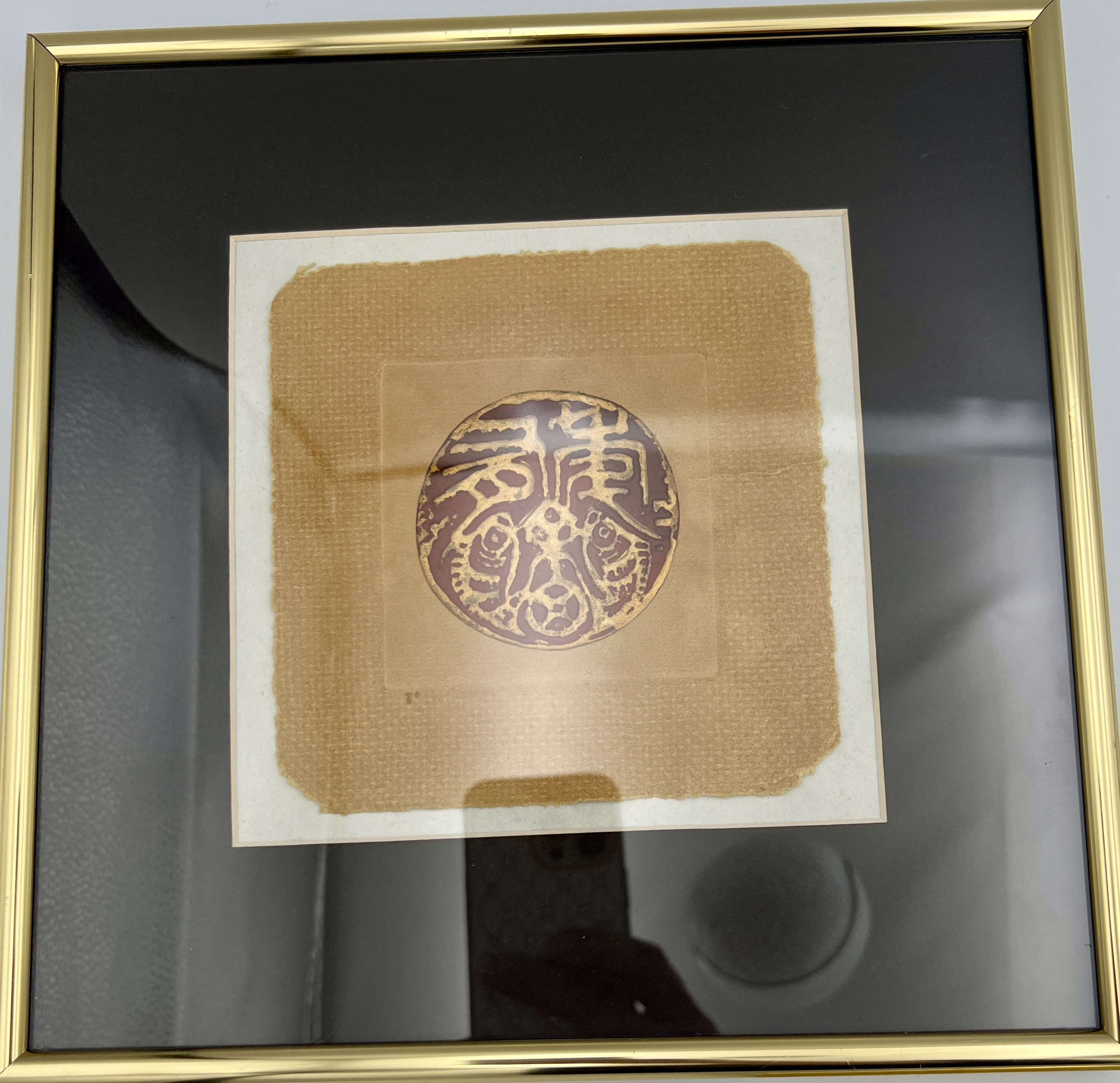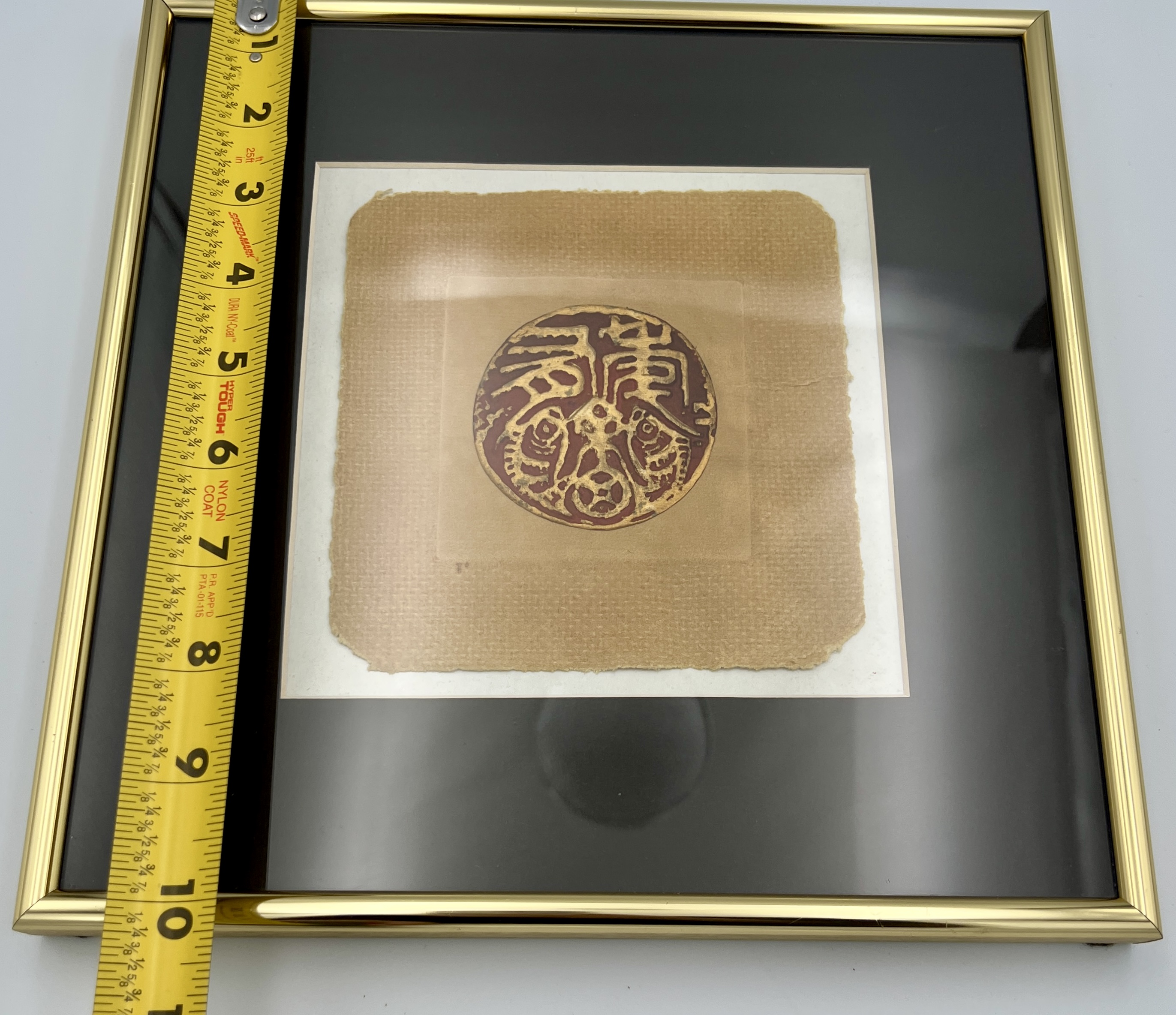 This set consists of two framed pieces of wall art, featuring intricate red and gold Yin symbols on highly textured paper. The artwork is embossed with Yim markings that add depth and character to the pieces.