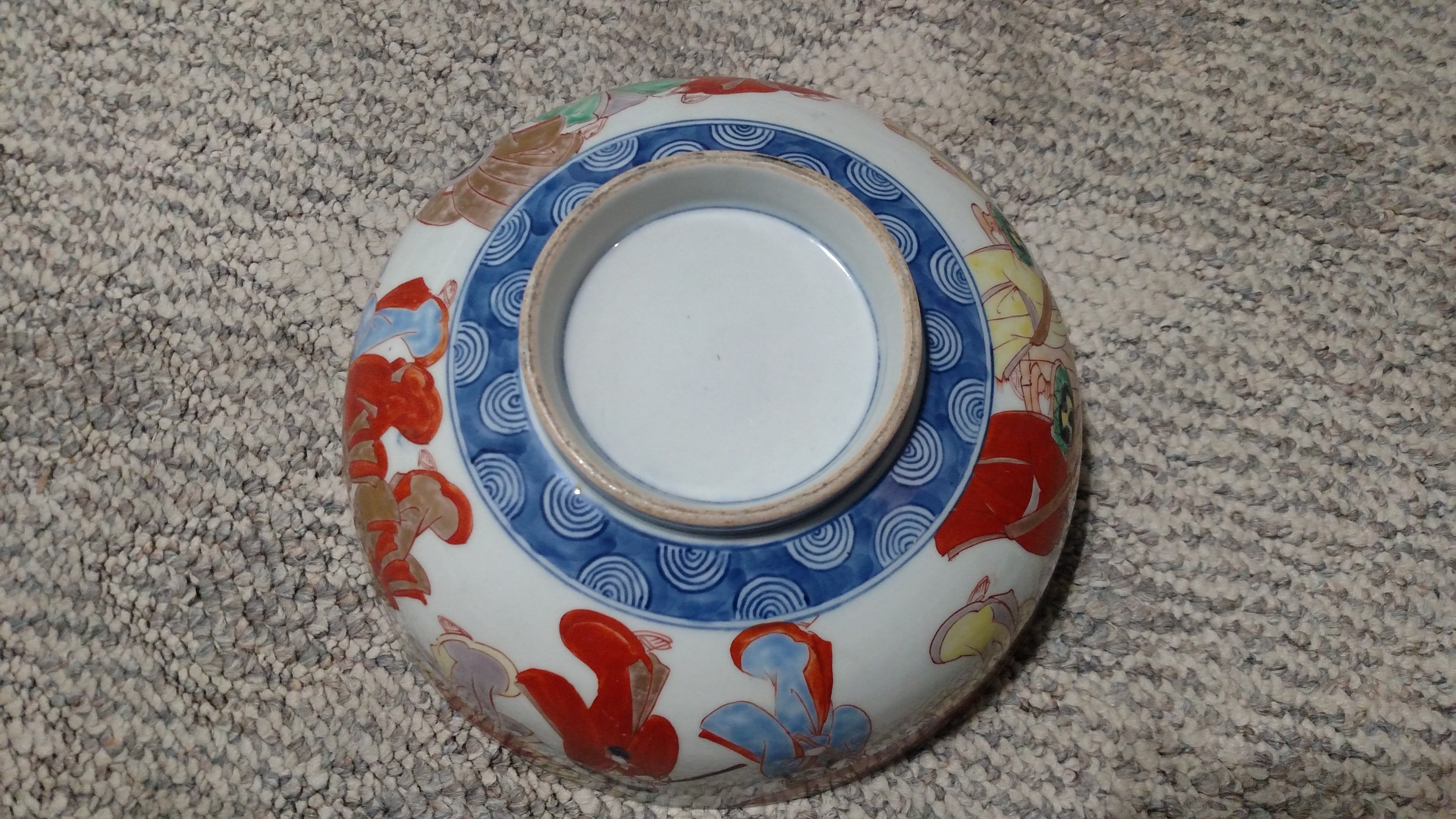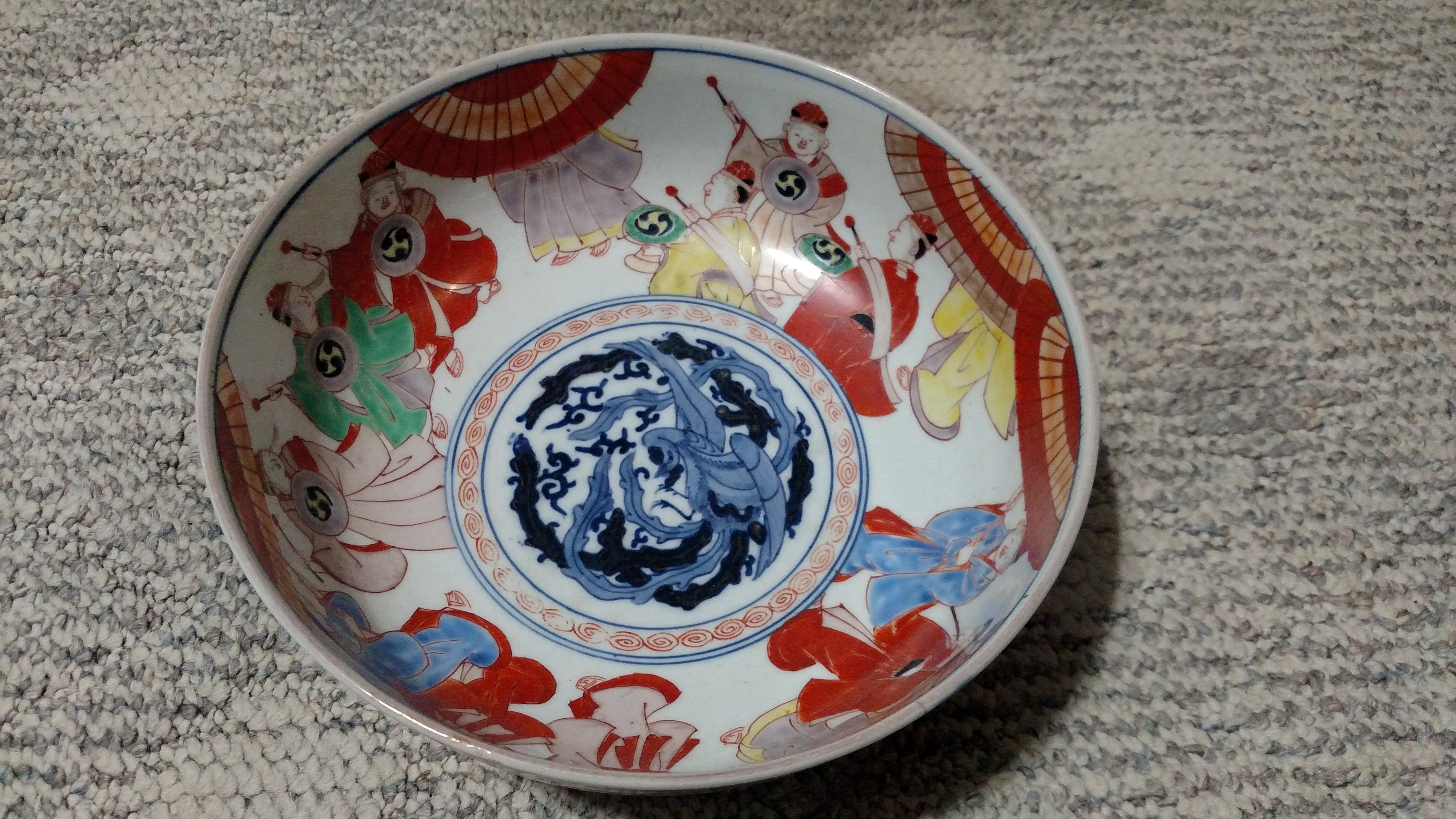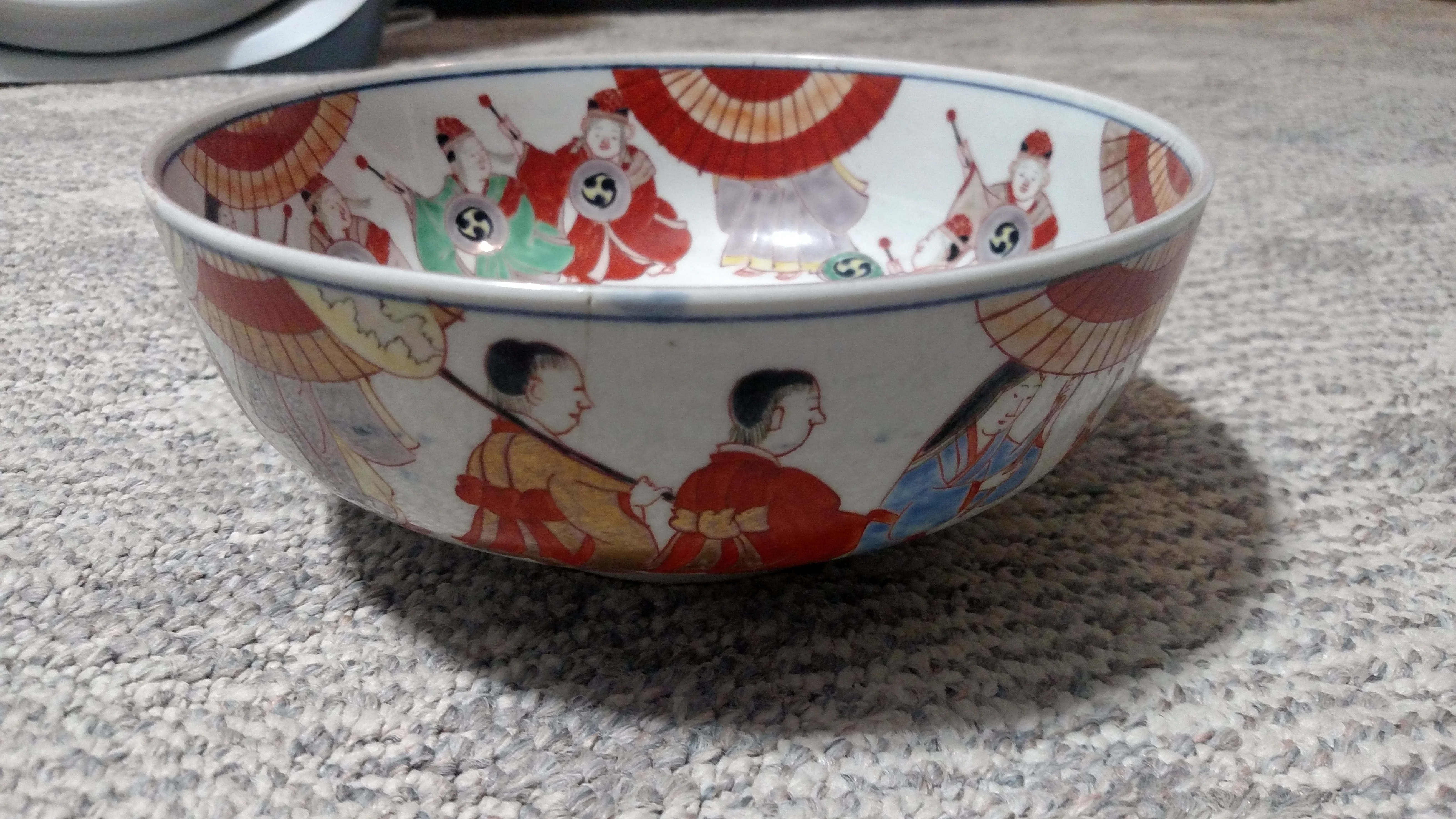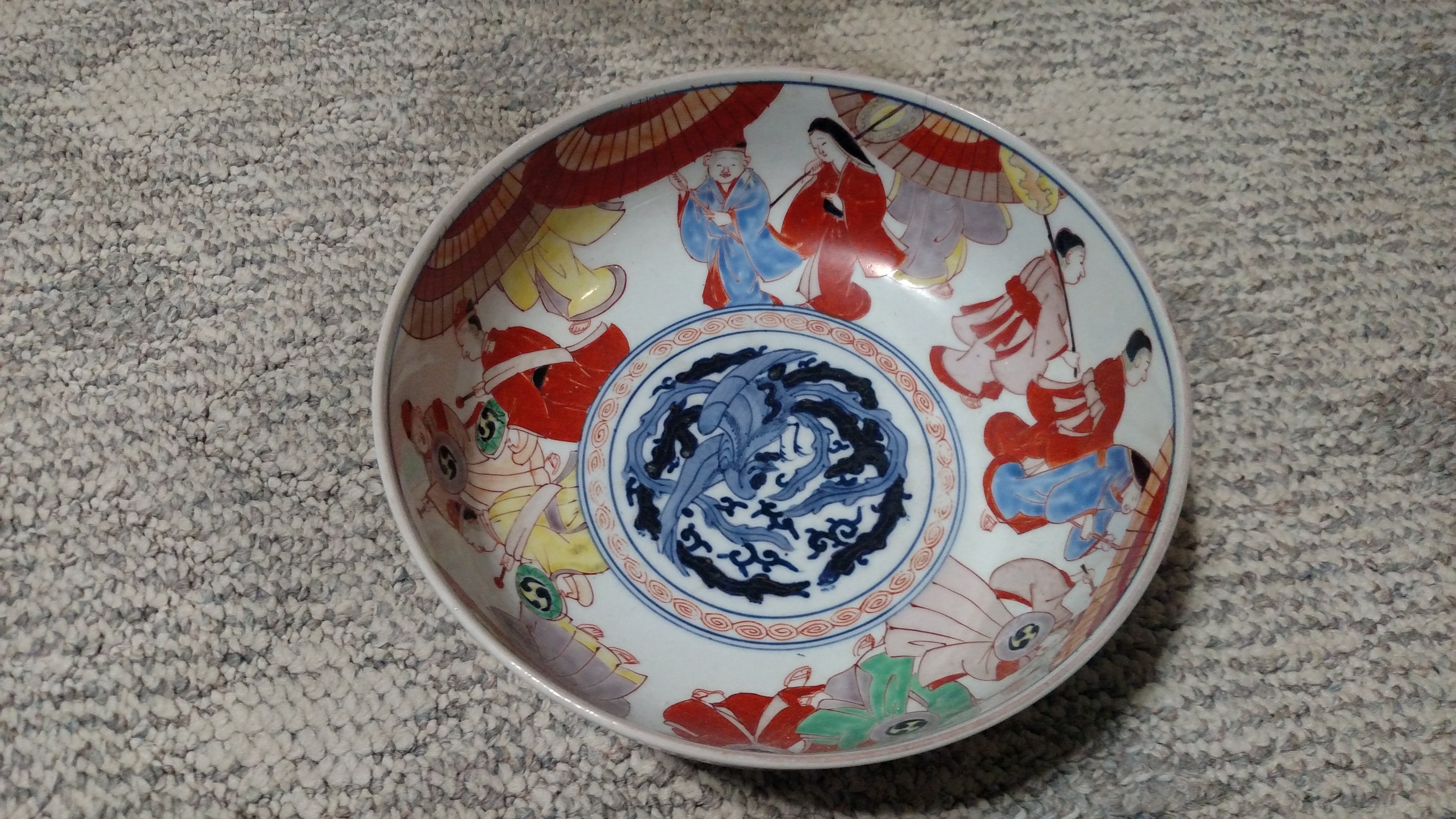 9.5" Diameter bowl with painted interior/exterior, Eastern (Japanese/Chinese/Korean) figures, Phoenix(?)/Bird on bottom