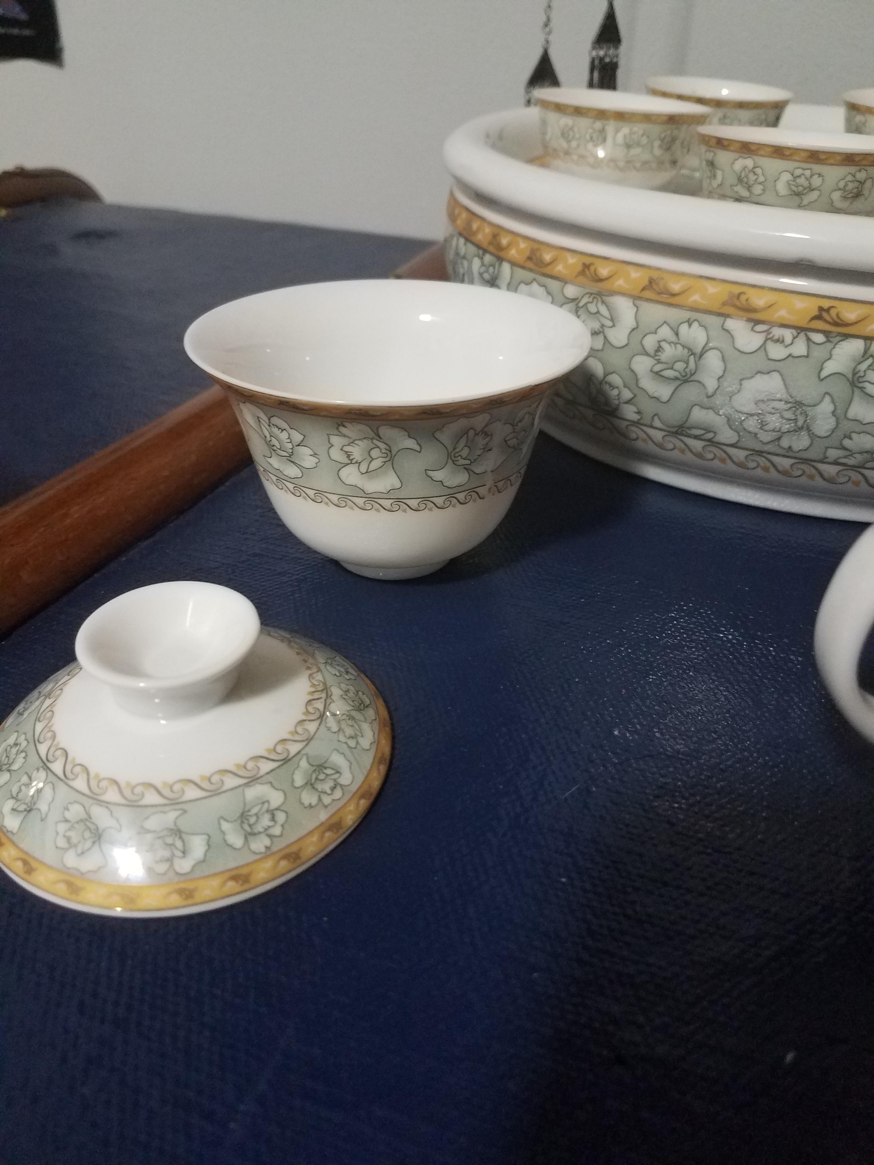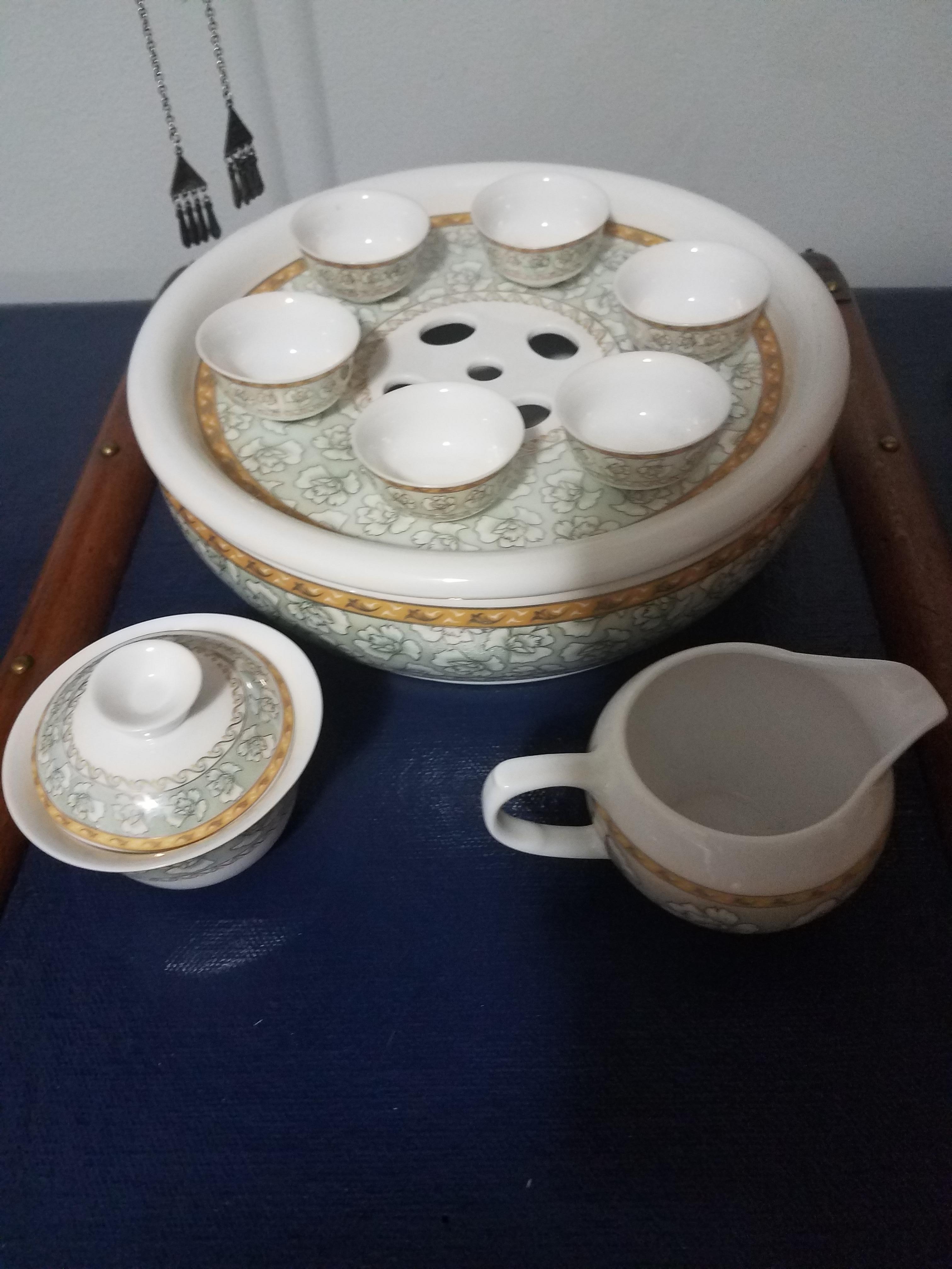 Got this set from a second hand shop. Floral green design with some gold coloring. One of the little tea cups and the sugar container have the markings on them. Pretty sure they arent old as they are printed not painted on. Theres 6 cups, the stand has holes in the middle and the lid comes off. Also has a sugar and cream container. I dont know much about it, im only gurssing its a tea set. Any info would be greatly appreciated