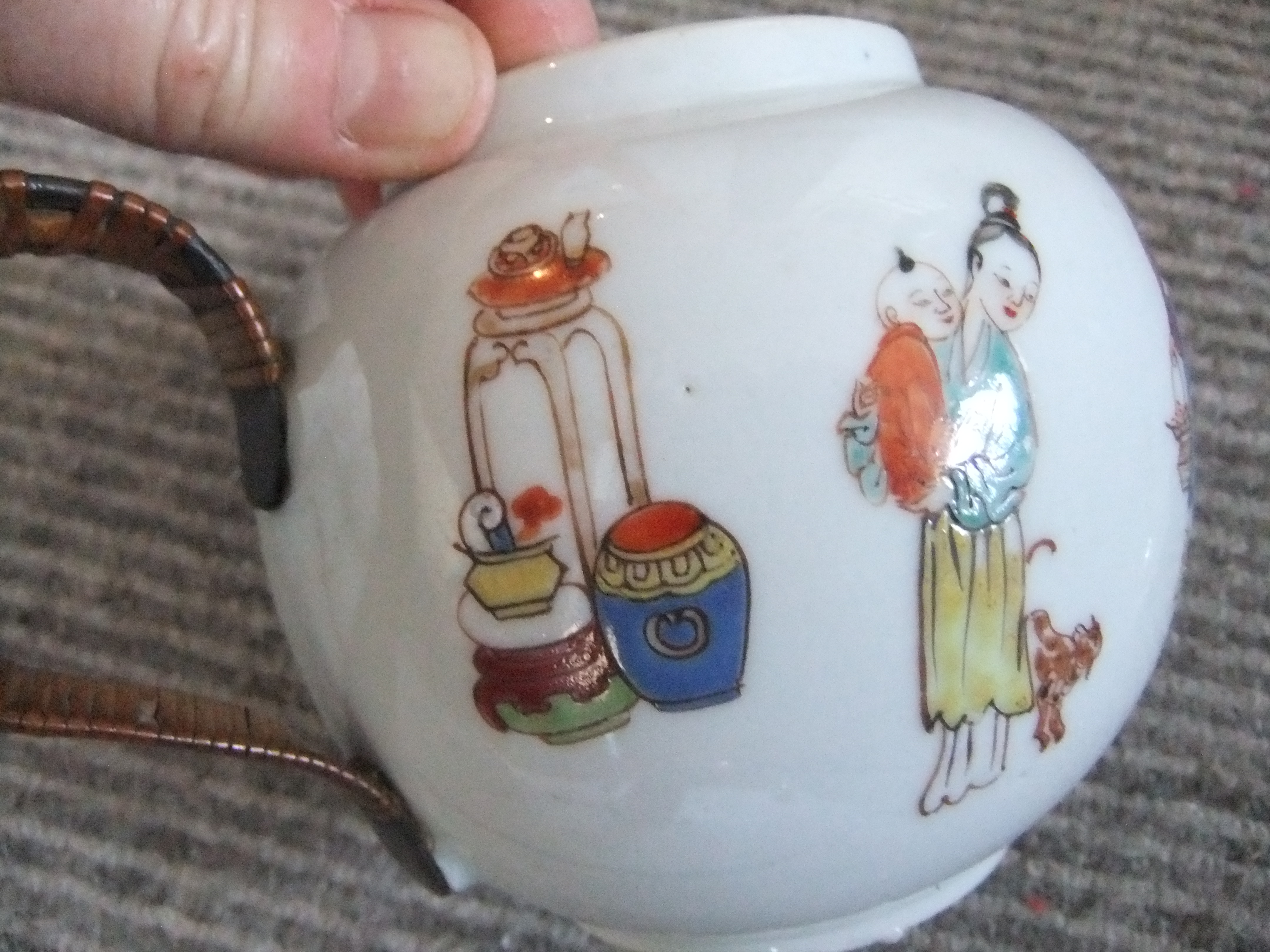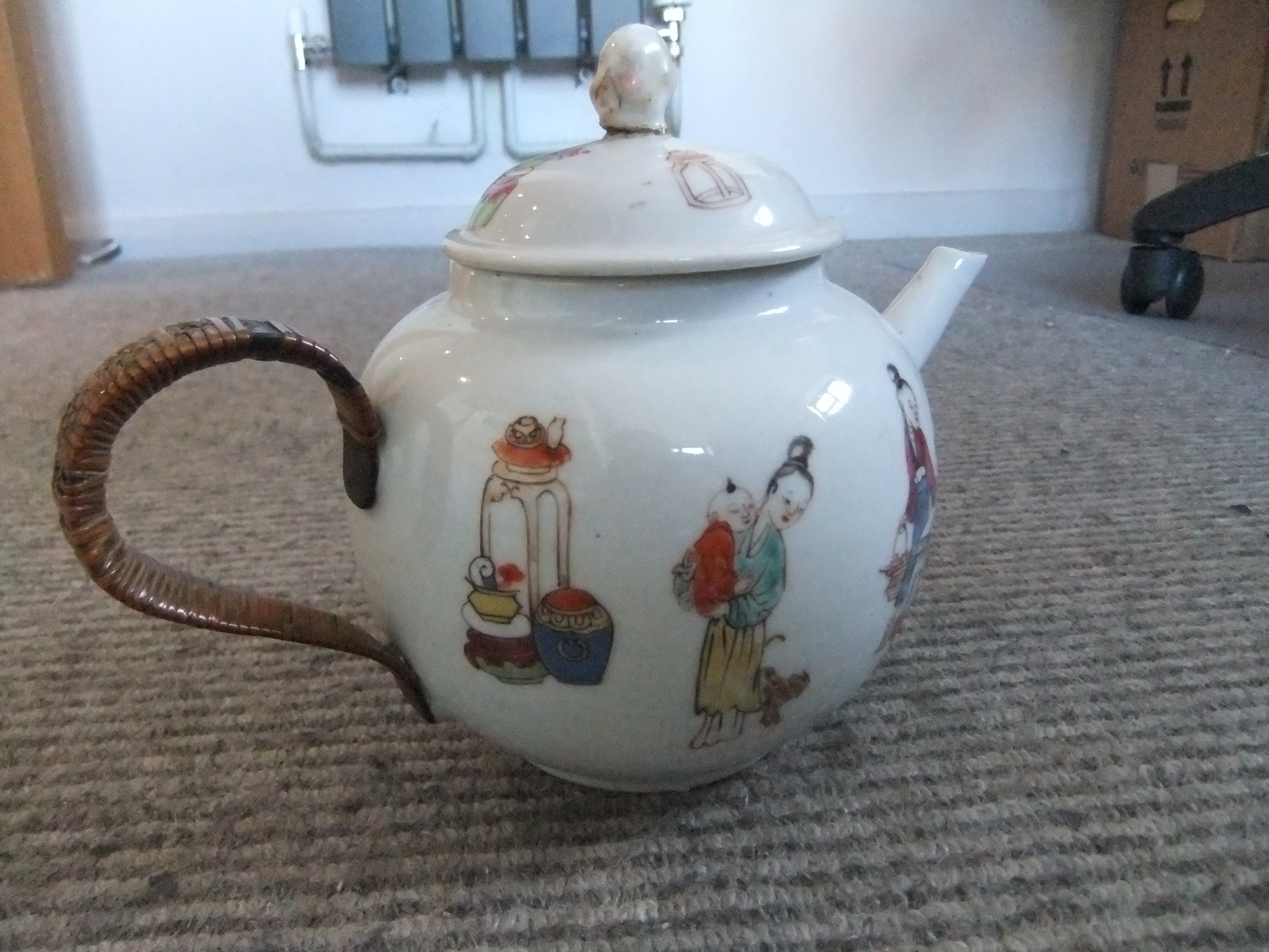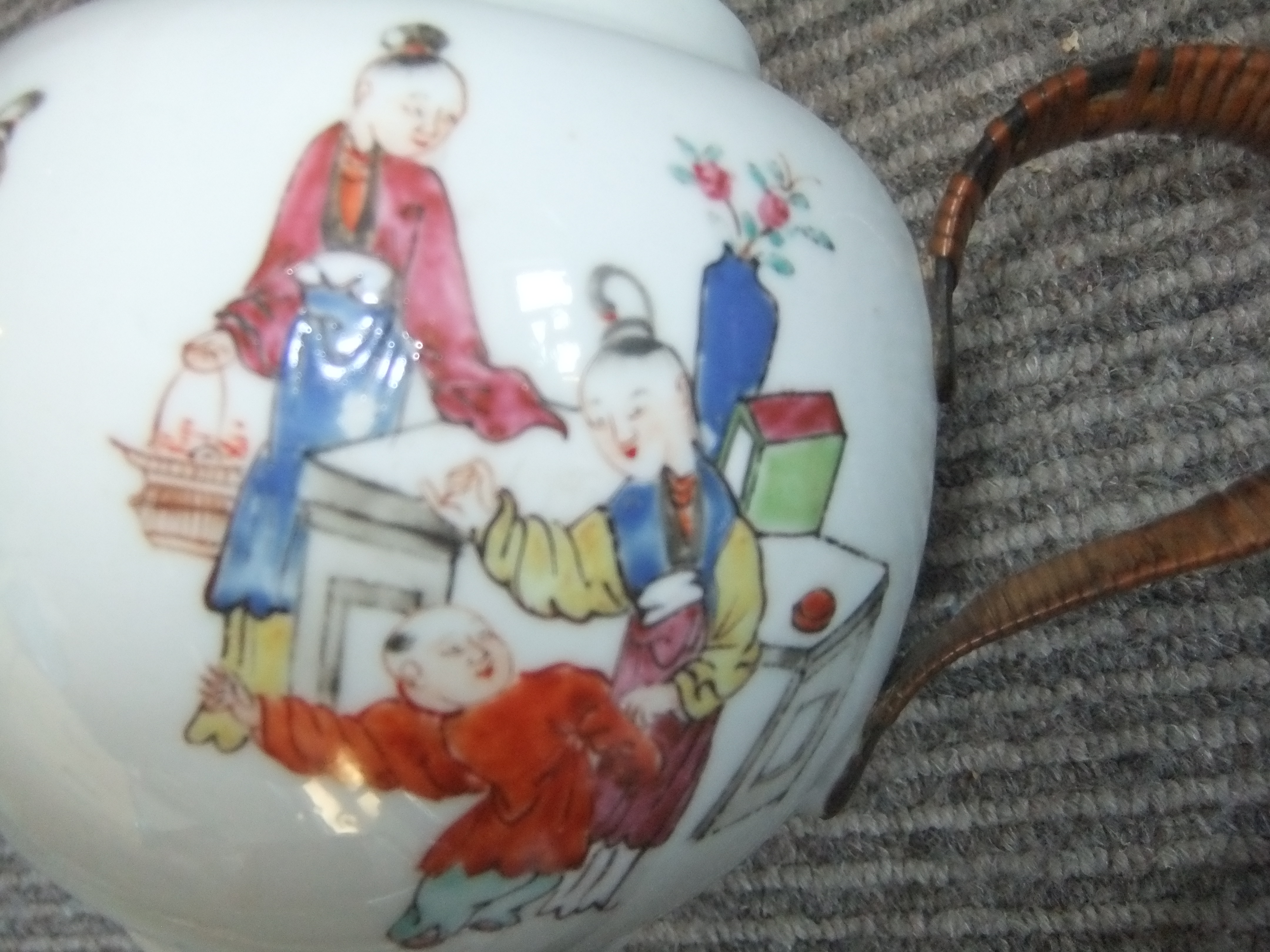 Teapot standing 14cm High with family, domestic figures painted on it. The handle is fixed onto the rear of the teapot and is metal covered in bamboo. The Lid has a mans head on it to lift it off. The spout is very straight measuring 6 cm and there is no inscription on the base