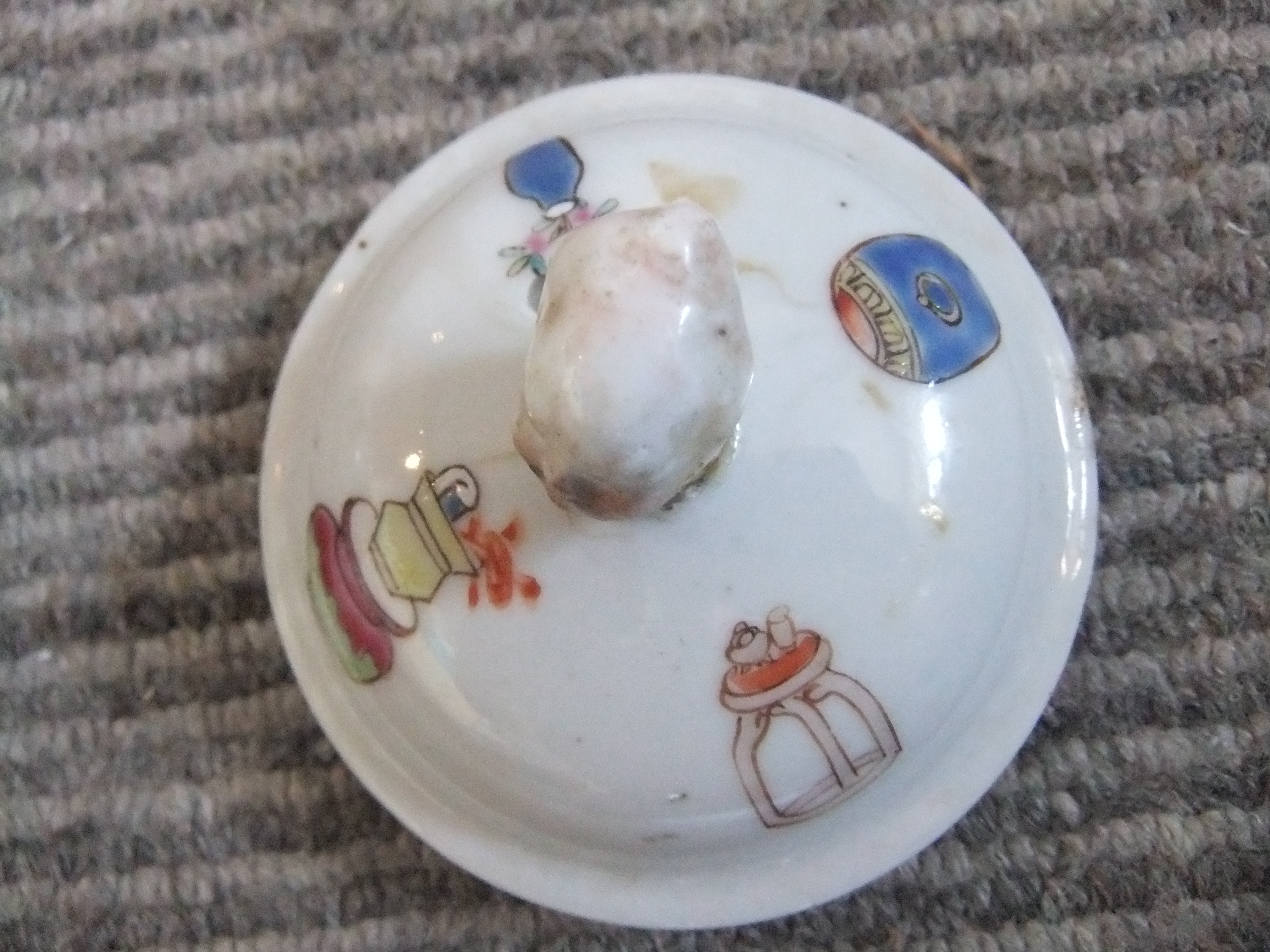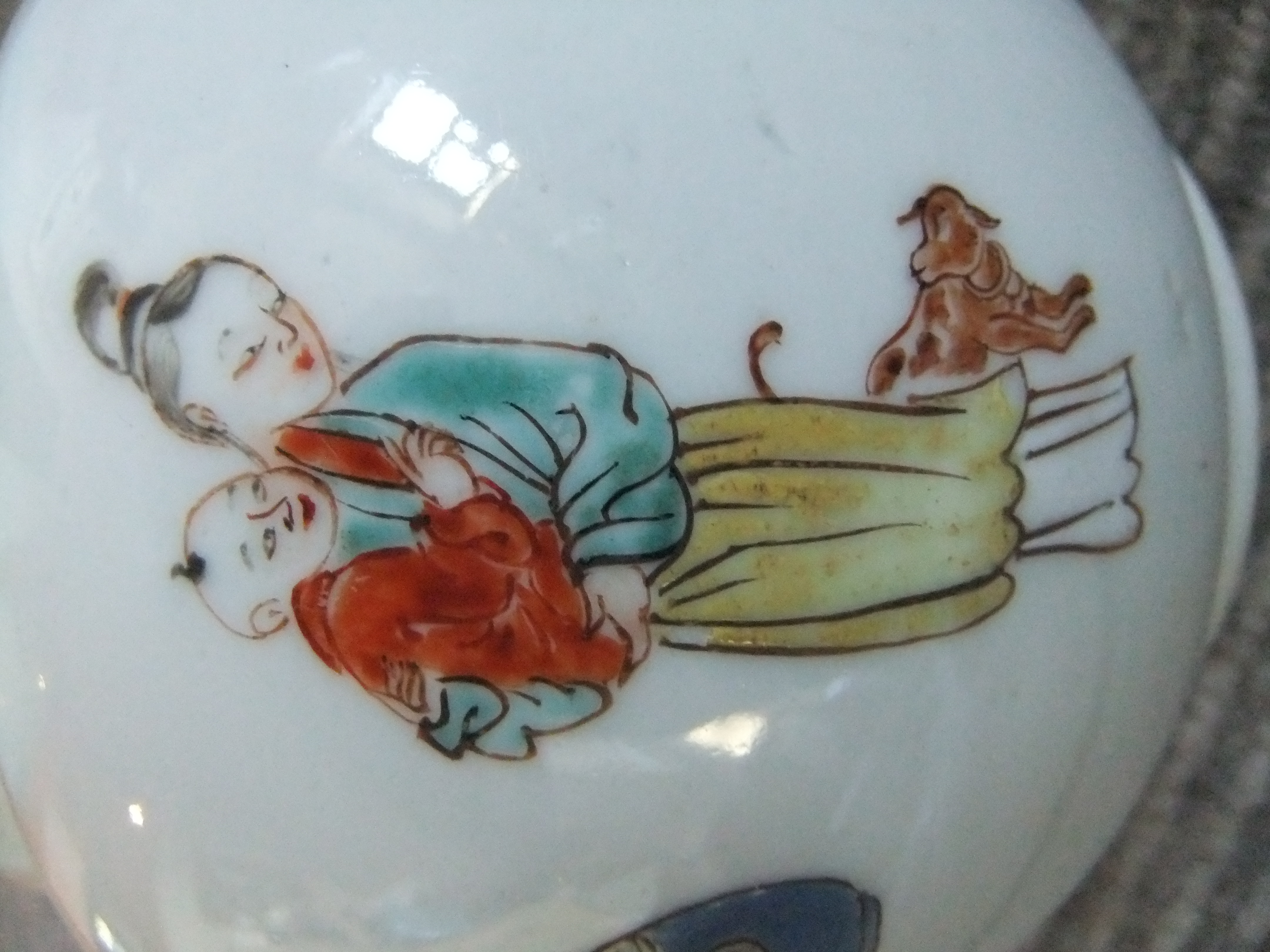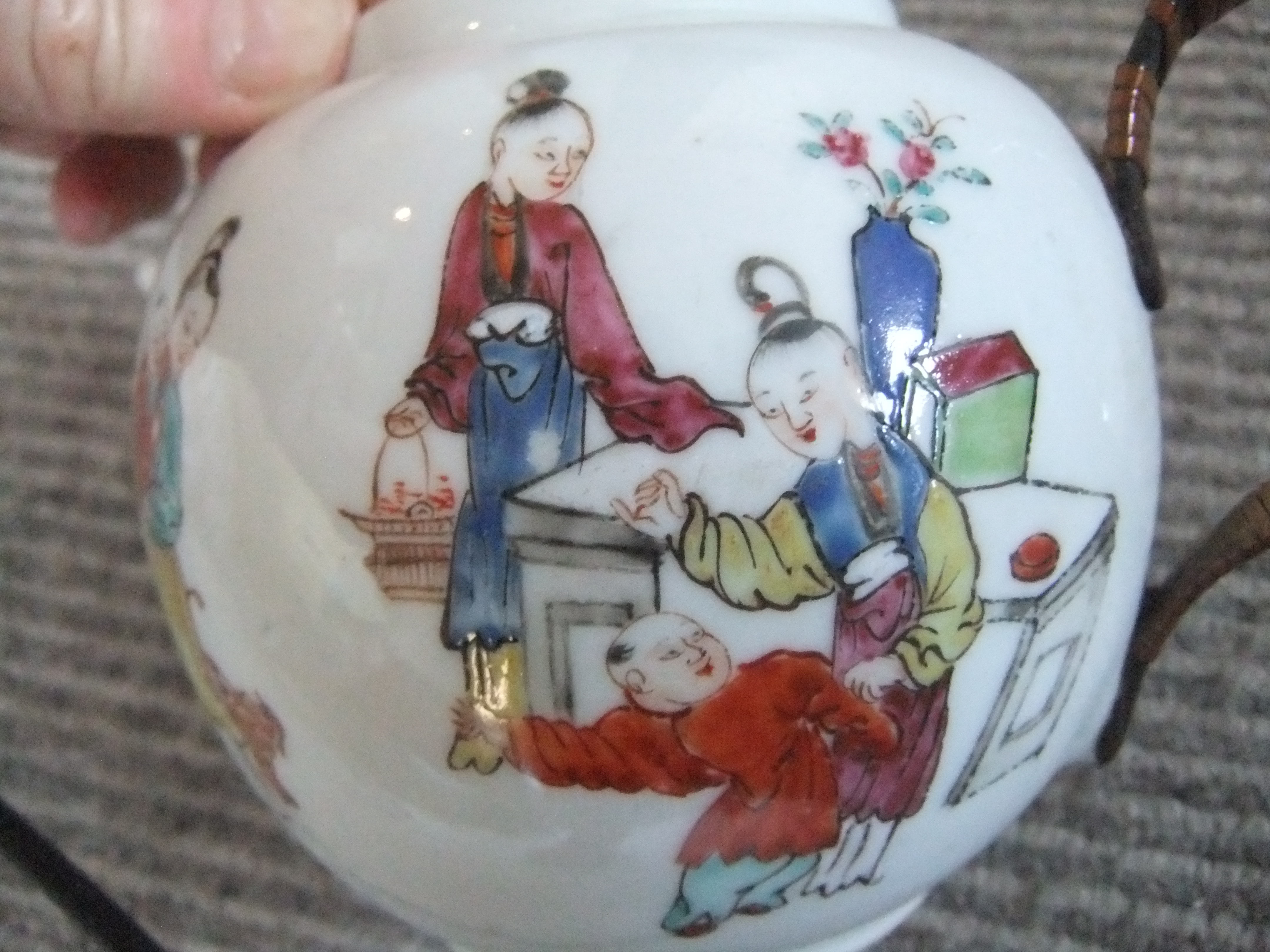 Teapot standing 14cm High with family, domestic figures painted on it. The handle is fixed onto the rear of the teapot and is metal covered in bamboo. The Lid has a mans head on it to lift it off. The spout is very straight measuring 6 cm and there is no inscription on the base