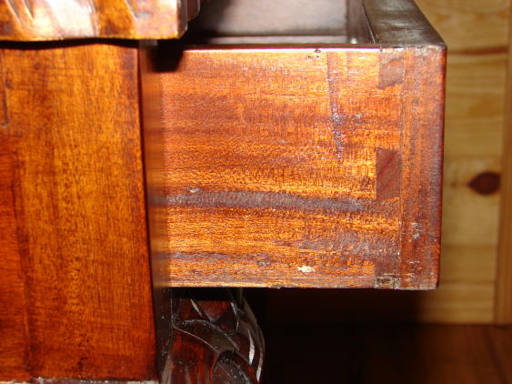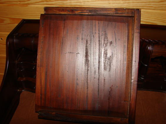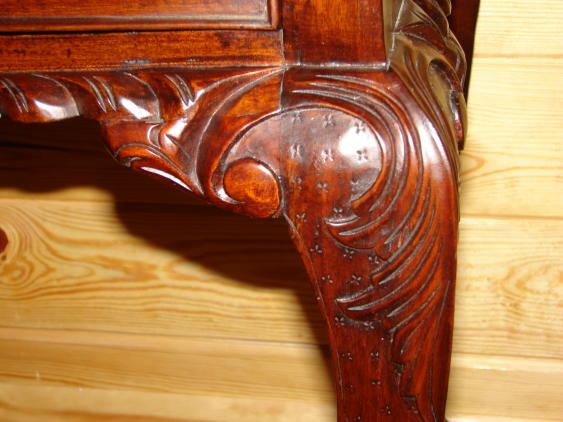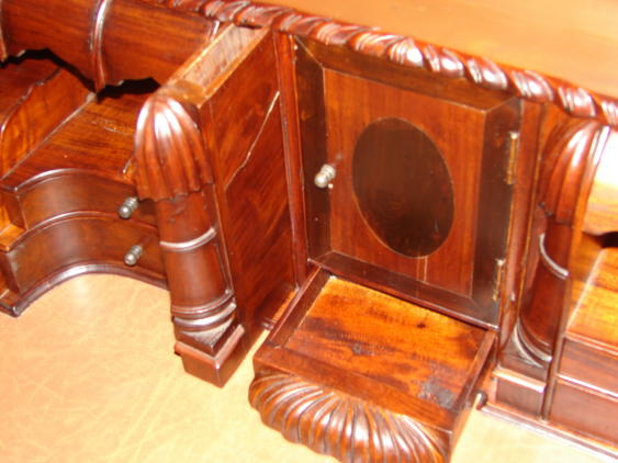 This desk has 19 drawers including 7 "hidden drawers". Two are drawers hidden behind other drawers as false backs. It has an inlaid leather top and cabriole legs with ball and claw feet. It looks like it has been refinished sometime in the past by a nonprofessional. It has a small door in the center front. The top is not attached to the base, it just sits on top. The drawer bottoms are made of solid wood that looks as though it was tapered by a hand plane. The entire piece looks hand made to me, except maybe the dovetails. My main question is, is it really old or a copy of something really old?