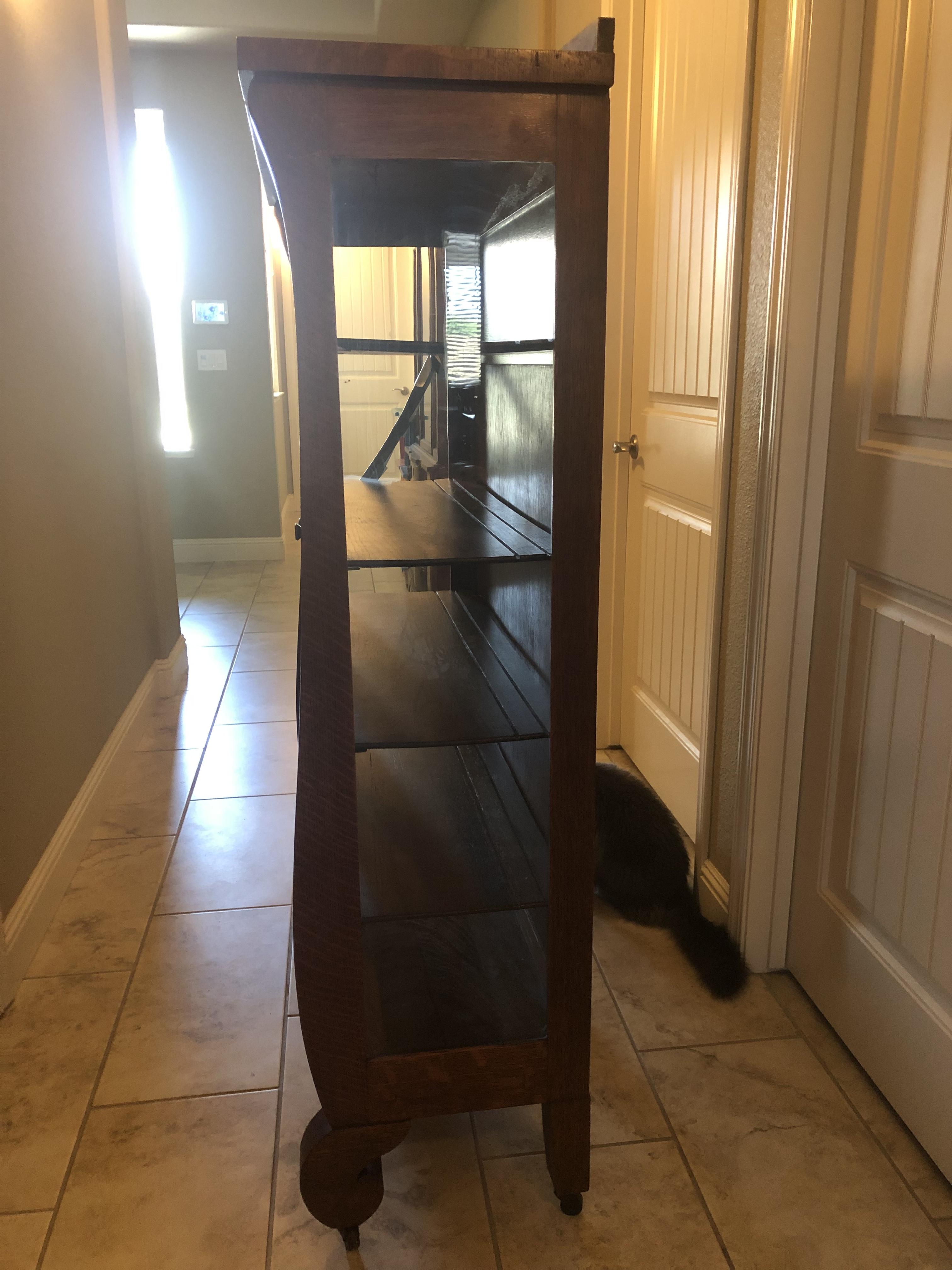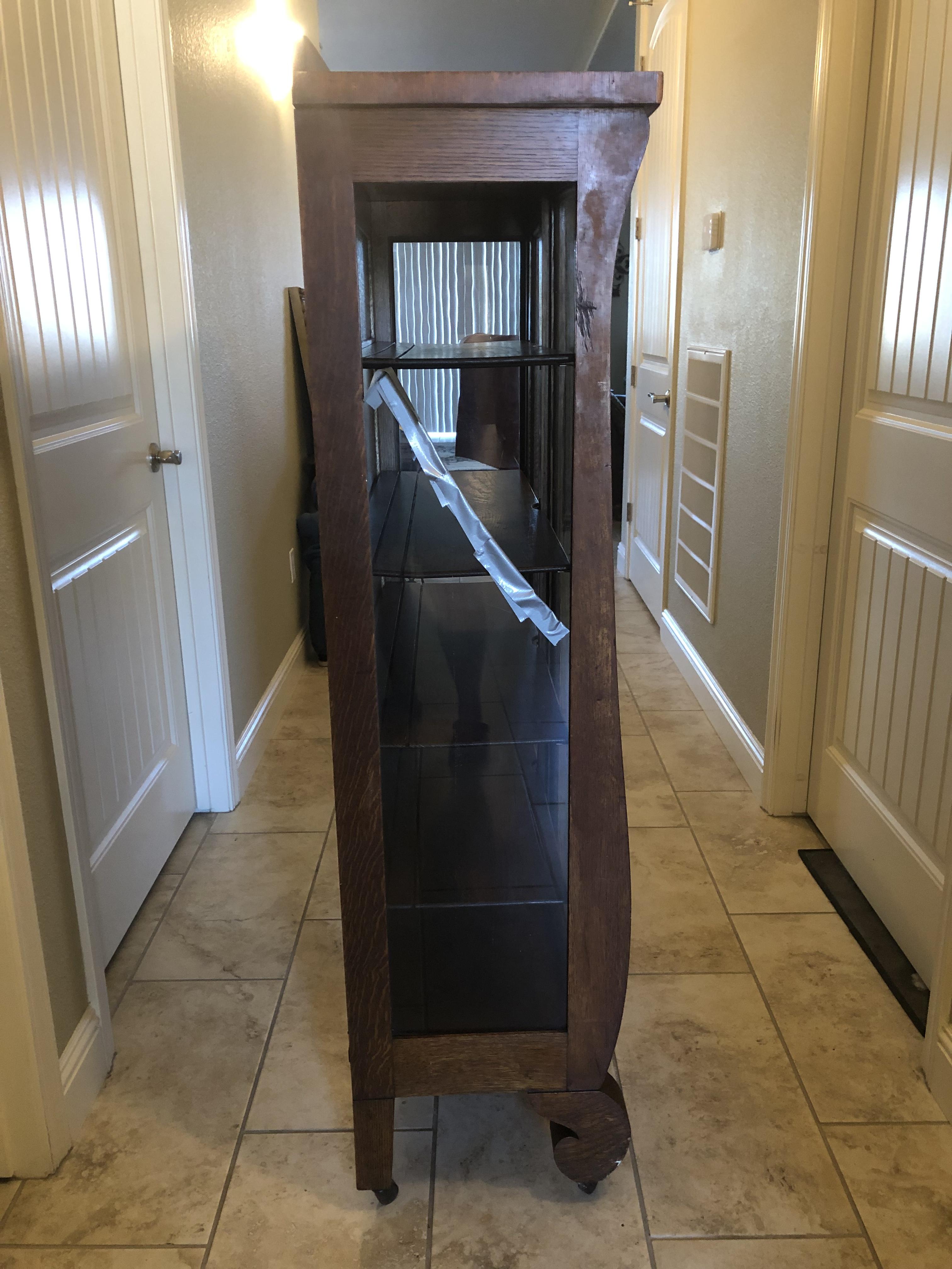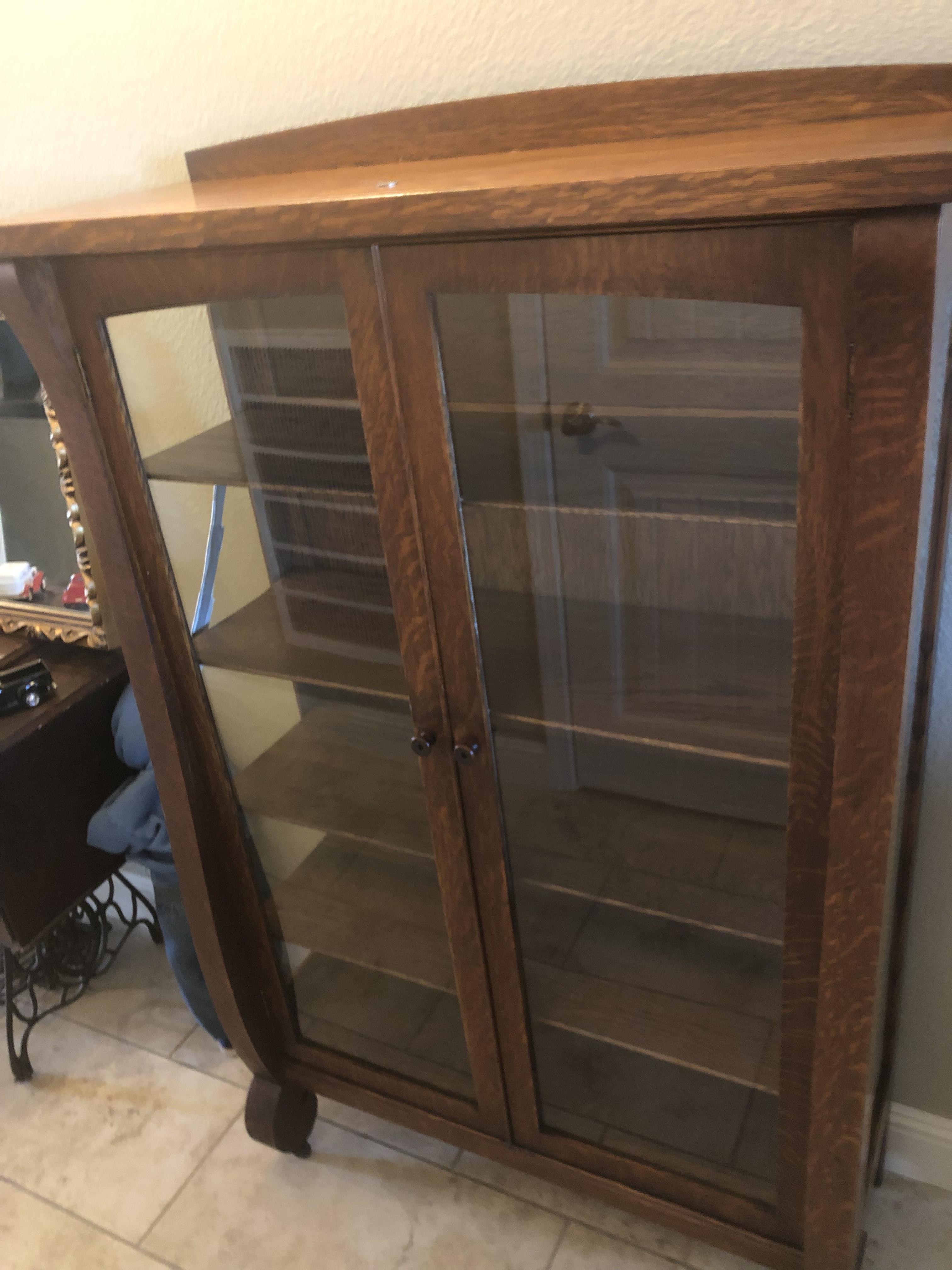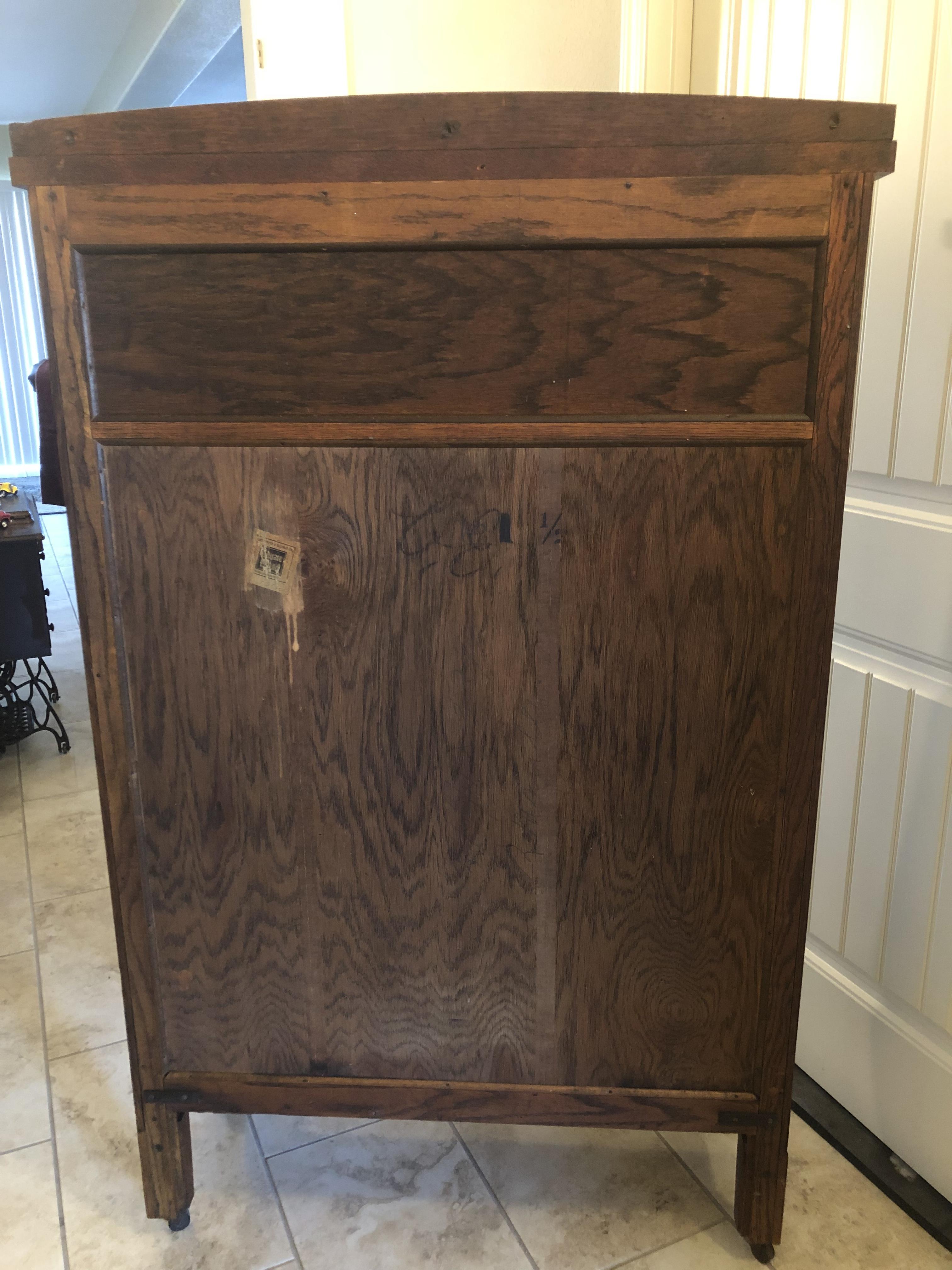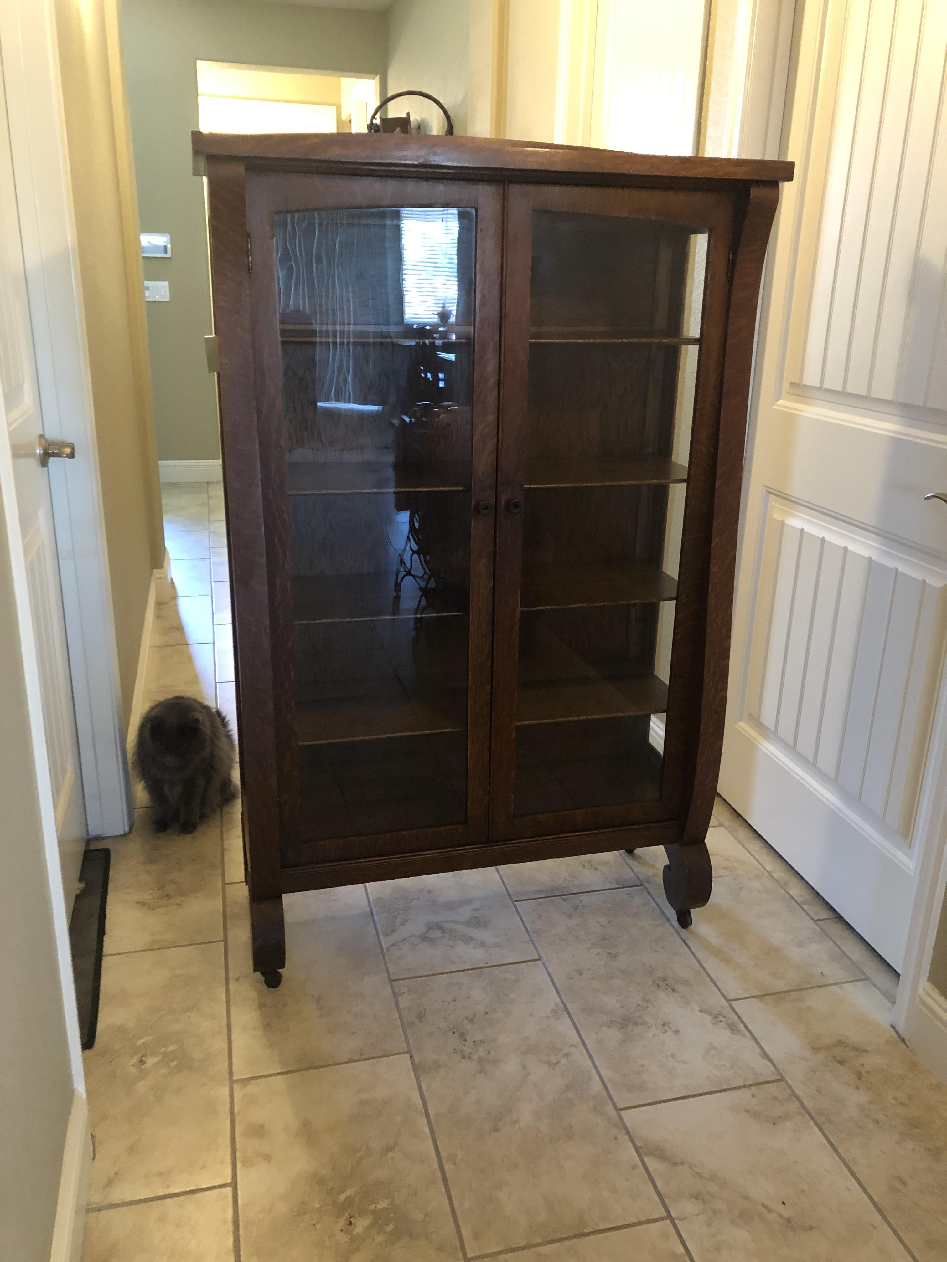 I was hoping I could get any information at all about the hutch, so when it’s passed down to our children, I can let them know it’s history. It seems to be in pretty decent shape besides the broken glass on the left side. It’s a small hutch. At 58 inches tall, 3 ft wide and 14 inches thick. The castors are made of wood. Also, if anyone knows where I could go to have the broken glass repaired, that would be helpful. I live in Sacramento California. Thanks for your help.