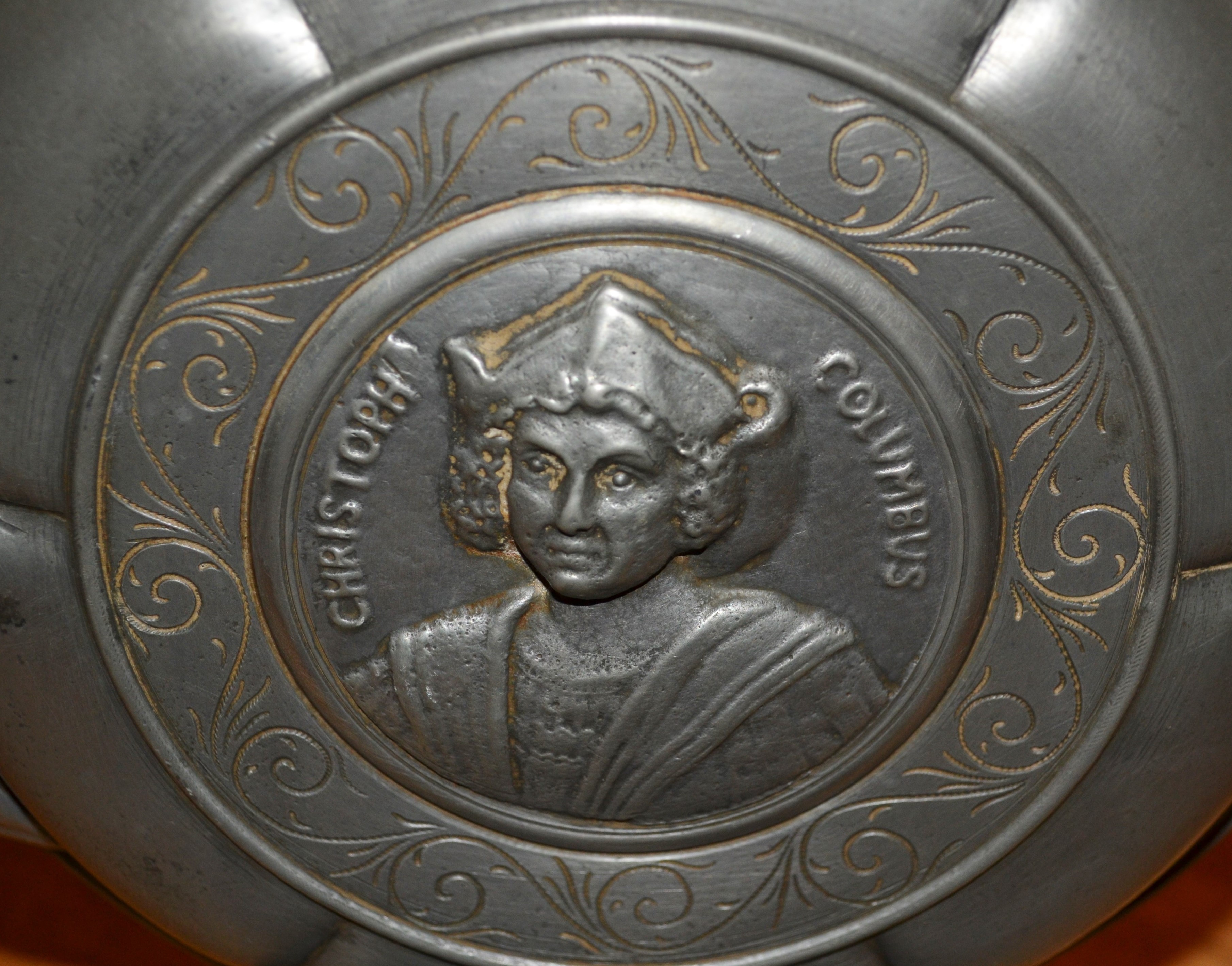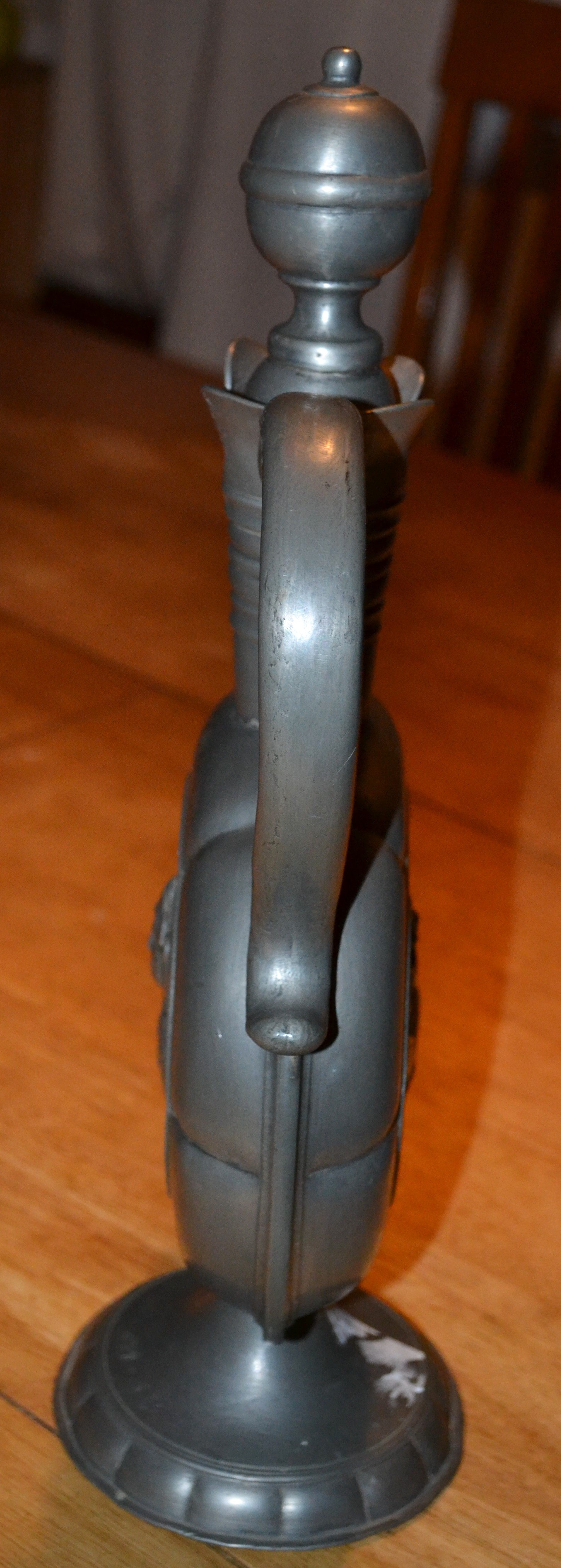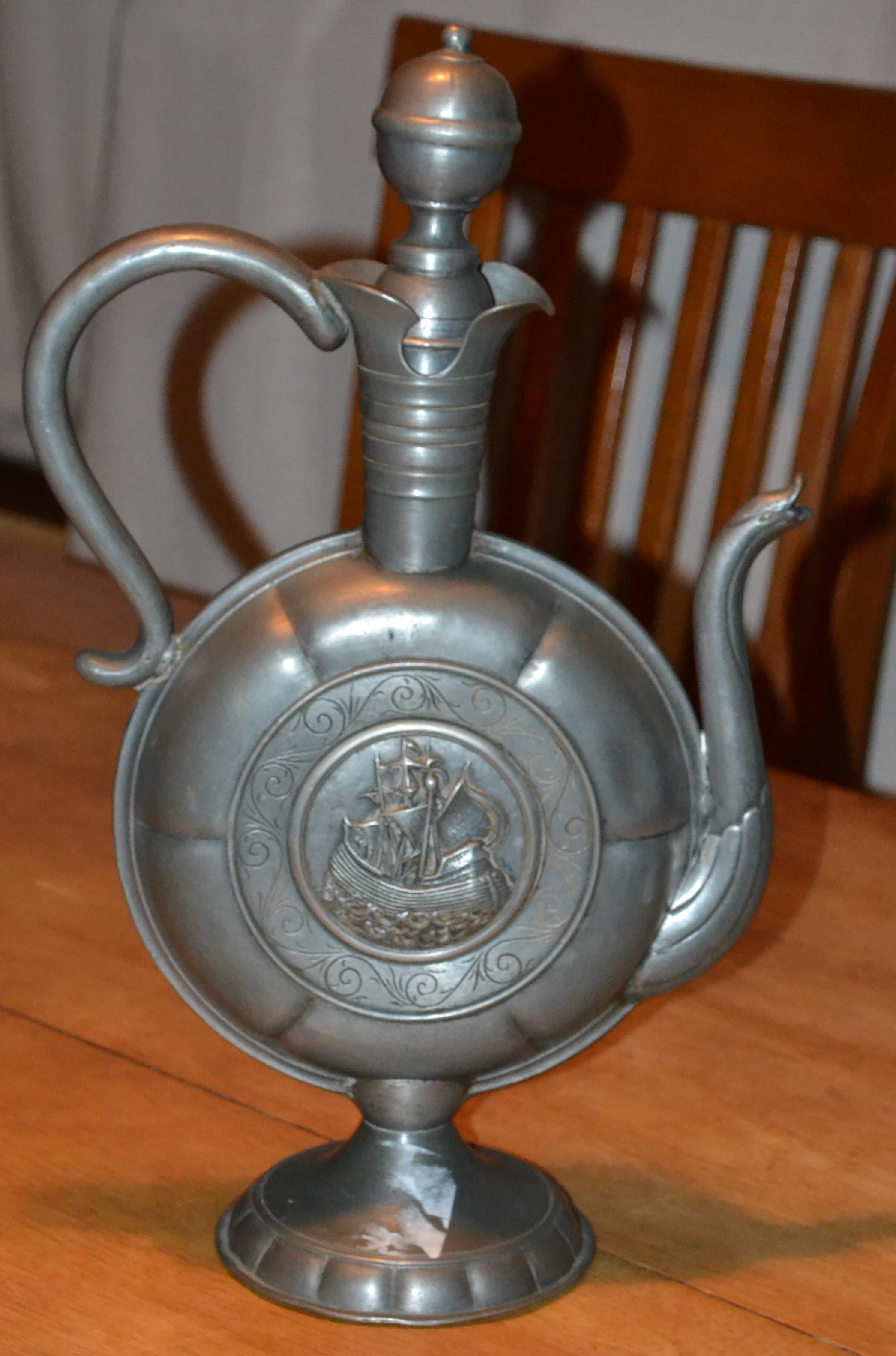 A tall pewter ewer featuring Christoph Columbus on one side and the Santa Maria on the other. There is a lid and a large graceful handle, and a "collared" neck. The spout is in the form of a goose. The goose has a a moderate indent (damage) on one side but otherwise no damage or repairs. There are prominent hallmarks with initials displayed on the top of the base. 17 X 10 X 2 and very heavy. Found in a Maryland shop. I would love to know the story behind this piece.