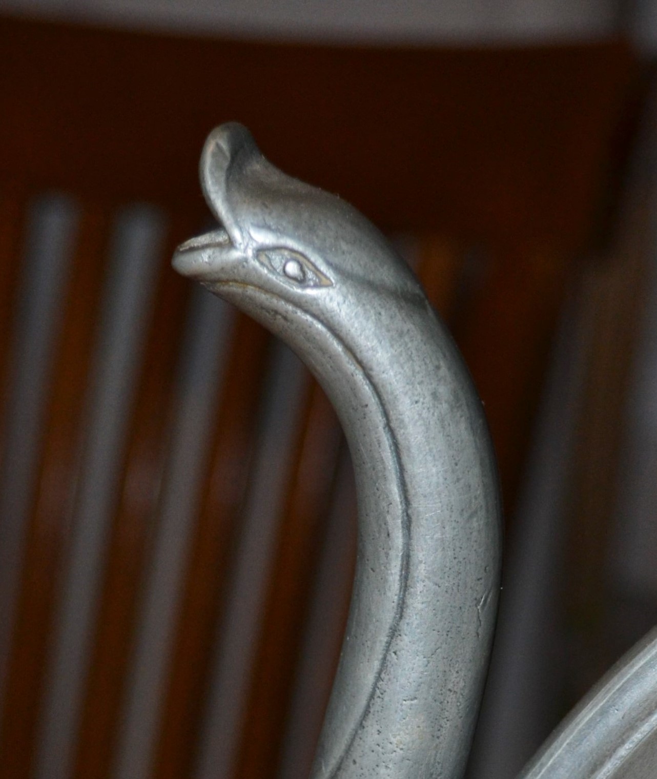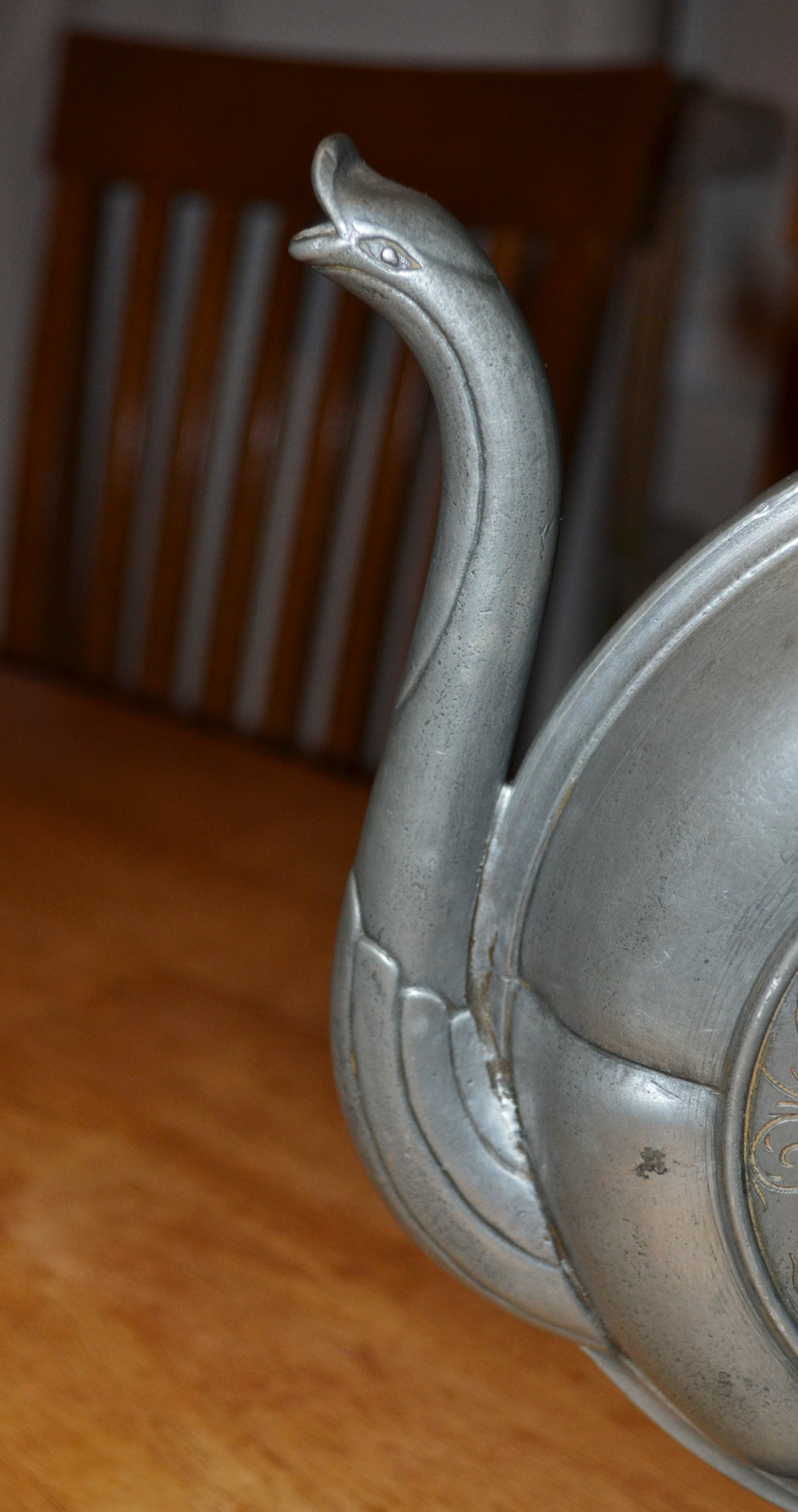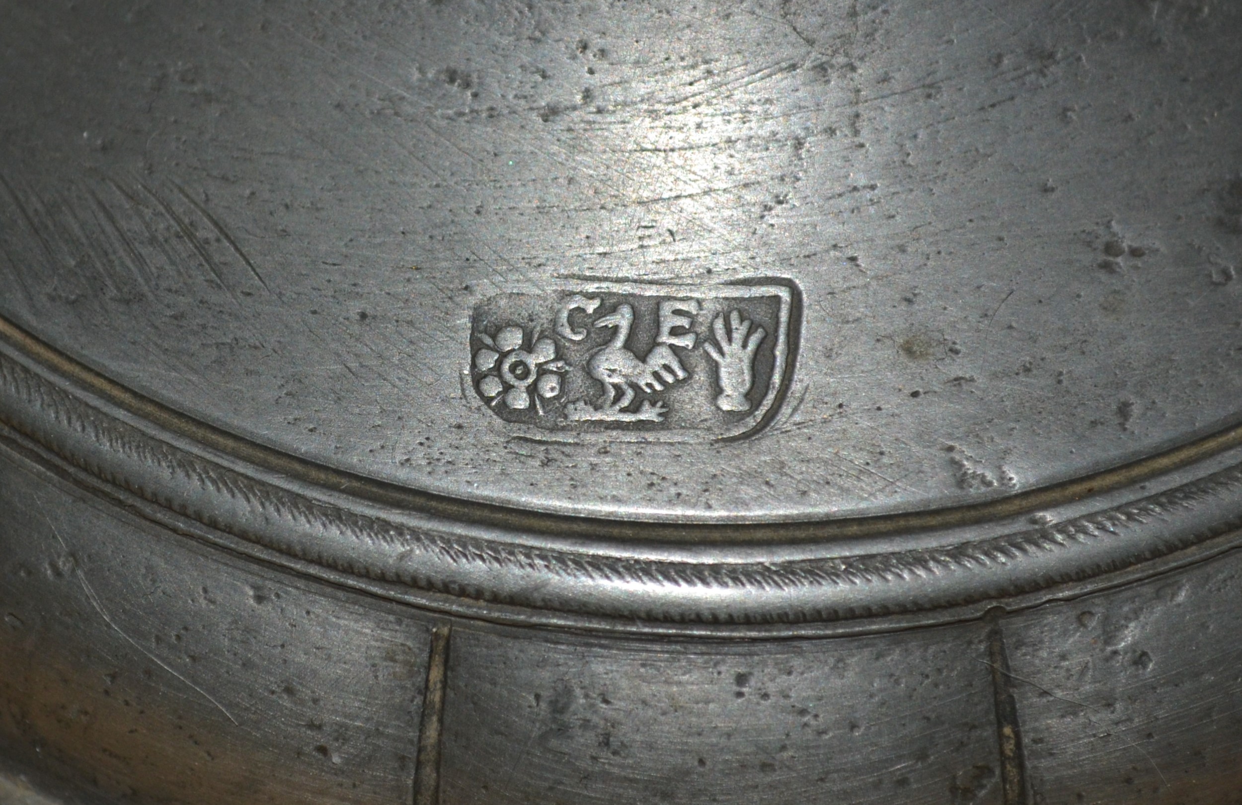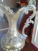 A tall pewter ewer featuring Christoph Columbus on one side and the Santa Maria on the other. There is a lid and a large graceful handle, and a "collared" neck. The spout is in the form of a goose. The goose has a a moderate indent (damage) on one side but otherwise no damage or repairs. There are prominent hallmarks with initials displayed on the top of the base. 17 X 10 X 2 and very heavy. Found in a Maryland shop. I would love to know the story behind this piece.