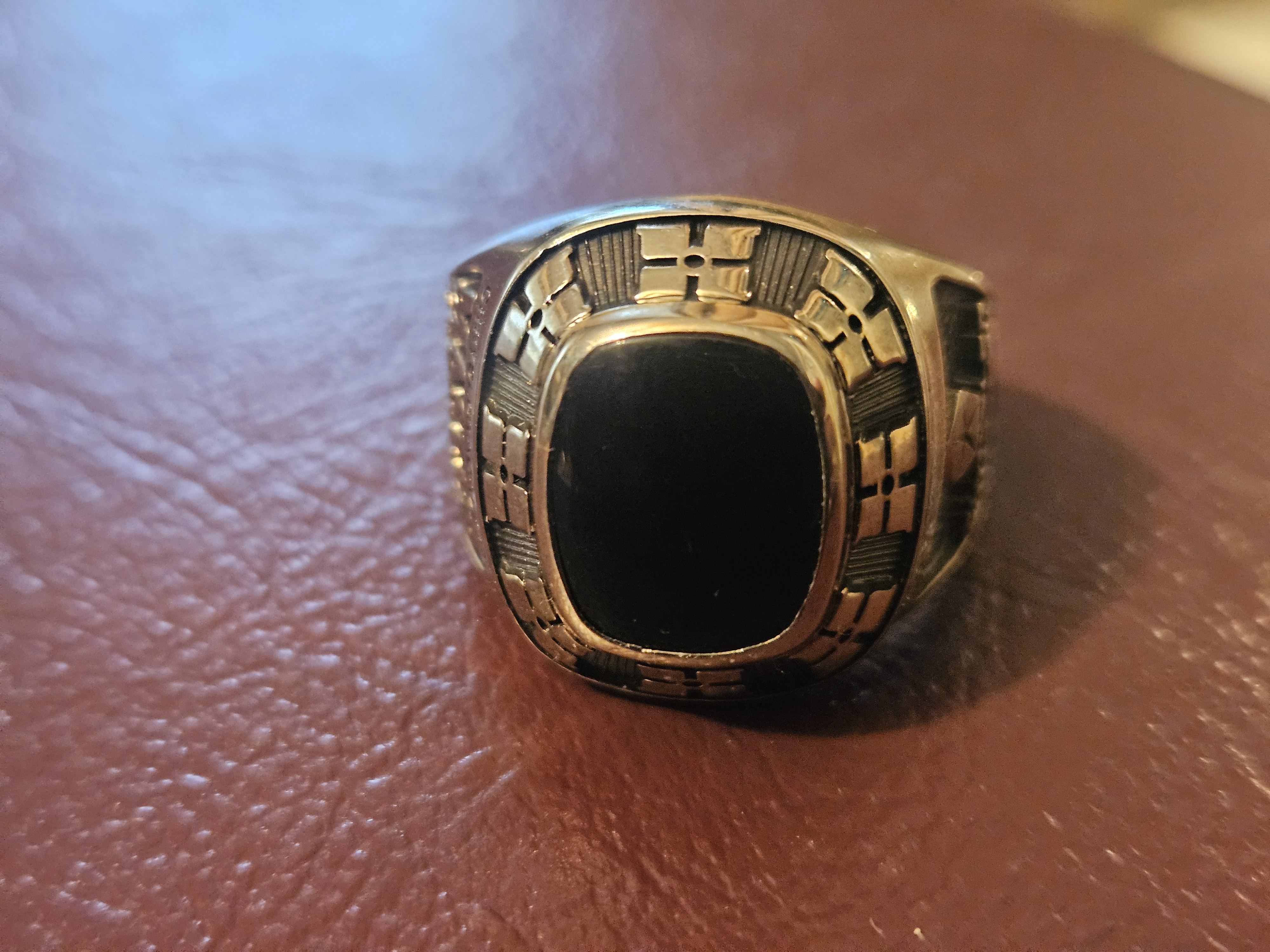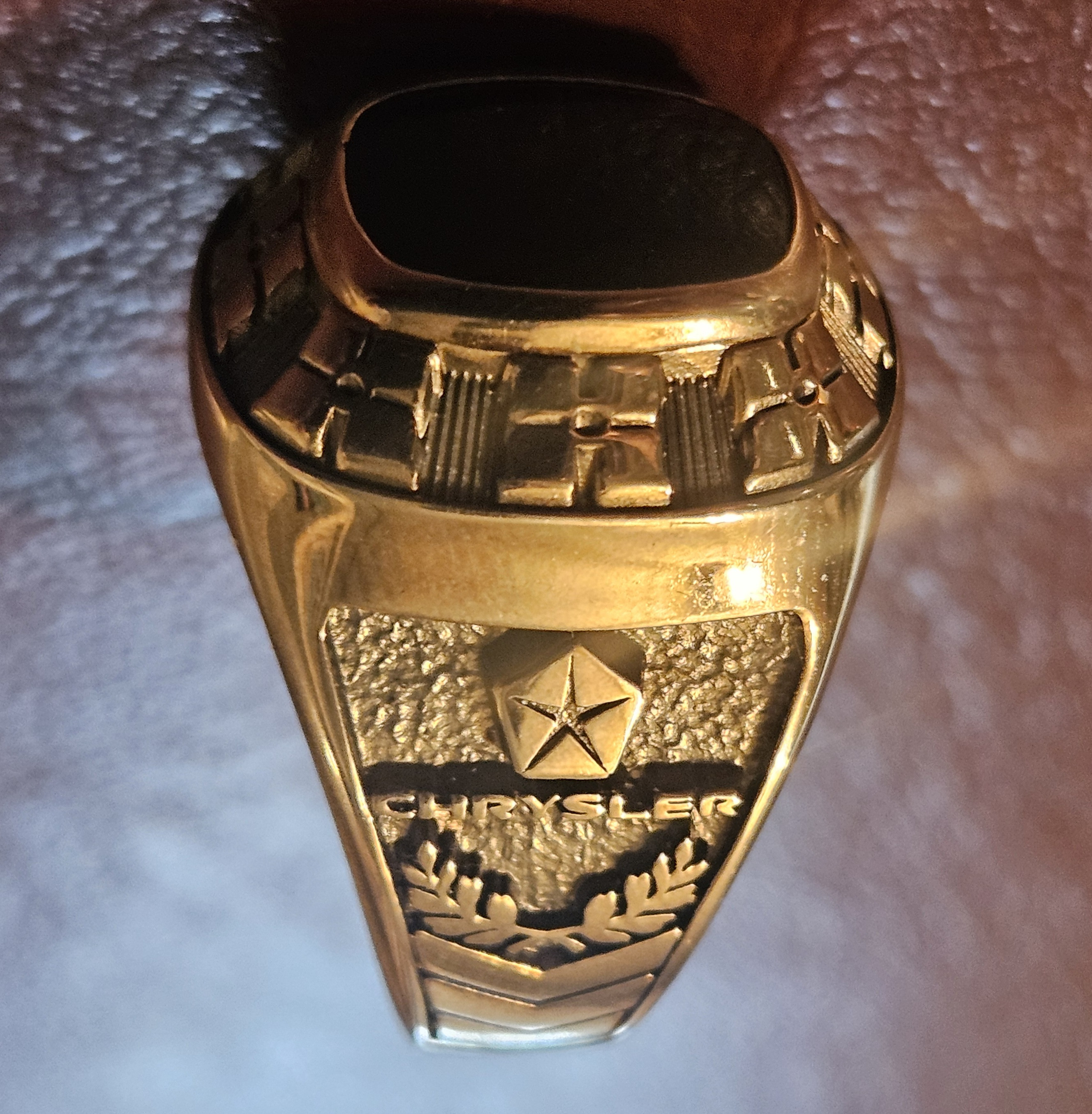 The use of black onyx and engraved side panels (with laurel leaves, Chrysler Pentastar, and chevrons) reflect a style common in military-style or class rings
