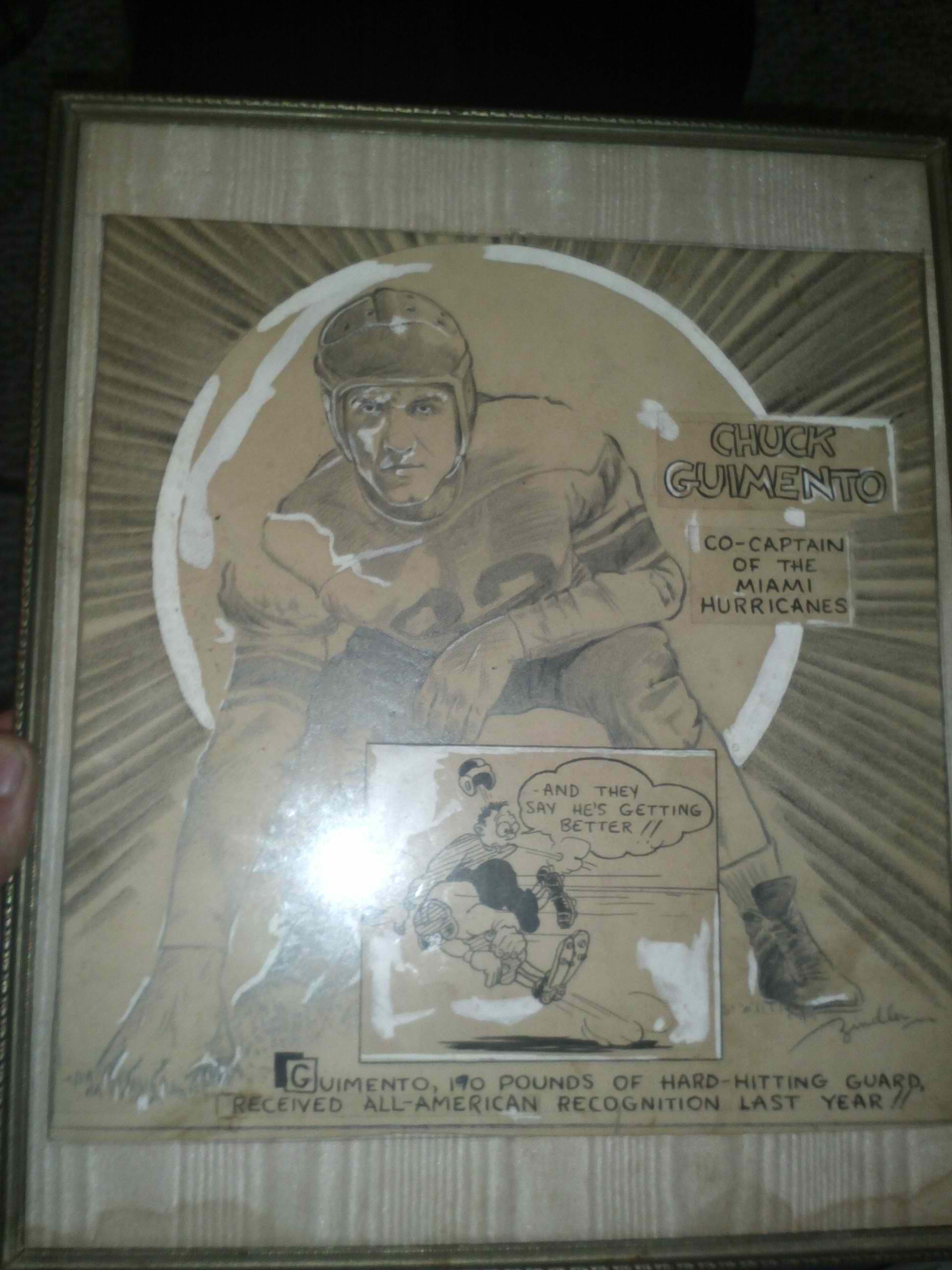 This reads Chuck Guimento Co-Caption of the Miami Hurricanes Guimento 190 pounds of Hard-Hitting guard recieaved All-American recogniton last year!! It has a comic on it that reads And They Say He's Getting Better!! I have no idea how old or what its worth... Signed by what looks like Zindle.