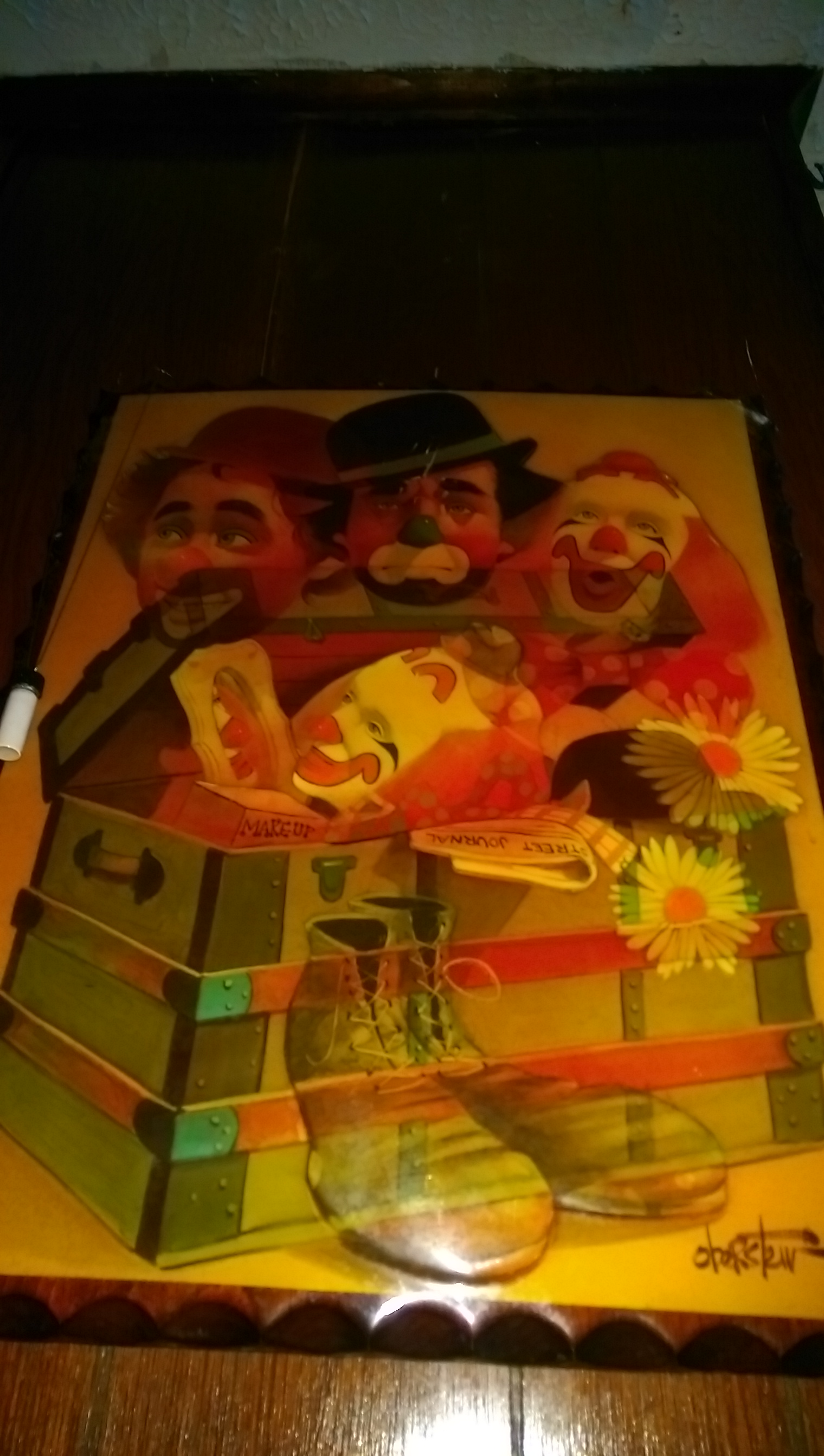 As you see, I've identified the artwork and artist. What makes this piece unique is that it's on wood and three dimensional. I found it while driving one day. Someone had put it out for trash, and I thought it looked nice. They had, apparently, tried to clean the surface incorrectly and it had a nasty hard film clouding it. But I took it home and rubbed it with a dry, clean cloth and it cleared right up.