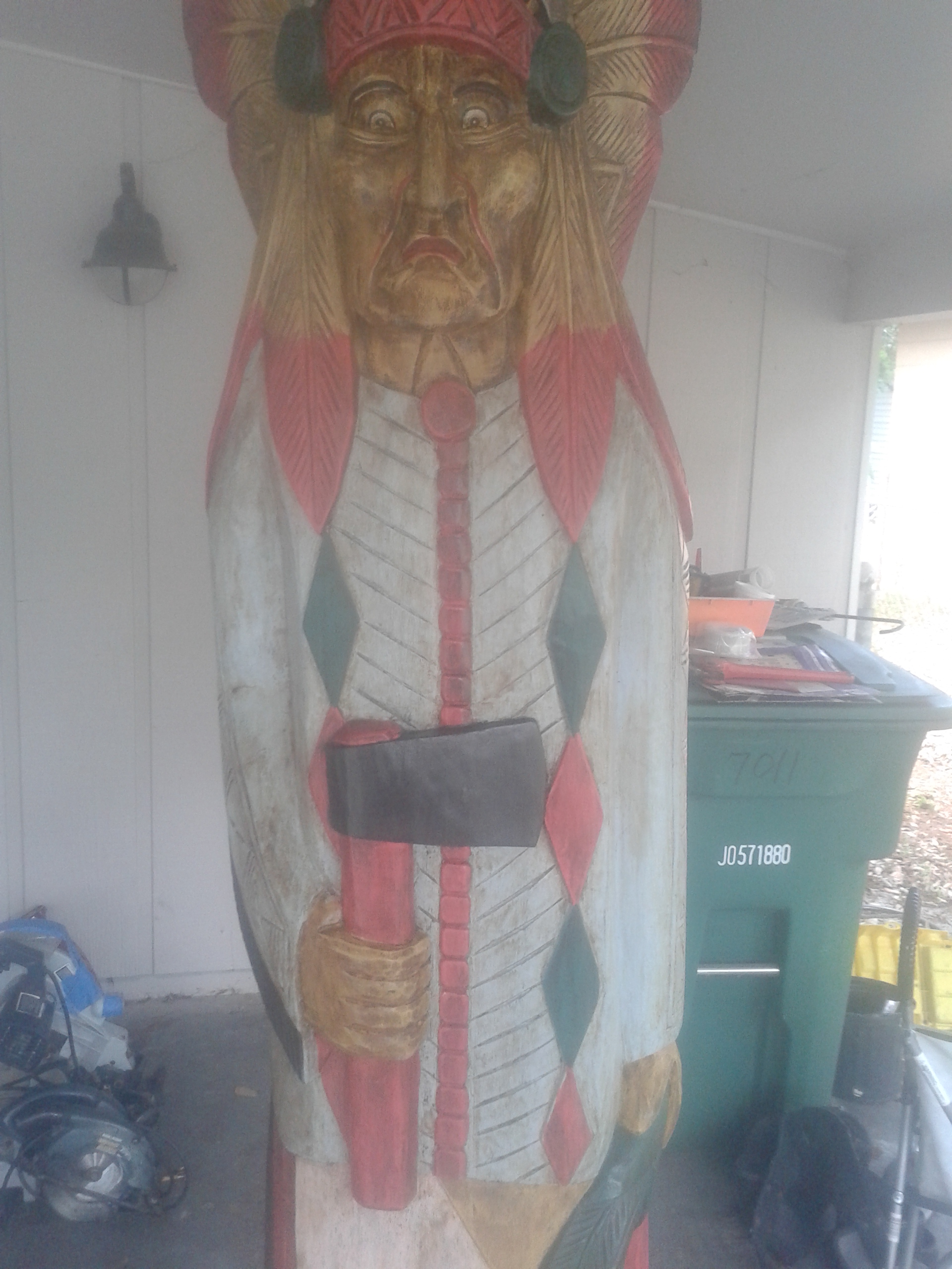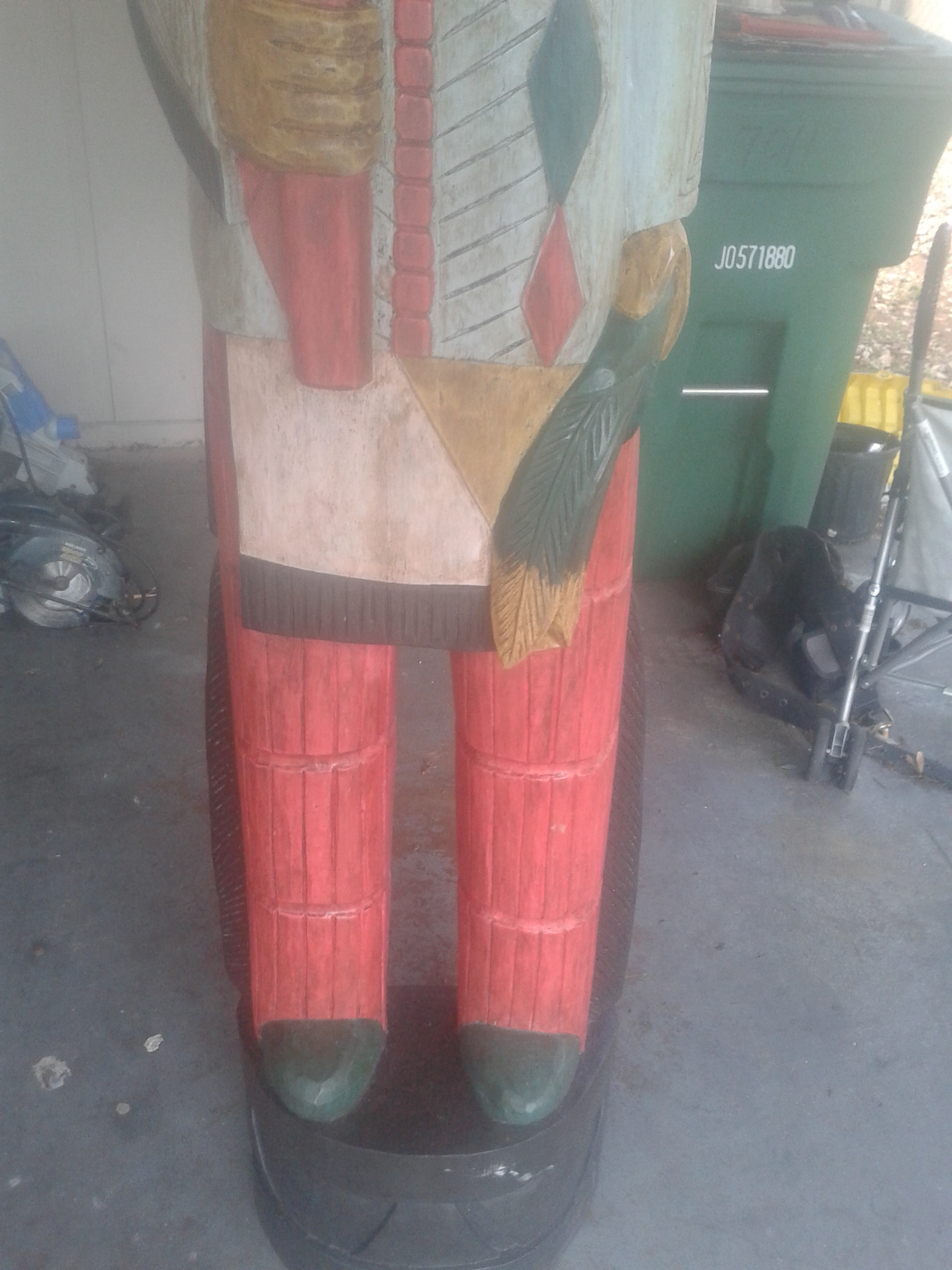 Your Cigar Store Indian is a fairly modern Reproduction of a type made post 1970 and produced into the early 1990's. Values for them depend a great deal on the quality of the carving, comparable ones to your's go at auction for about $350.00.