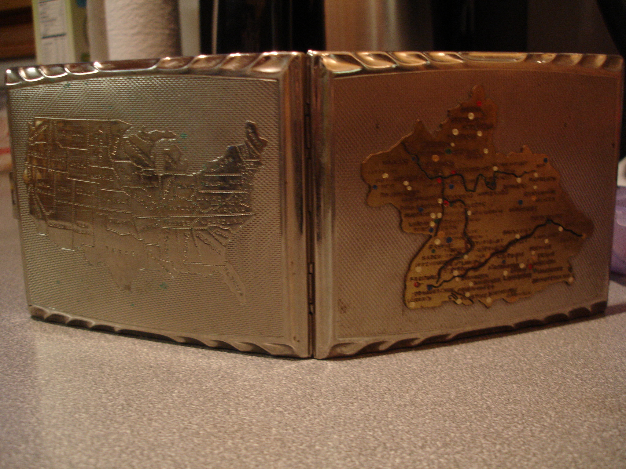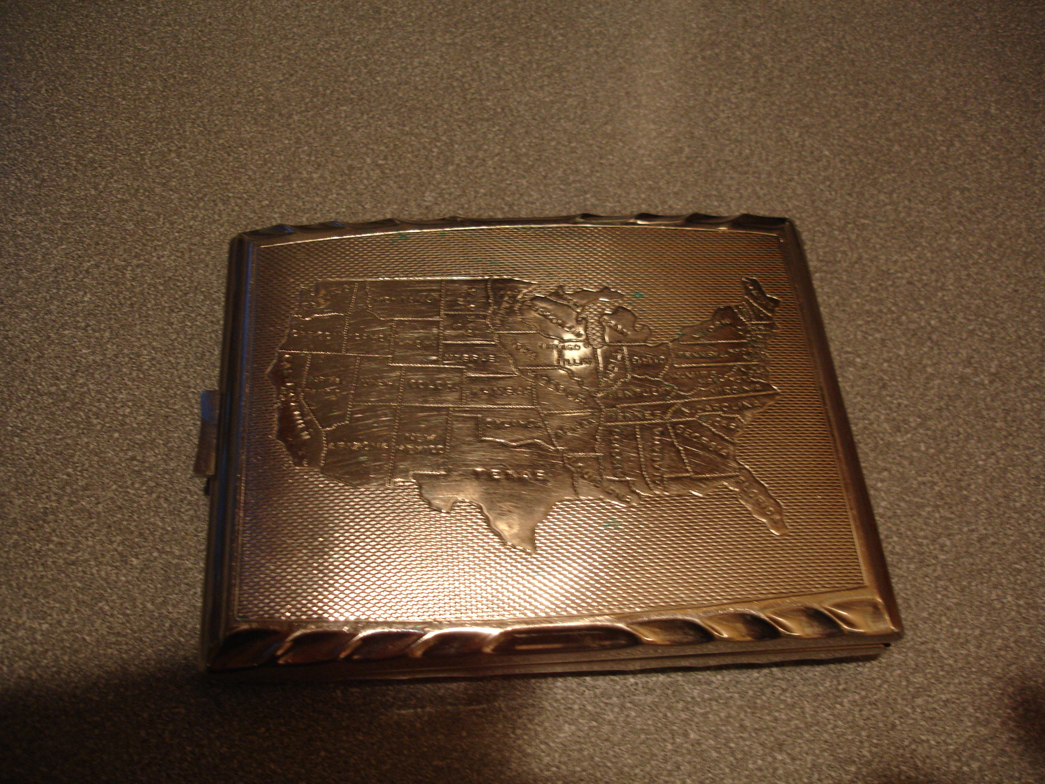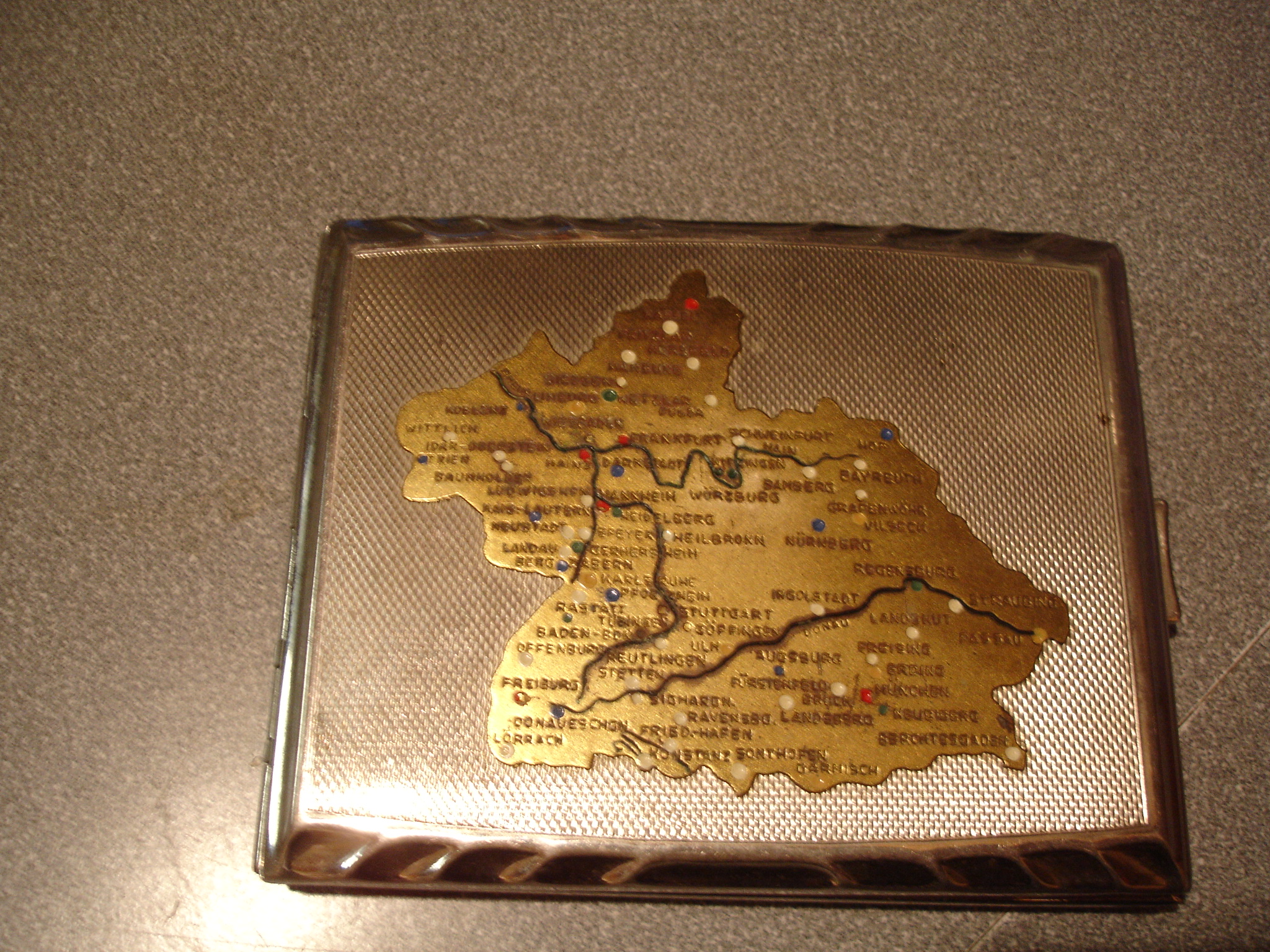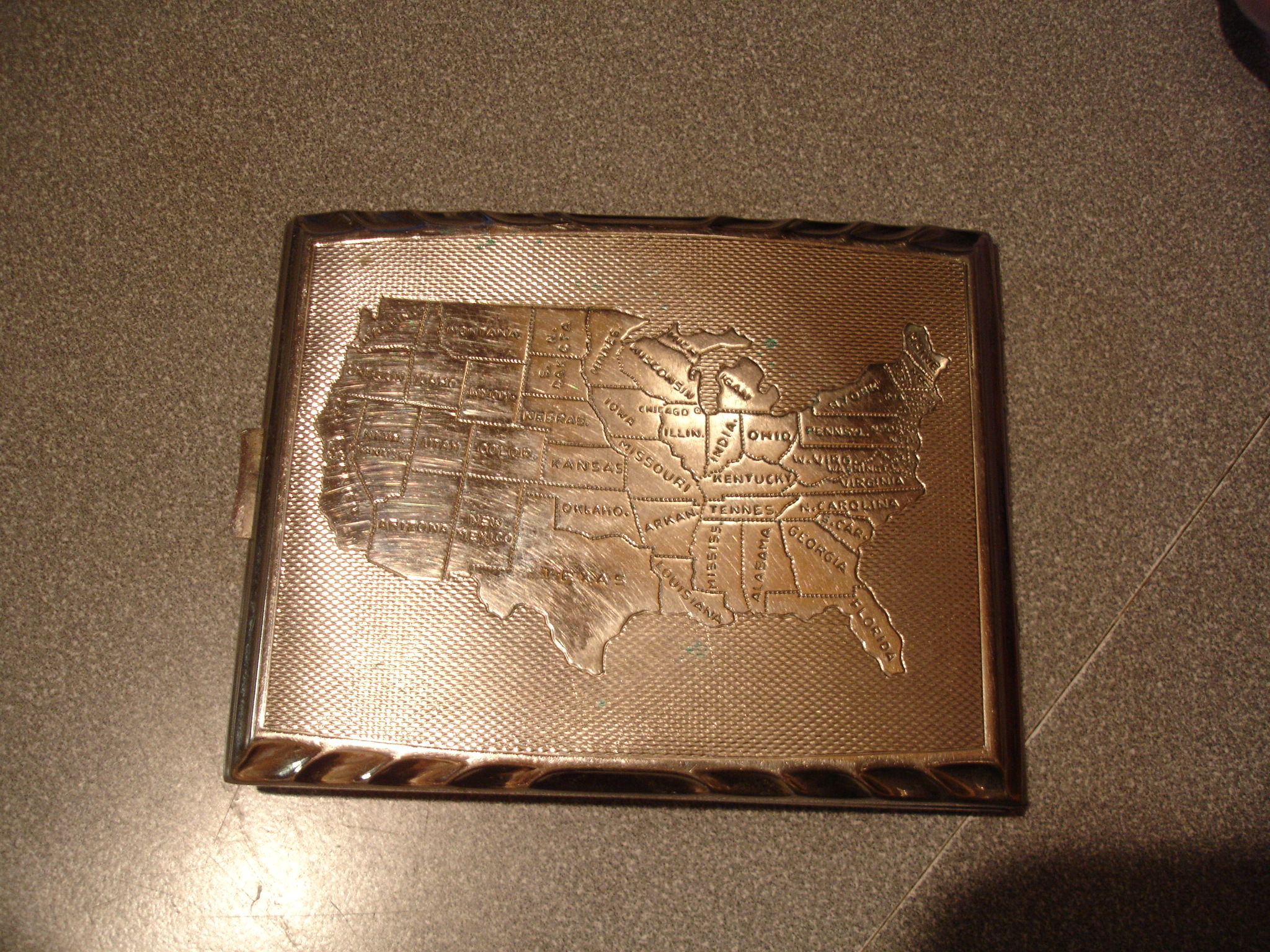 old cigarette case- possibly WW II era, map of US etched on one side showing continental states only and 2 cities (Chicago and San Francisco- spelled San Francisko). Some states are abbreviated. California is spelled Californien. On opposite side is an attached map of Germany. It contains many cities marked by colored dots and the Rhein River. This map is gold in color.
