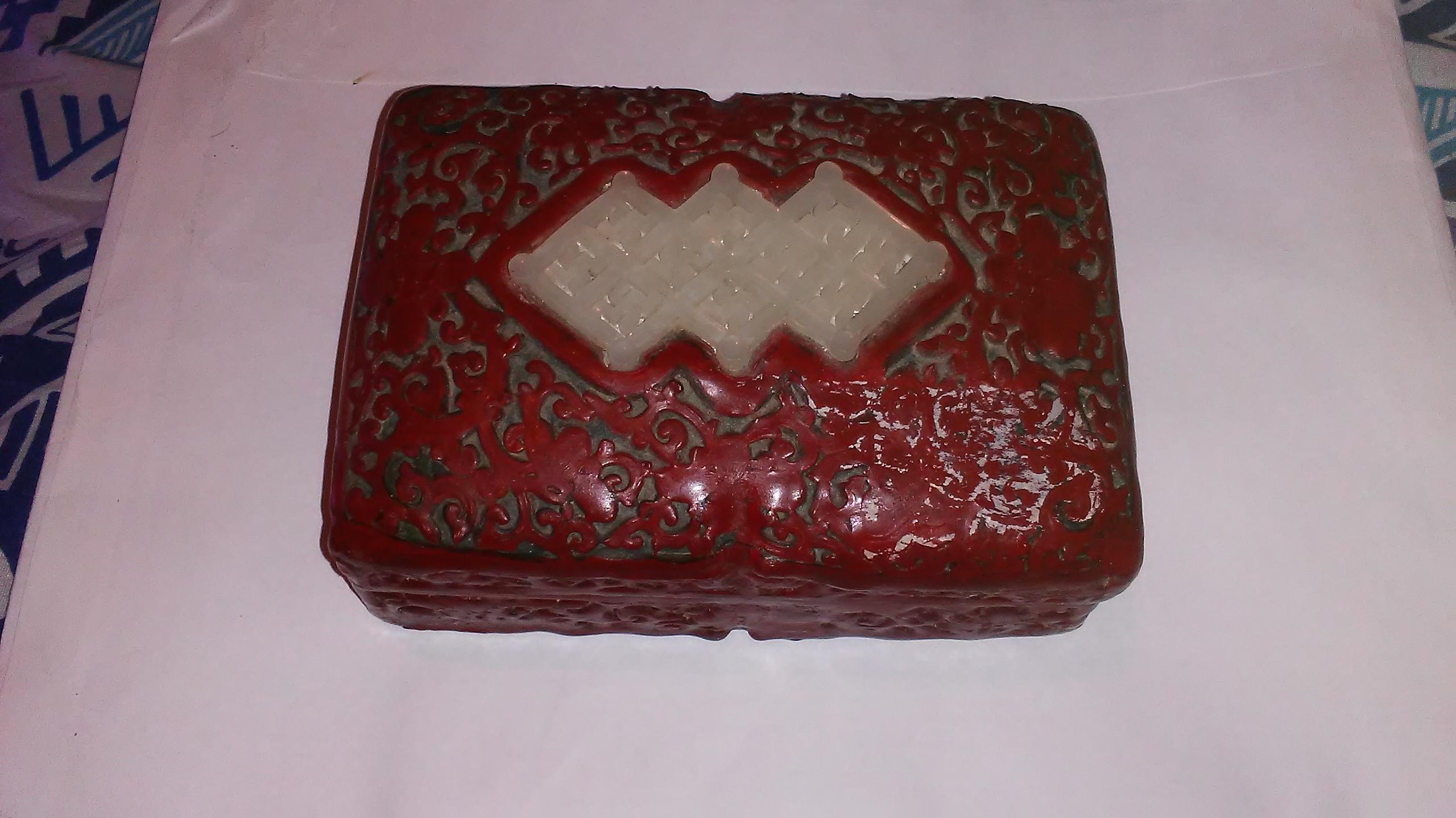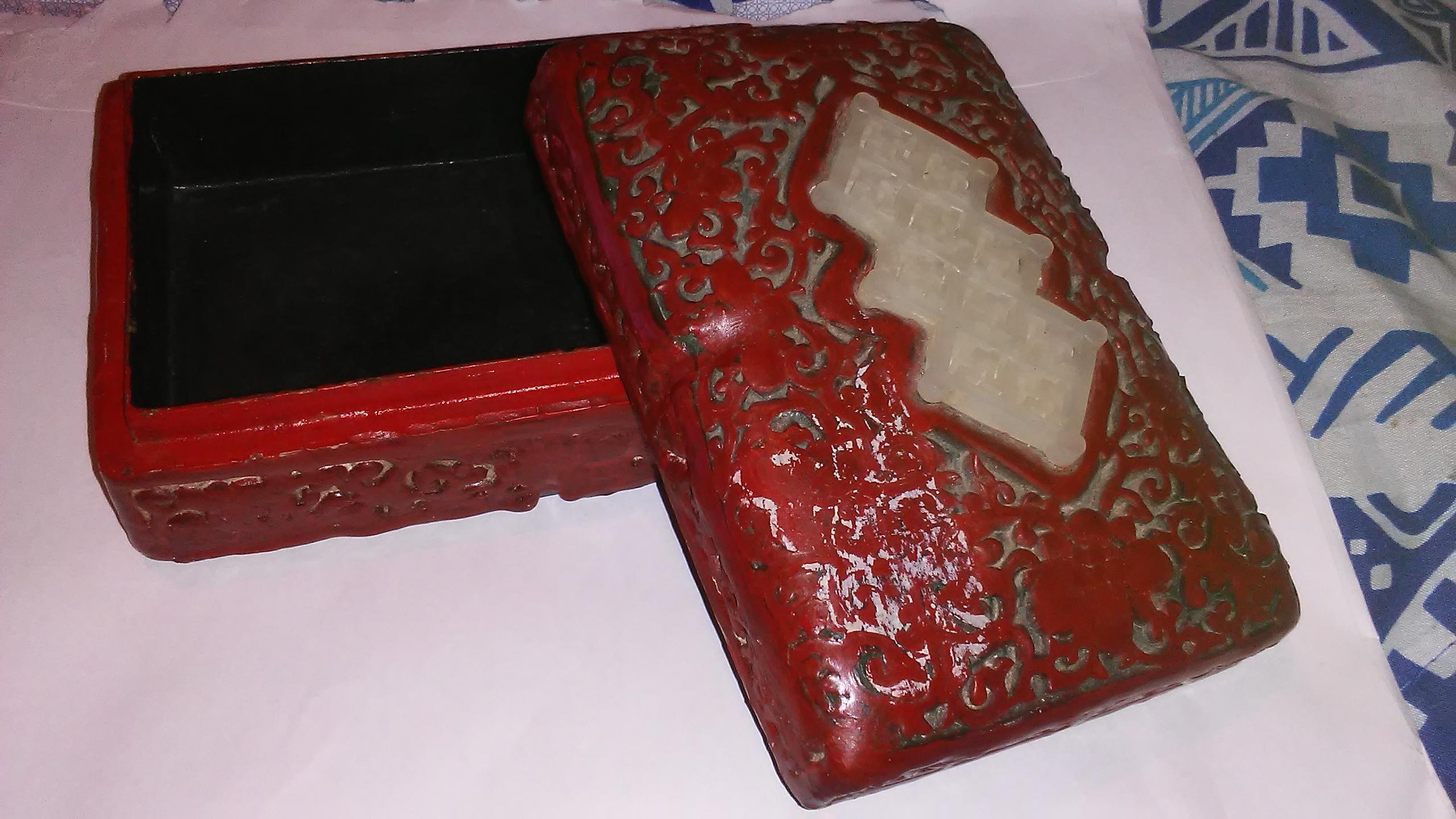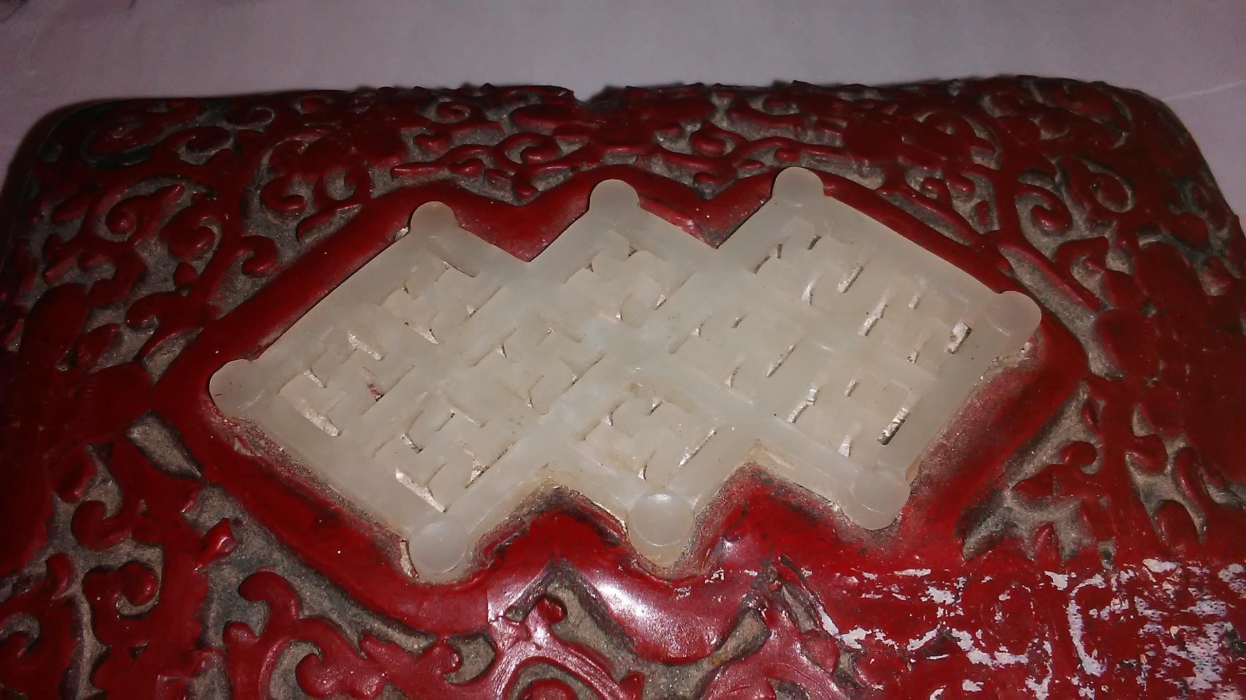 The box is approximately 5.75"x4". It is a bit worn and looks like it was bound tightly around the center. The jade carving in the center is very ornate. The inside of the box is black.
