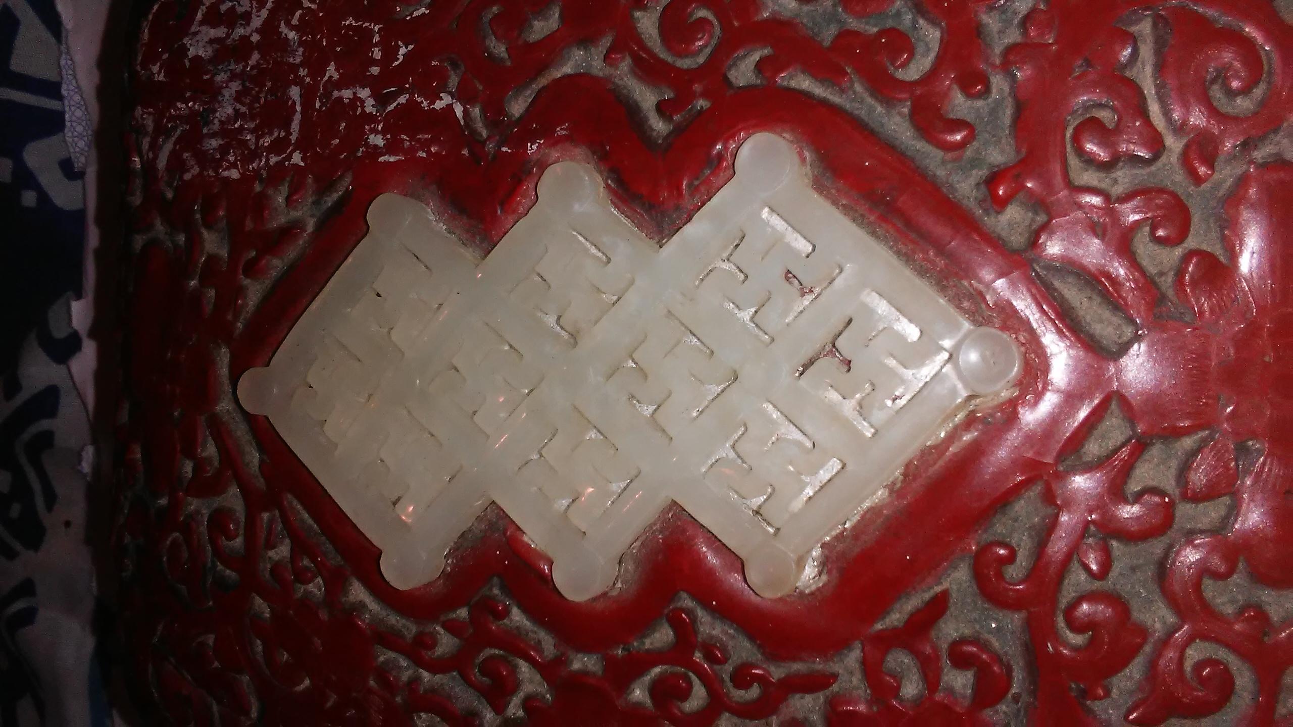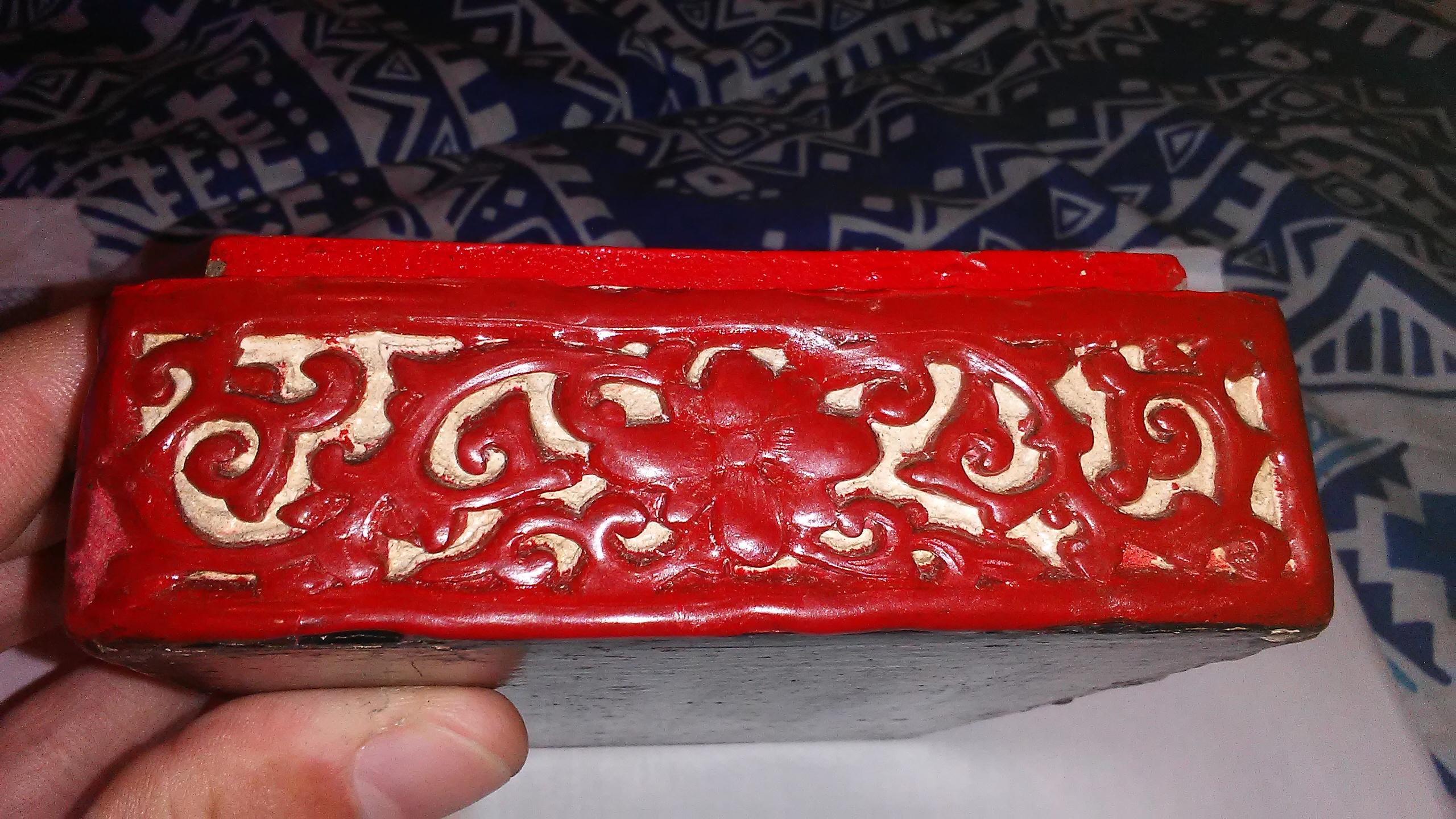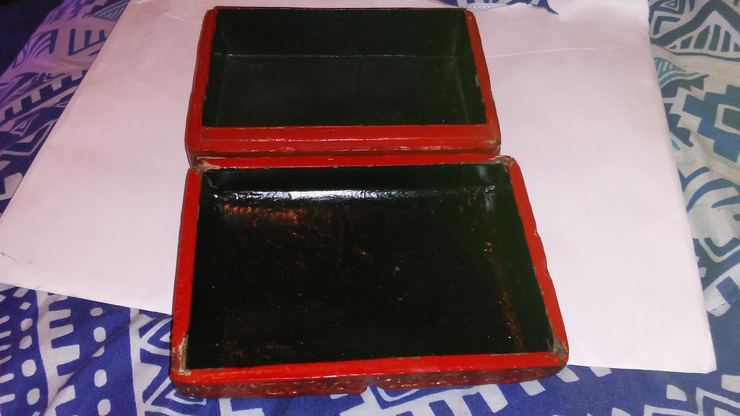 The box is approximately 5.75"x4". It is a bit worn and looks like it was bound tightly around the center. The jade carving in the center is very ornate. The inside of the box is black.