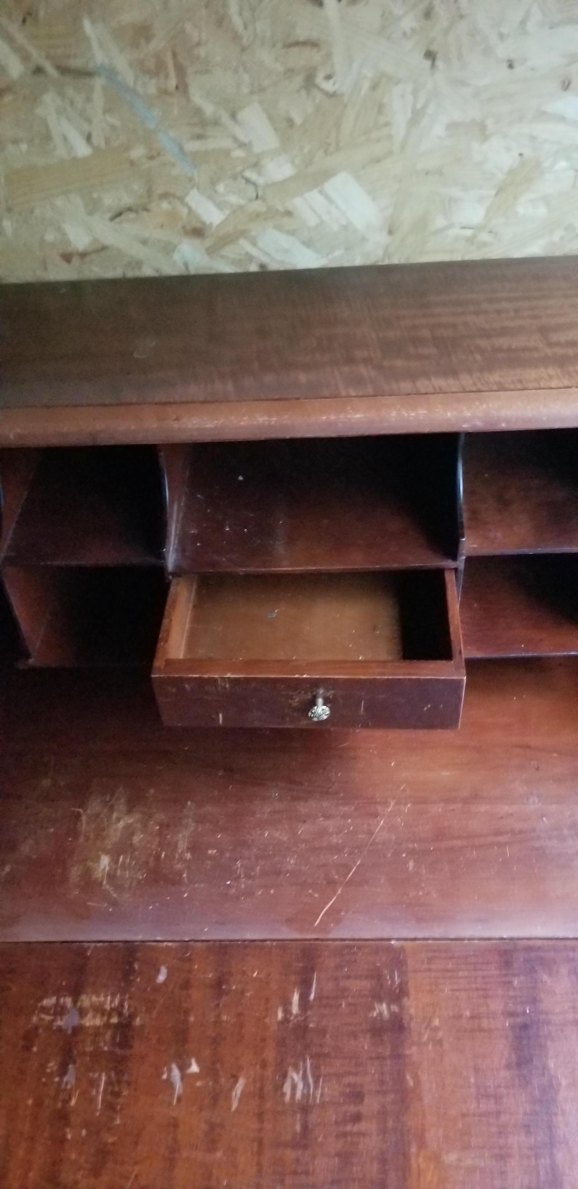 Slant front Inside has drawer and pigeon holes. Front closes and locks, working brass locks with key.