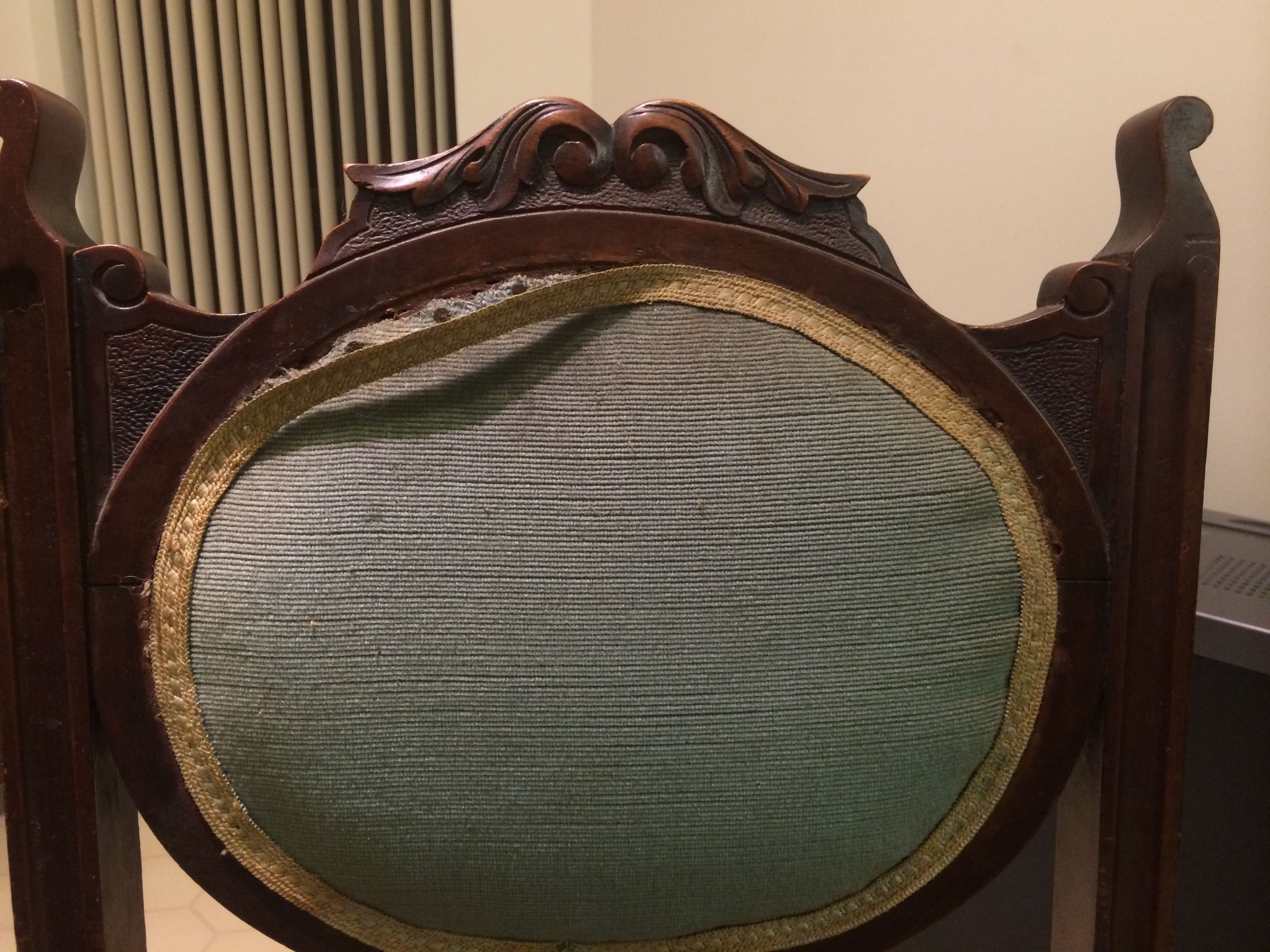 I purchased this chair and three others in 1980 fom an antique dealer.  She told me at that time they were from 1890.  I have tried to find more information regarding them but have been unable .  The pictures reflects the discription of this one....I took it apart trying to find the manufacturer but there were no markings.  The seat has horsehair stuffing,with a velvet upholstery. As seen in the photos, the strapping under the seat appears to have been repaired with new strapping.  I would like more information ie. upholsery used for this type and era of these chairs, as I want to have a professional antique upholsterer refinish them.  I am interested the value after this has been done.