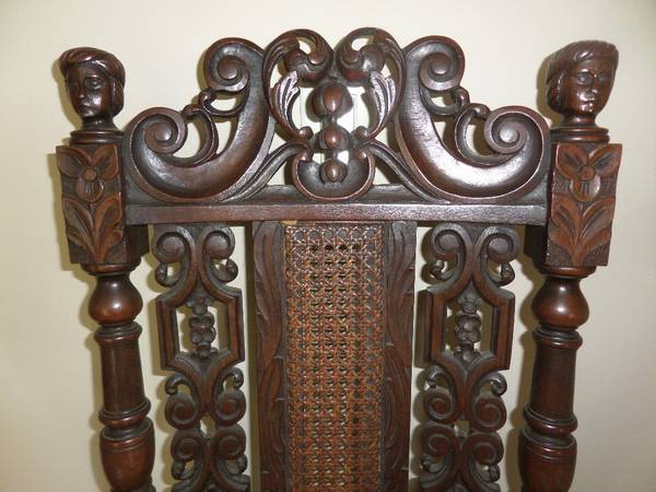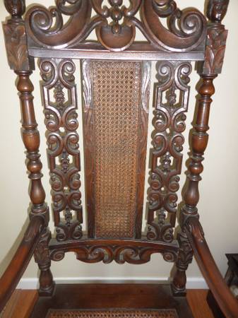 Gorgeous walnut English King & Queen chairs.....circa 1840-1860. Intricate carvings...solid as a rock. No breaks/repairs/cracks/etc. Only issue are the seat caning needs to be redone or permanent seats/cushions put in place. Large, impressive, truly unique chairs!
