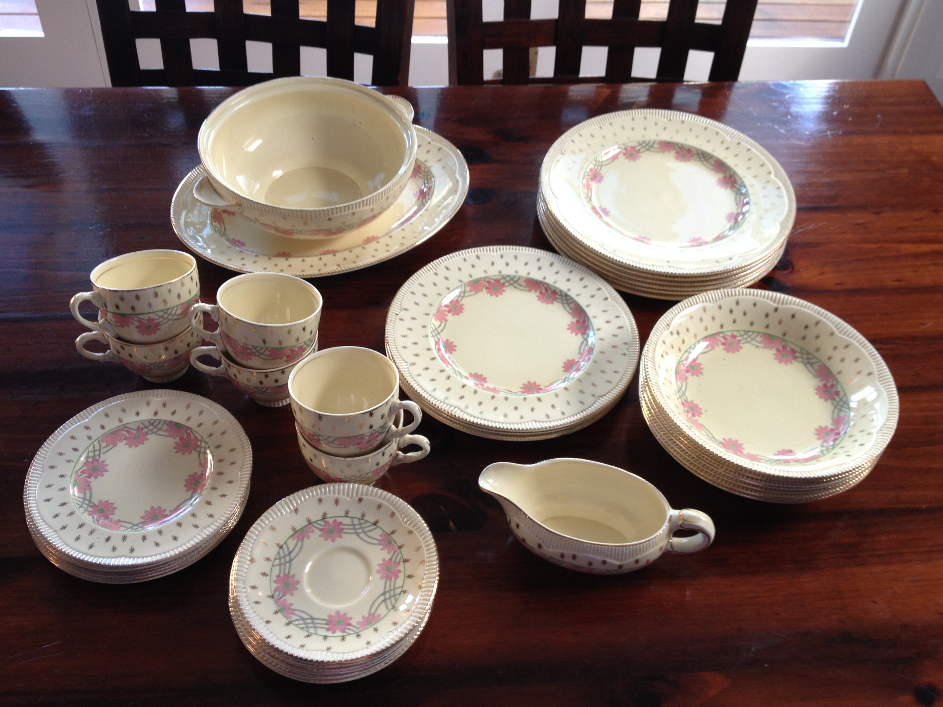 Clarice Cliff (Newport 840076) dinner set. 6 piece including teacups and saucers, cake plates, serving plate, soup terrine (without lid) and gravy boat. 2 x cake plates and one teacup have a chip, one teacup has a hairline crack and there are only 4 side plates. Pattern is pink fowers with green centres and fluted edge with gold trim.