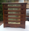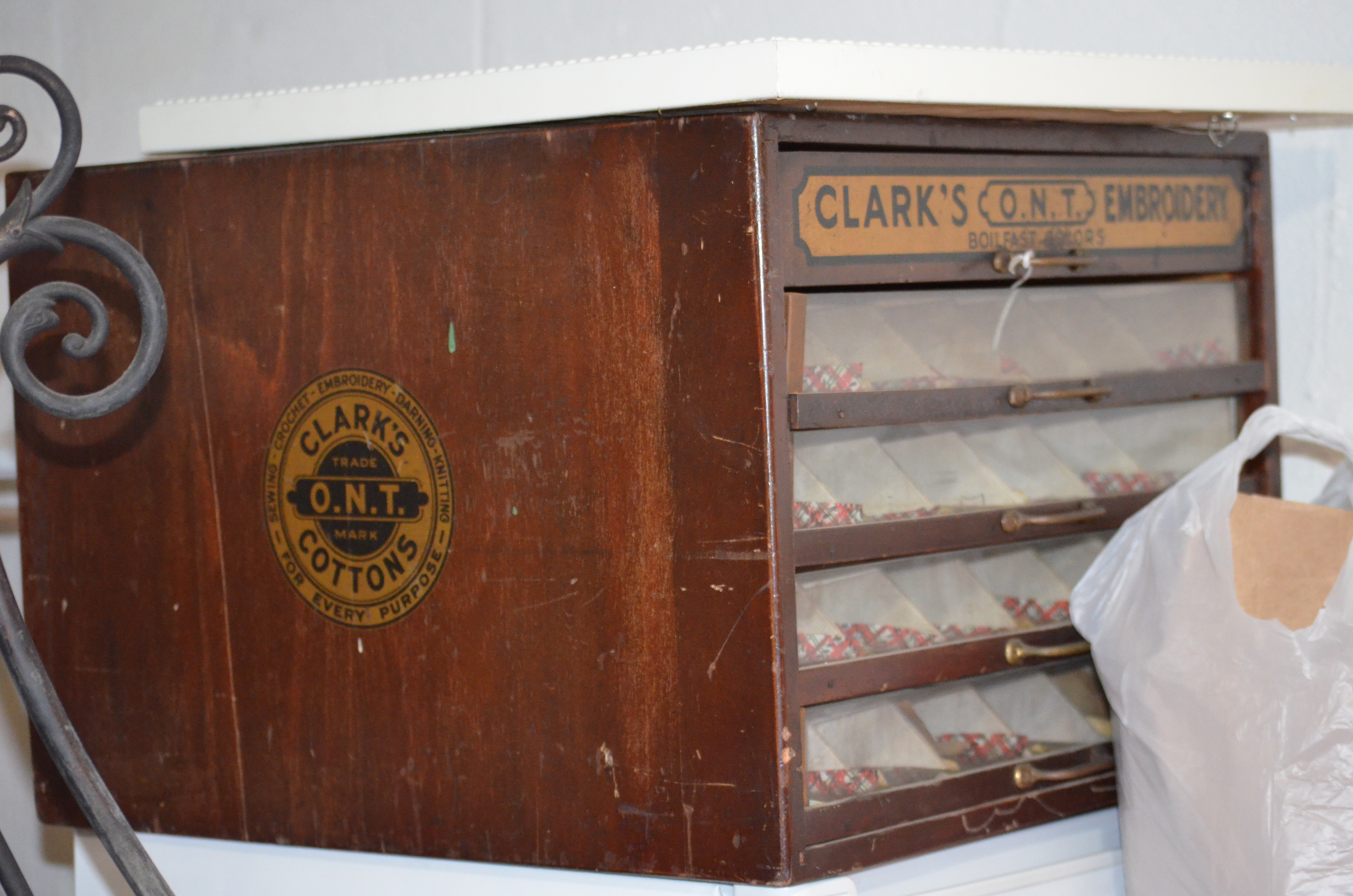 The front of this cabinet has 5 drawers on it that go the full depth of the box. The top drawer has the Coat's ONT logo on it. The other 4 drawers have thick heavy glass panes that slide into groves and are 1/4 of an inch thick. The sides and back have the Clark's round logo on it centered.