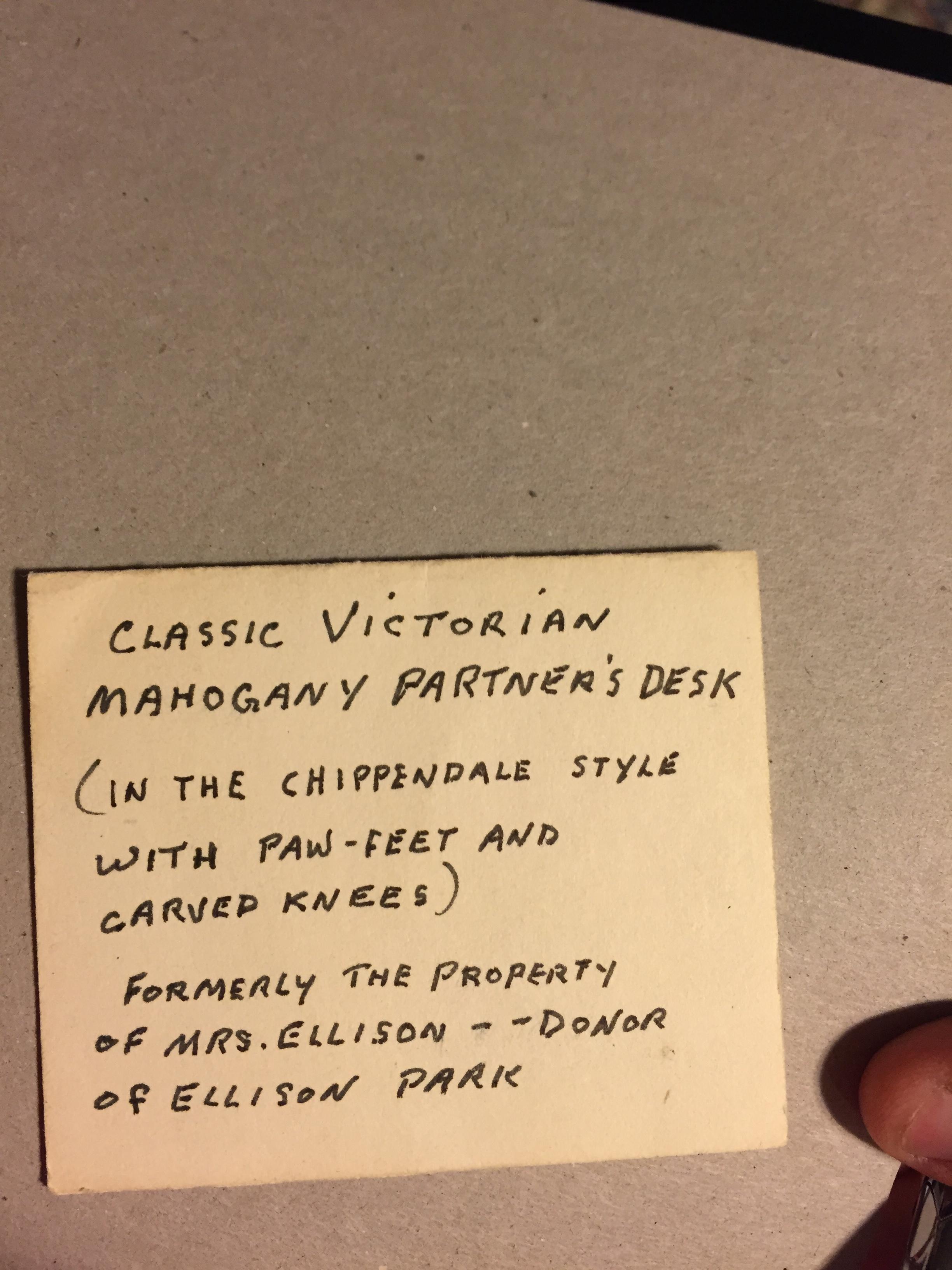 "Classic Victorian Mahogany Partners Desk in Chippendale Style with Paw Feet and Carved Knees. Formerly the property of Mrs Ellison - Donor of Ellison Park"