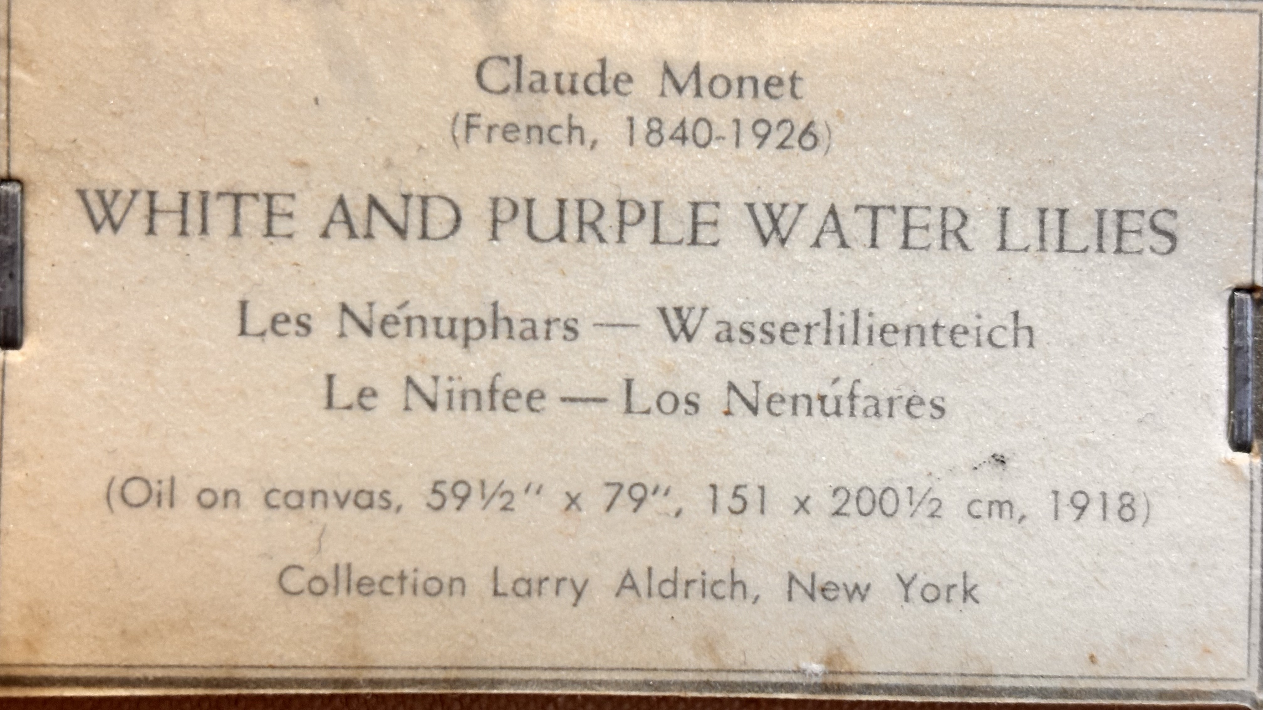Claude Monet 'White and Purple Water Lilies'. Made by Claude Monet. Dating to 1918. Materials: Oil on canvas. Estimated value: $15,000 – $25,000. Condition: Good. The market for Impressionist paintings is currently strong, with rising prices.
