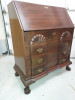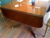It appears to be made of mahogany, and it has 6 legs, ball and claw feet. The two extra legs support the sides when it is open. The extra leaf folds in half and hides away in the center when not in use, and I recently discovered after a little struggling with it, that to open the center, I had to pull on a thin wire hanging down underneath on one side, which opened a small latch and allowed the pieces in the center to be pulled apart. I've never seen anything like this before, but then I'm no furniture expert. As far as markings...there is a stamp underneath in black that says "DUPONT" (as pictured) and a "32" in two places above two hinges on one side. The hinges appear to be brass or brass plated, with faint stamps on them in a heart shape that say "SW".