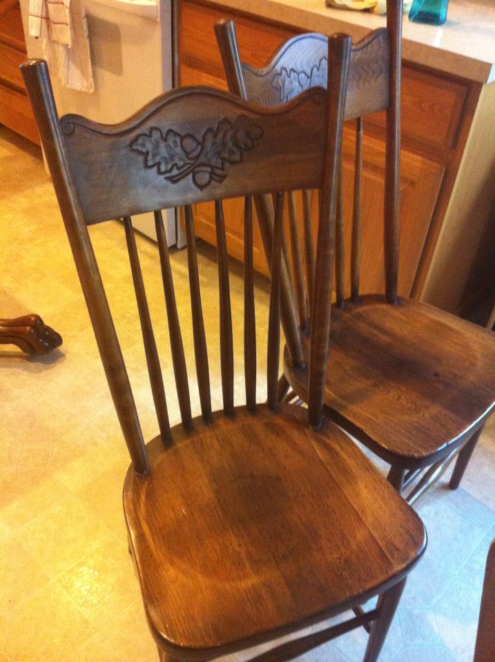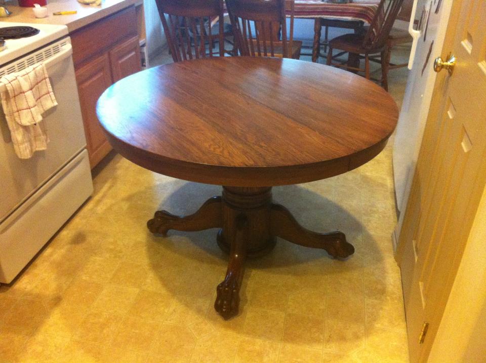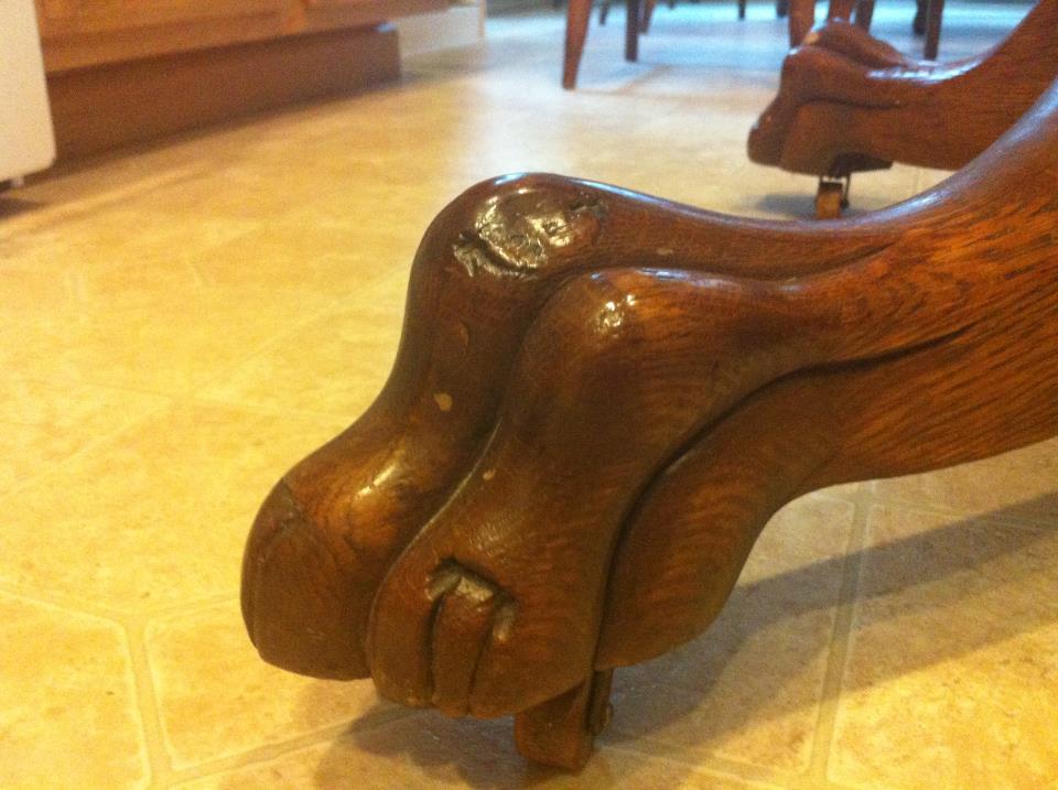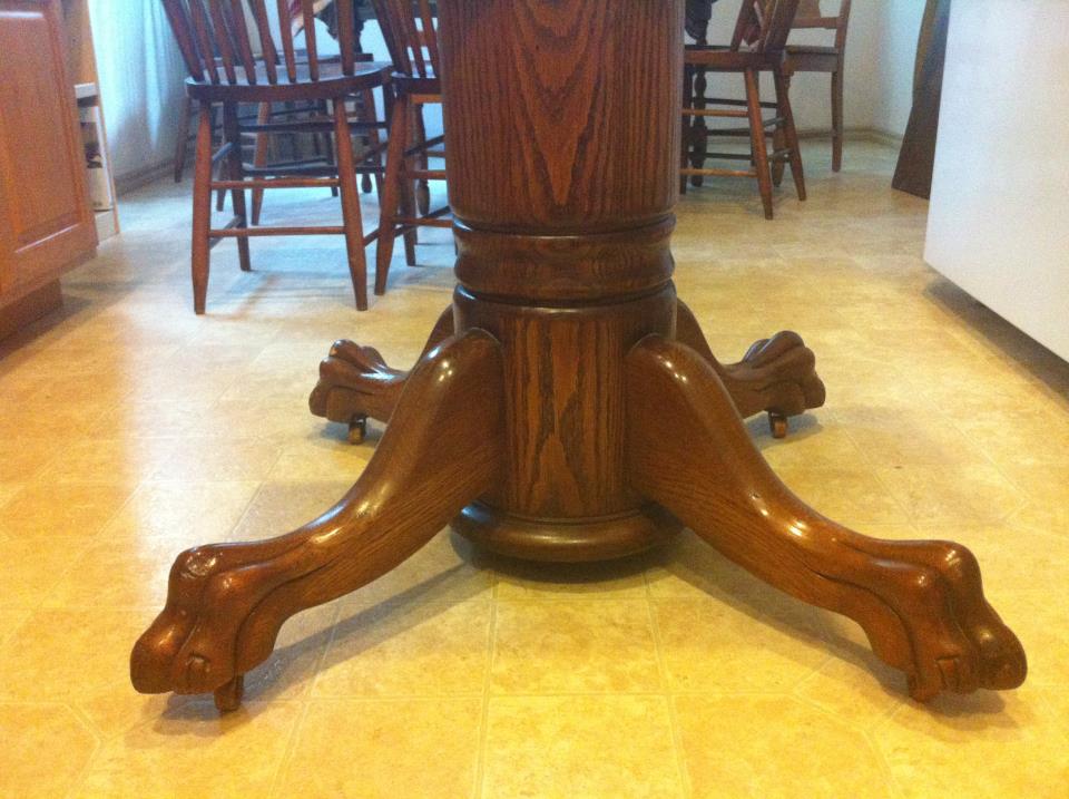This table is very heavy and has clawfeet on wheels. Underneath it has a very old looking hand crank to extend the table so you can add the leafs. I'm not sure if they chairs came with this table or not, but the backs of them have an acorn with leafs pattern. They're very pretty. Any help figuring out where this item is from and how much is worth would be very appreciated. Thanks!