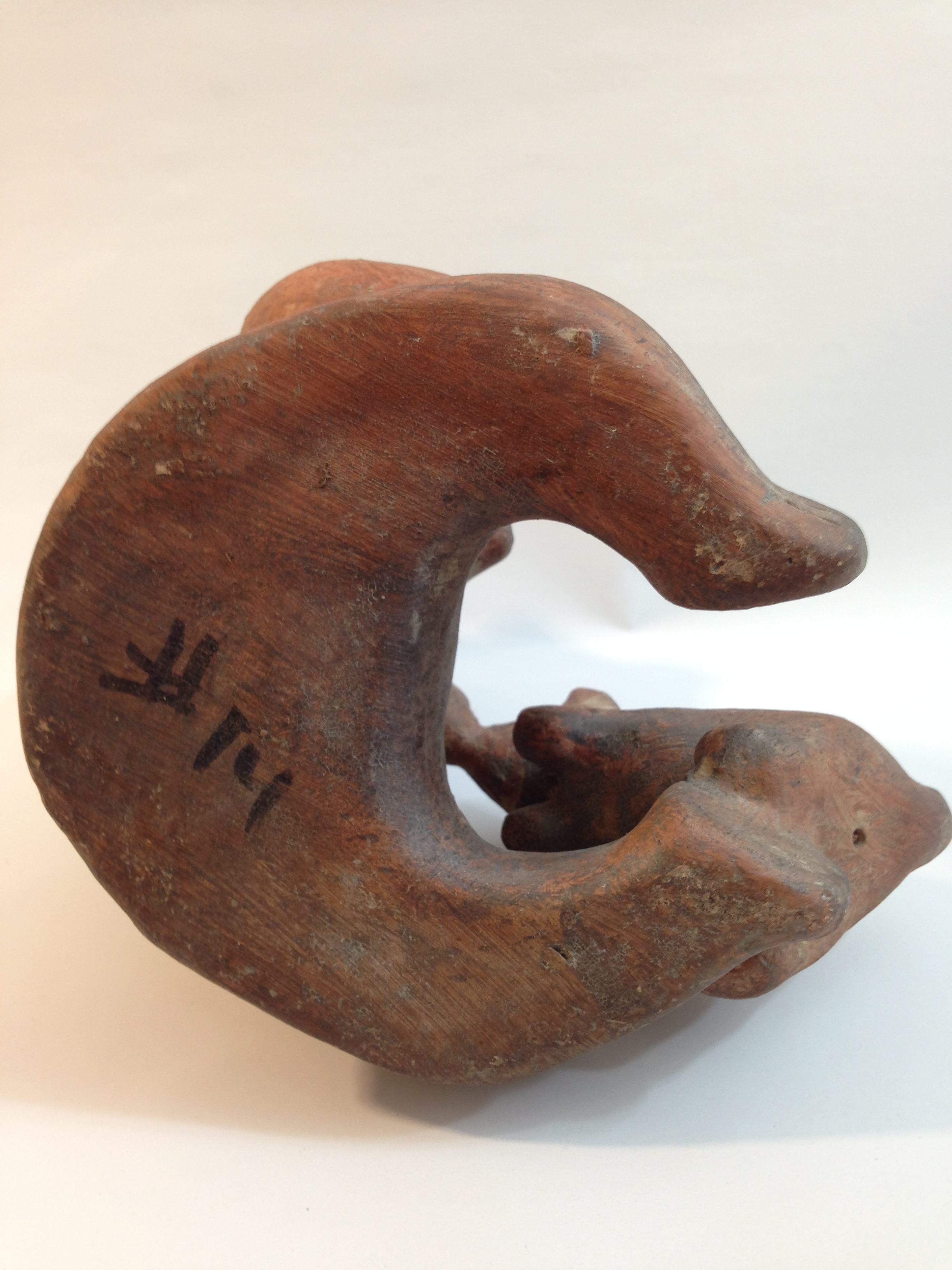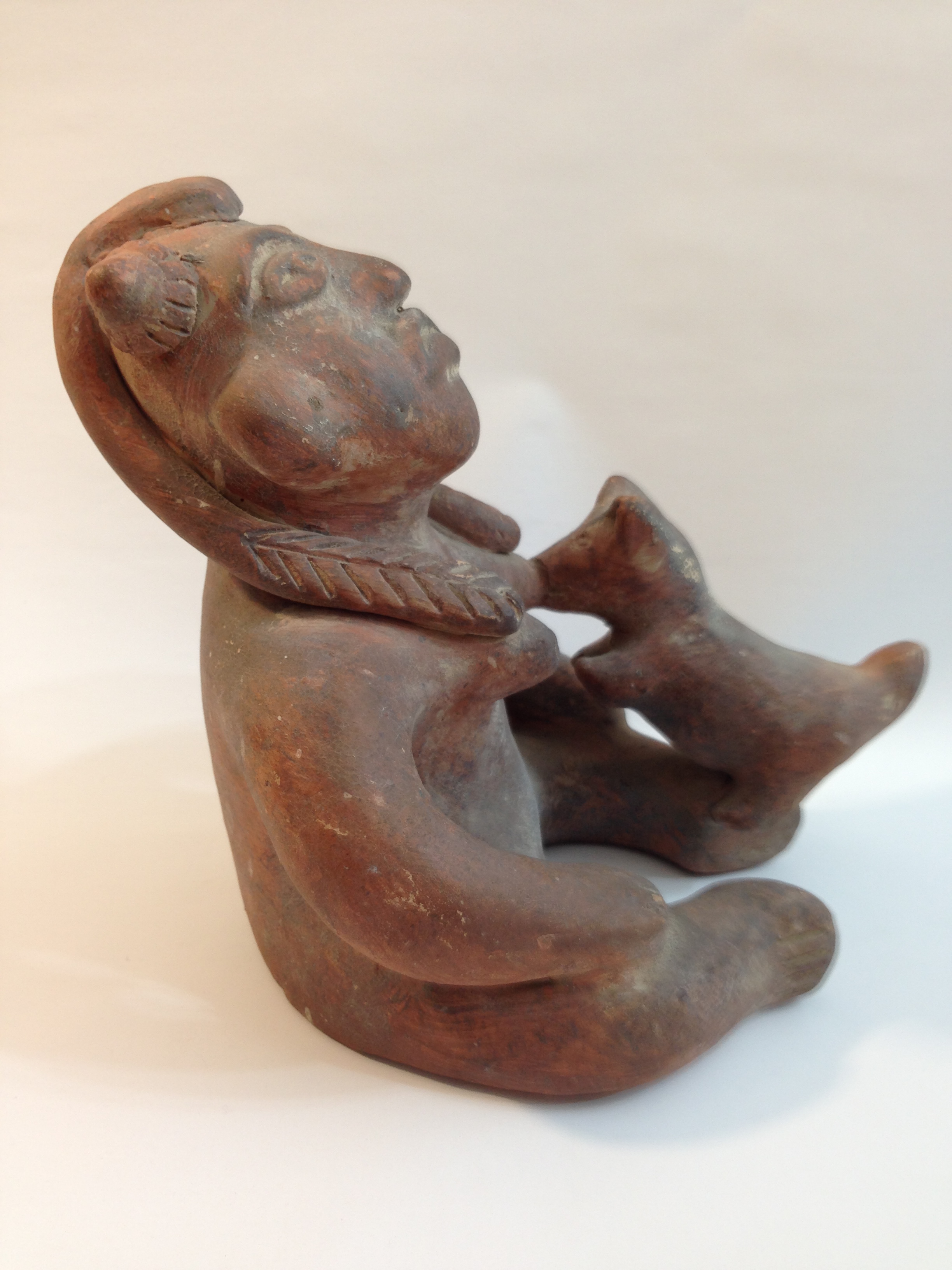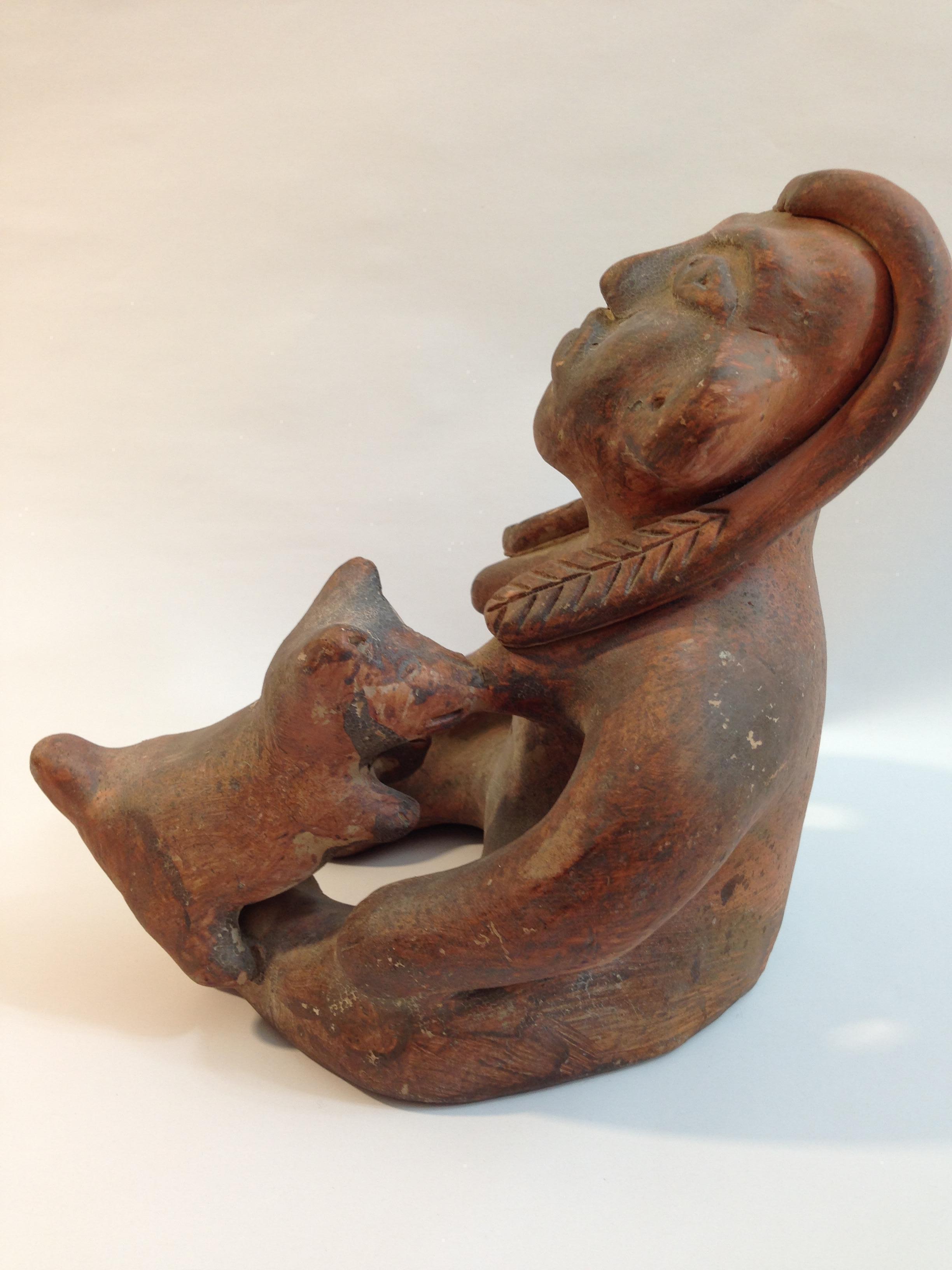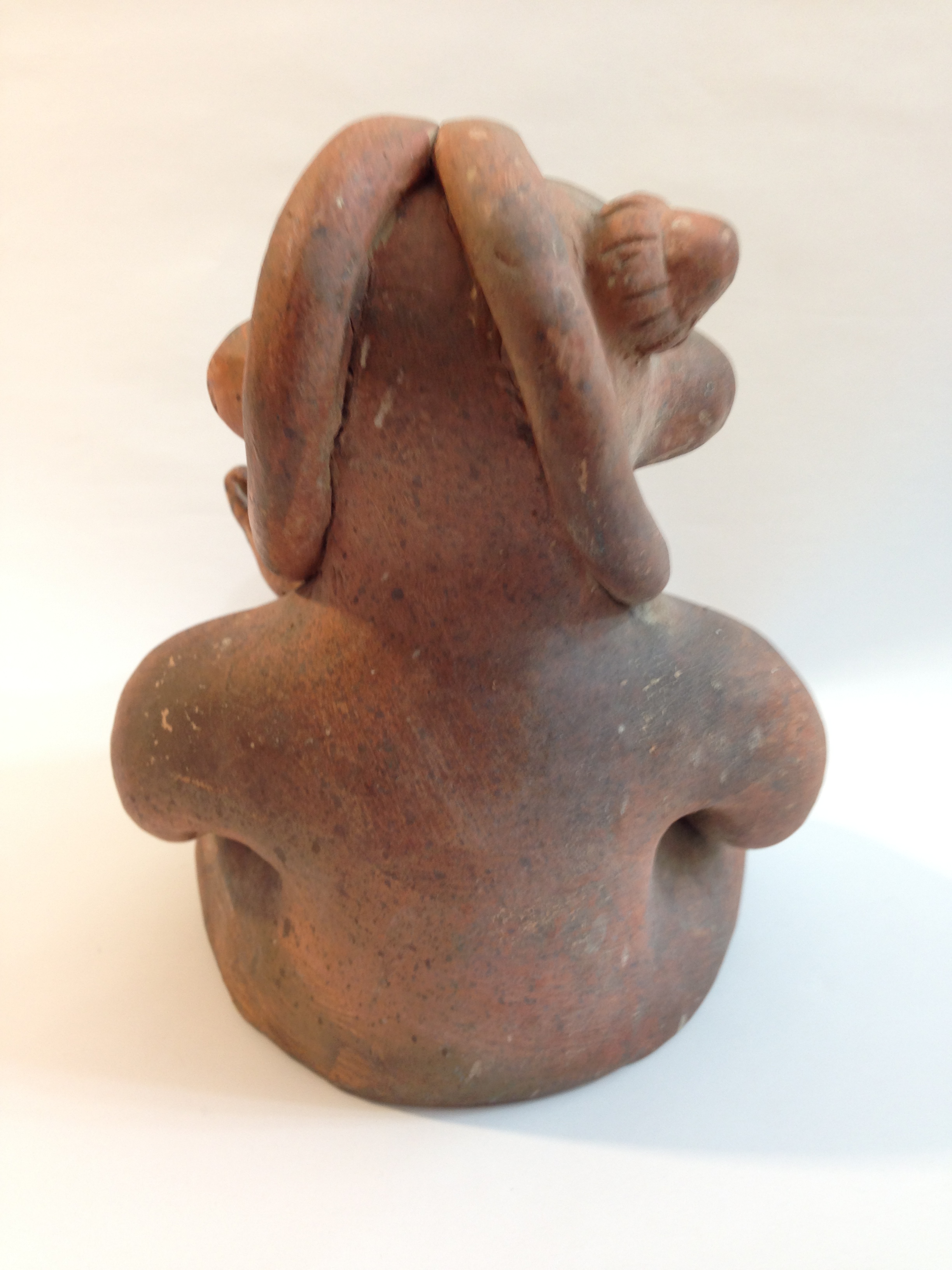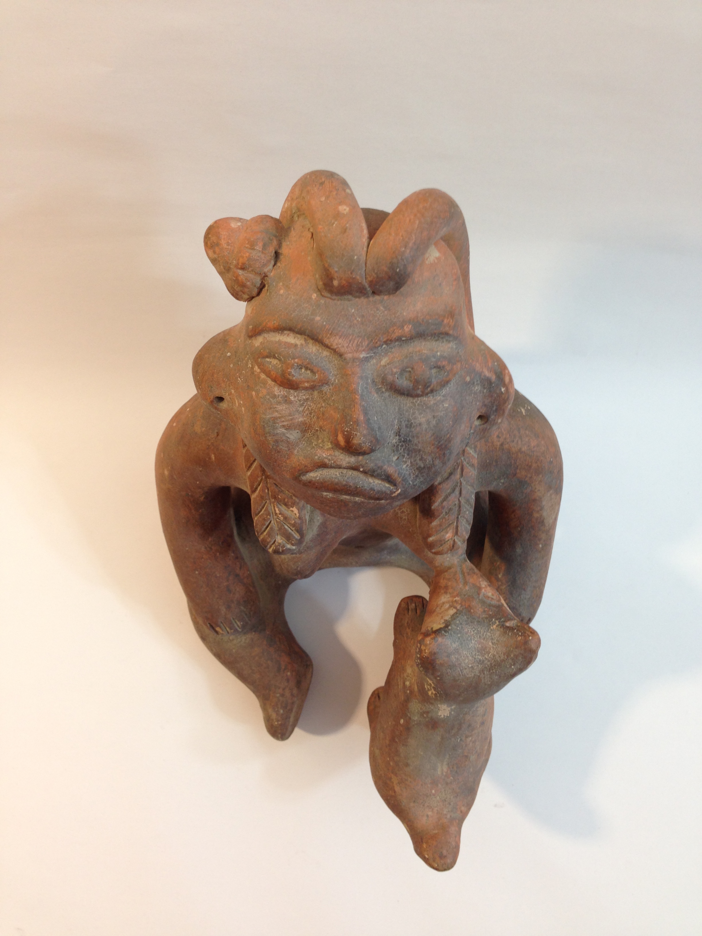 This figure is 6 1/2" high, 5 1/2" across the bottom,weighs 1lb.-10oz. and made of clay I believe. There are no markings except on the bottom where someone wrote " #14" in marker. I took it to a free appraisal fair where I was told by a general appaiser that it was columbian or pre-columbian and that I should look into it further. Any info is greatly appreciated.