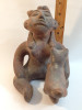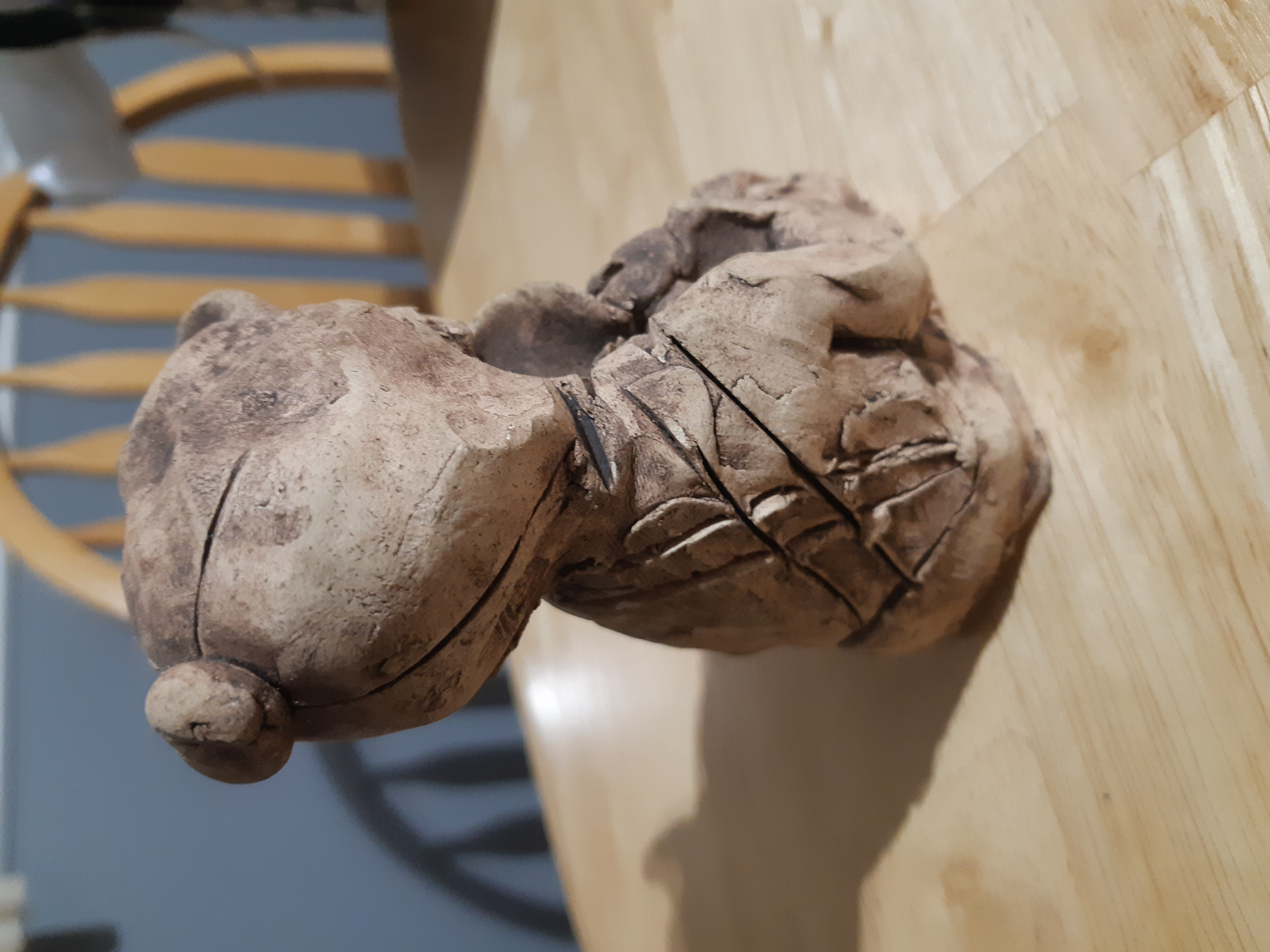 Clay figurine of boy holding a dog. Sticker on bottom is quite worn and I can't make it out. What i can make out says "original sculpture"