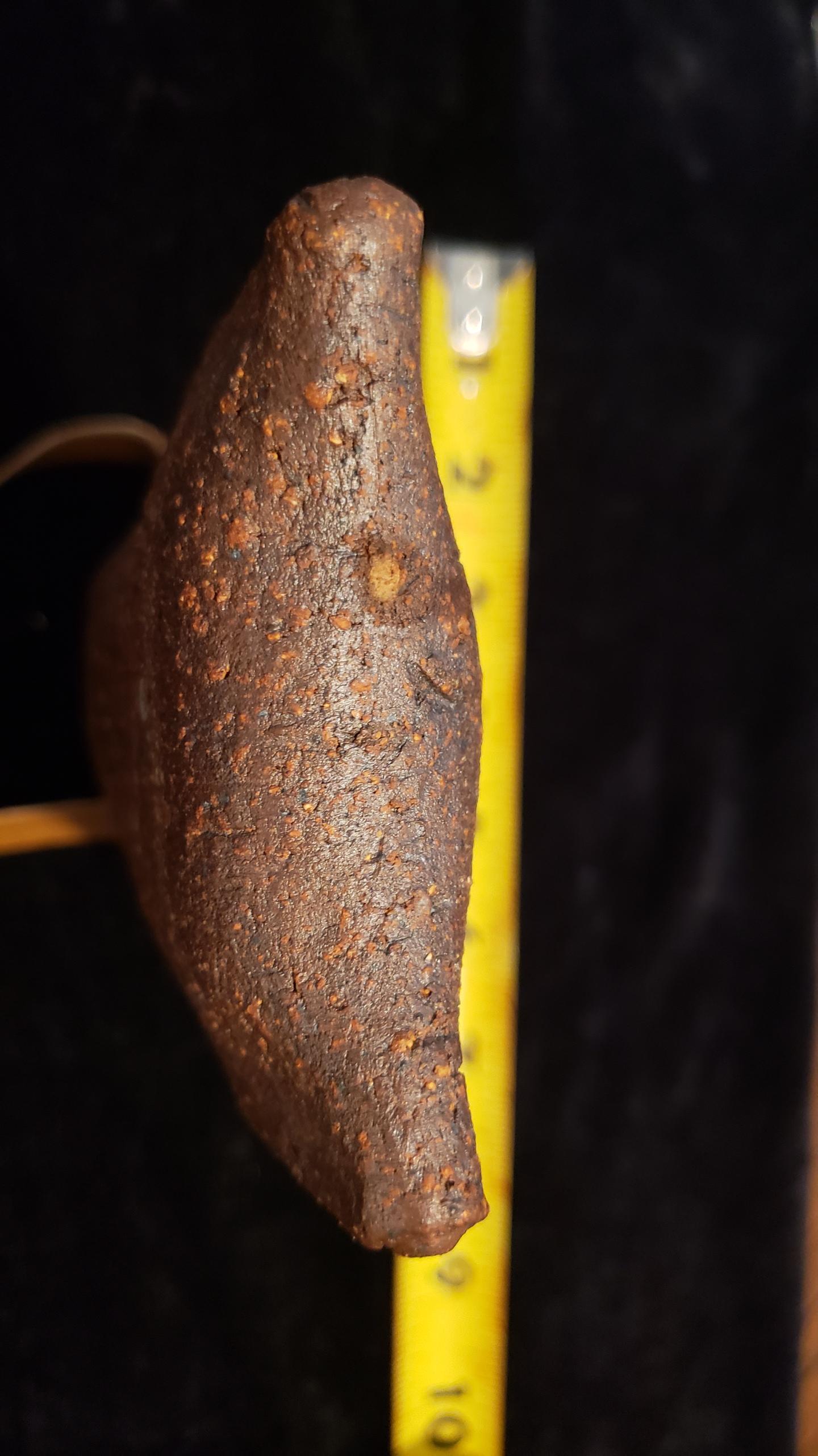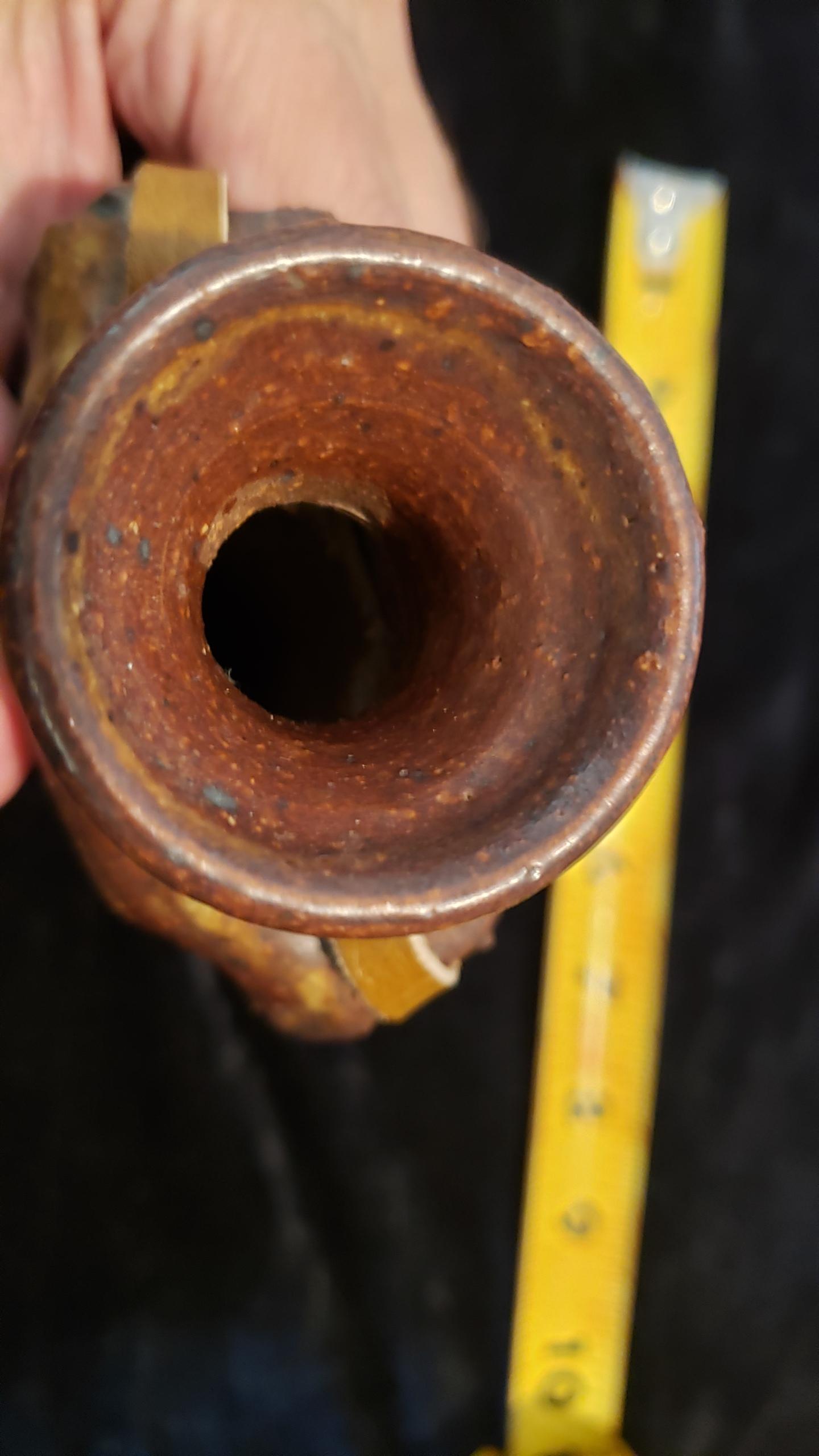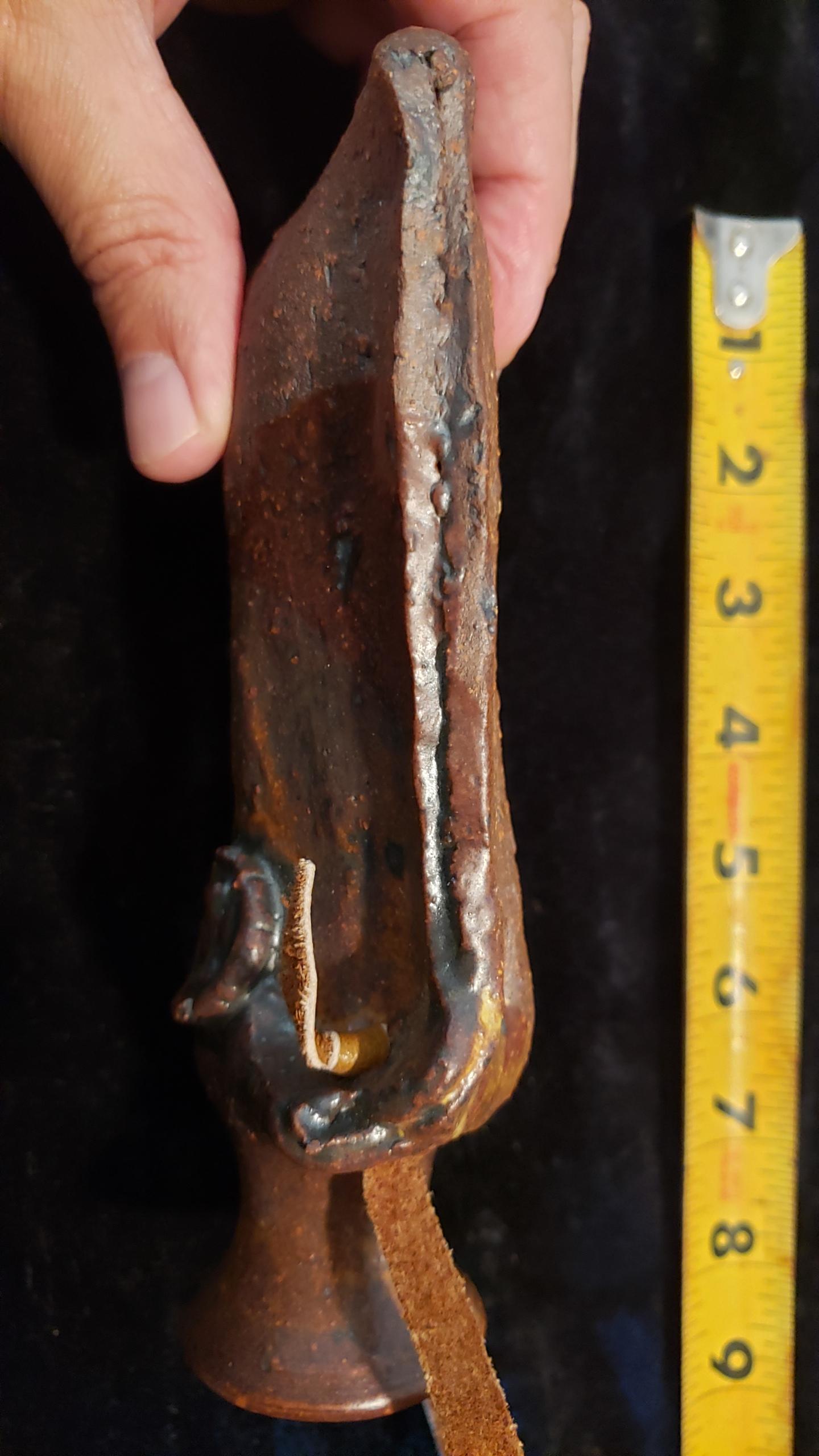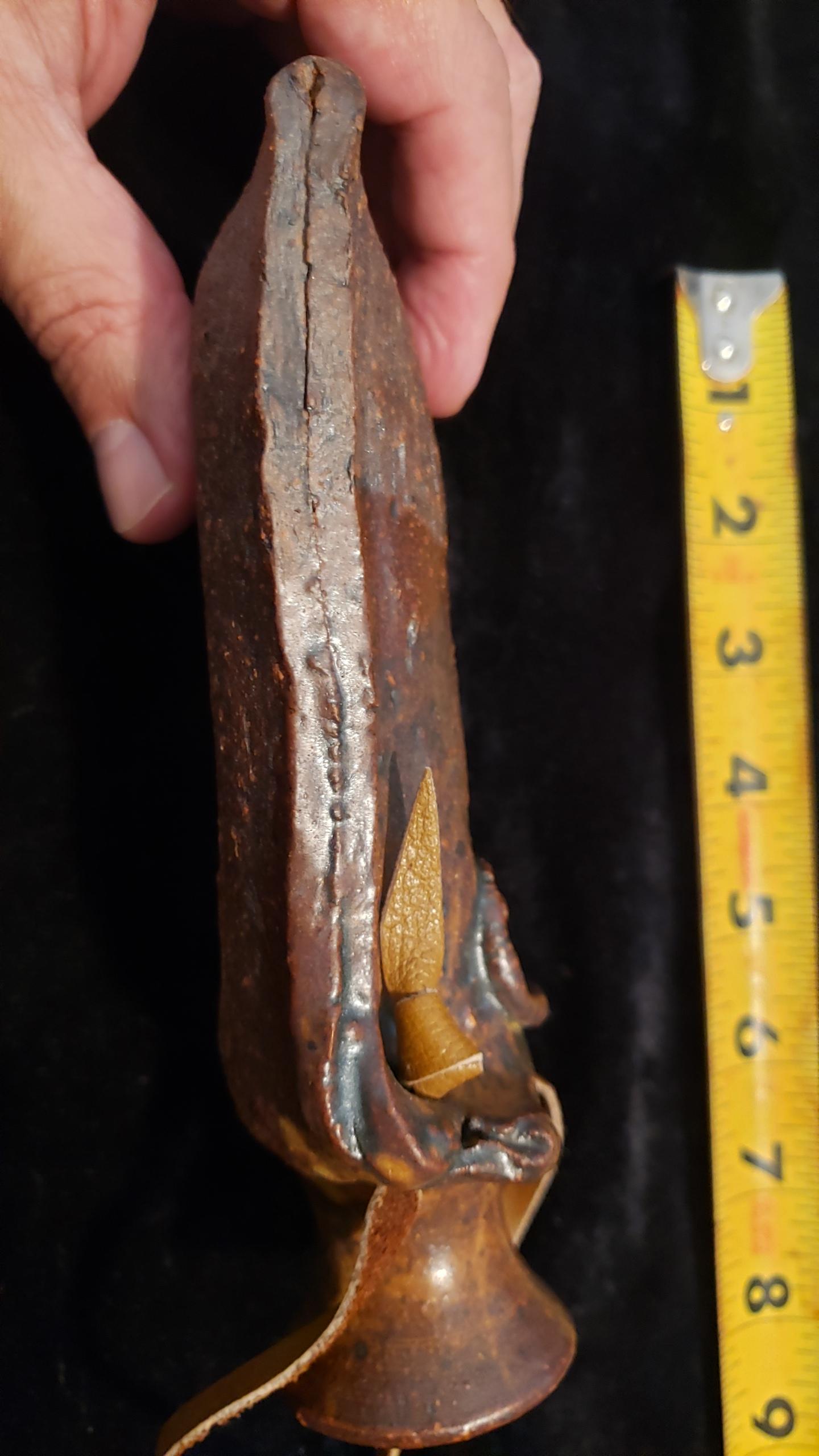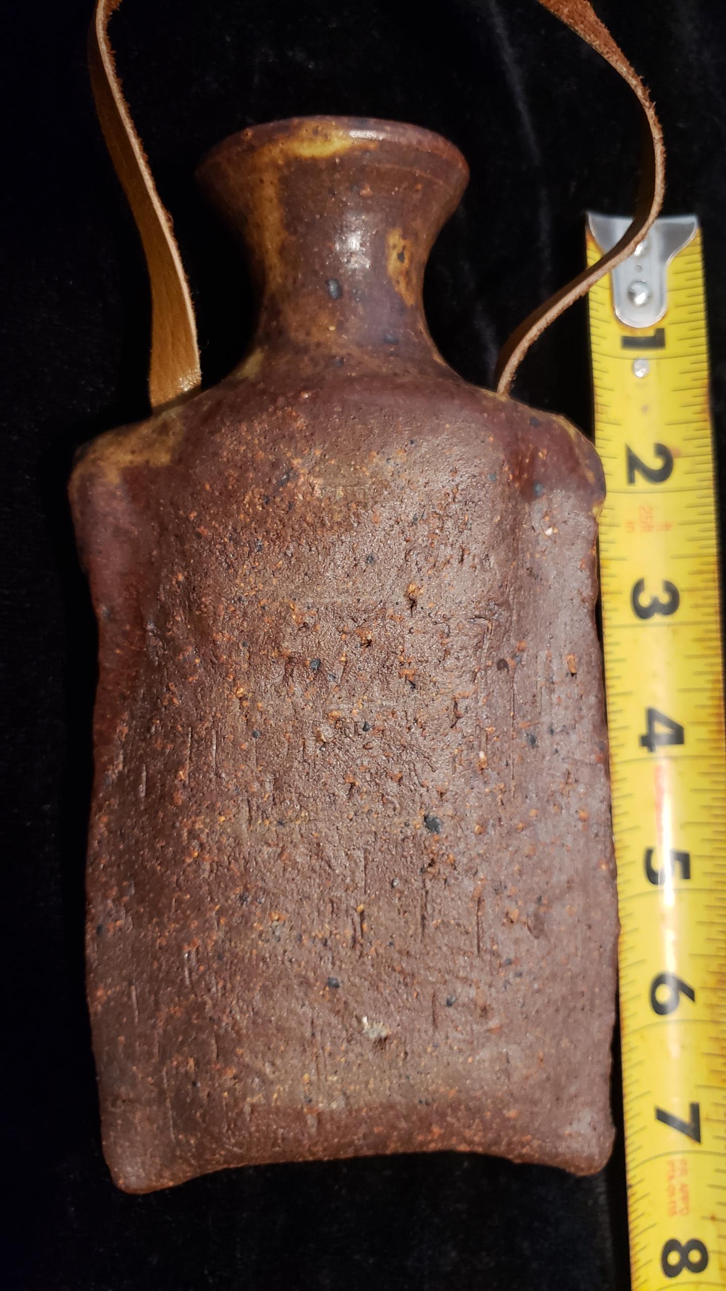 7" long, fired clay folded flask w cross symbol. Cord not original.