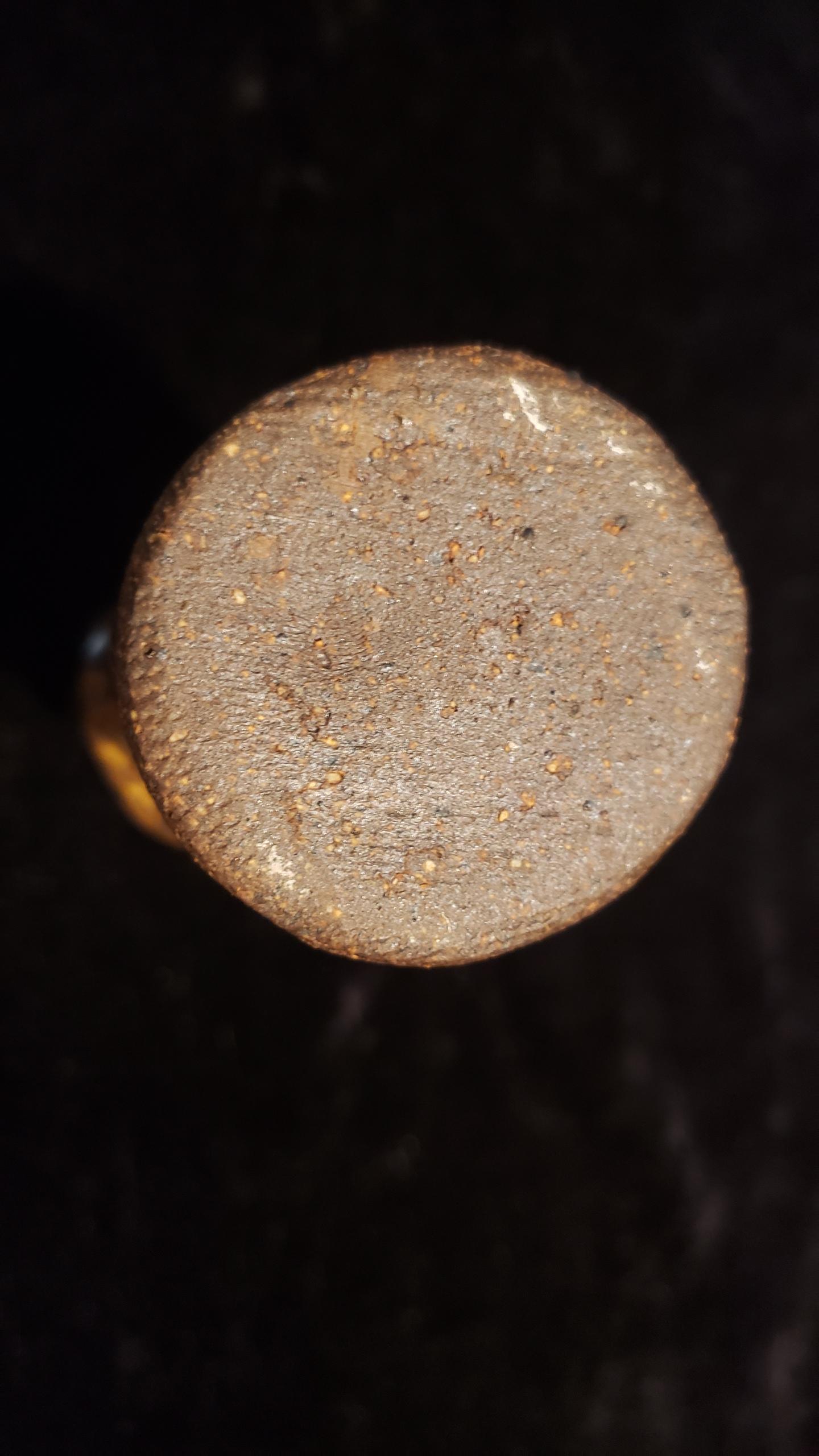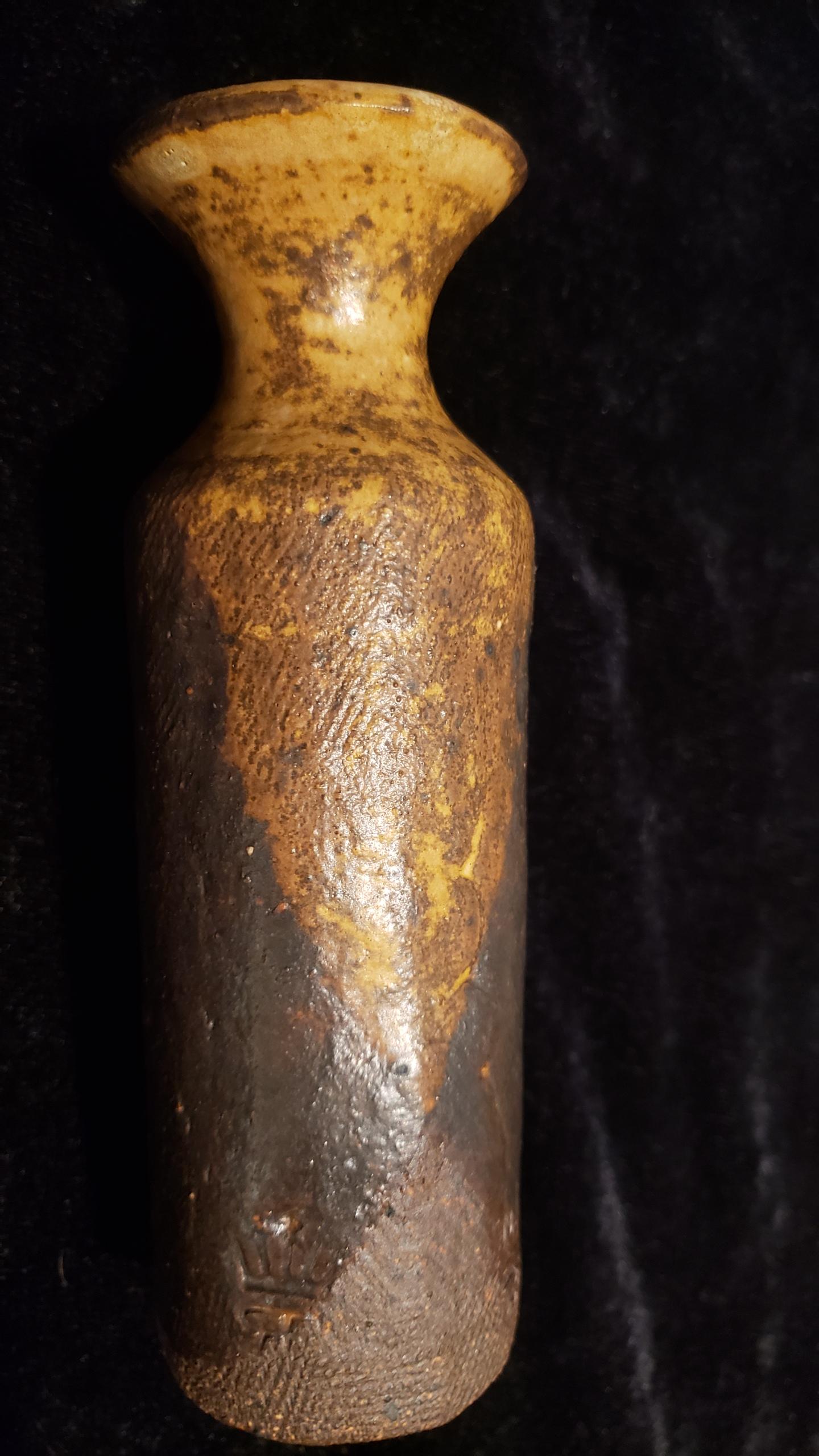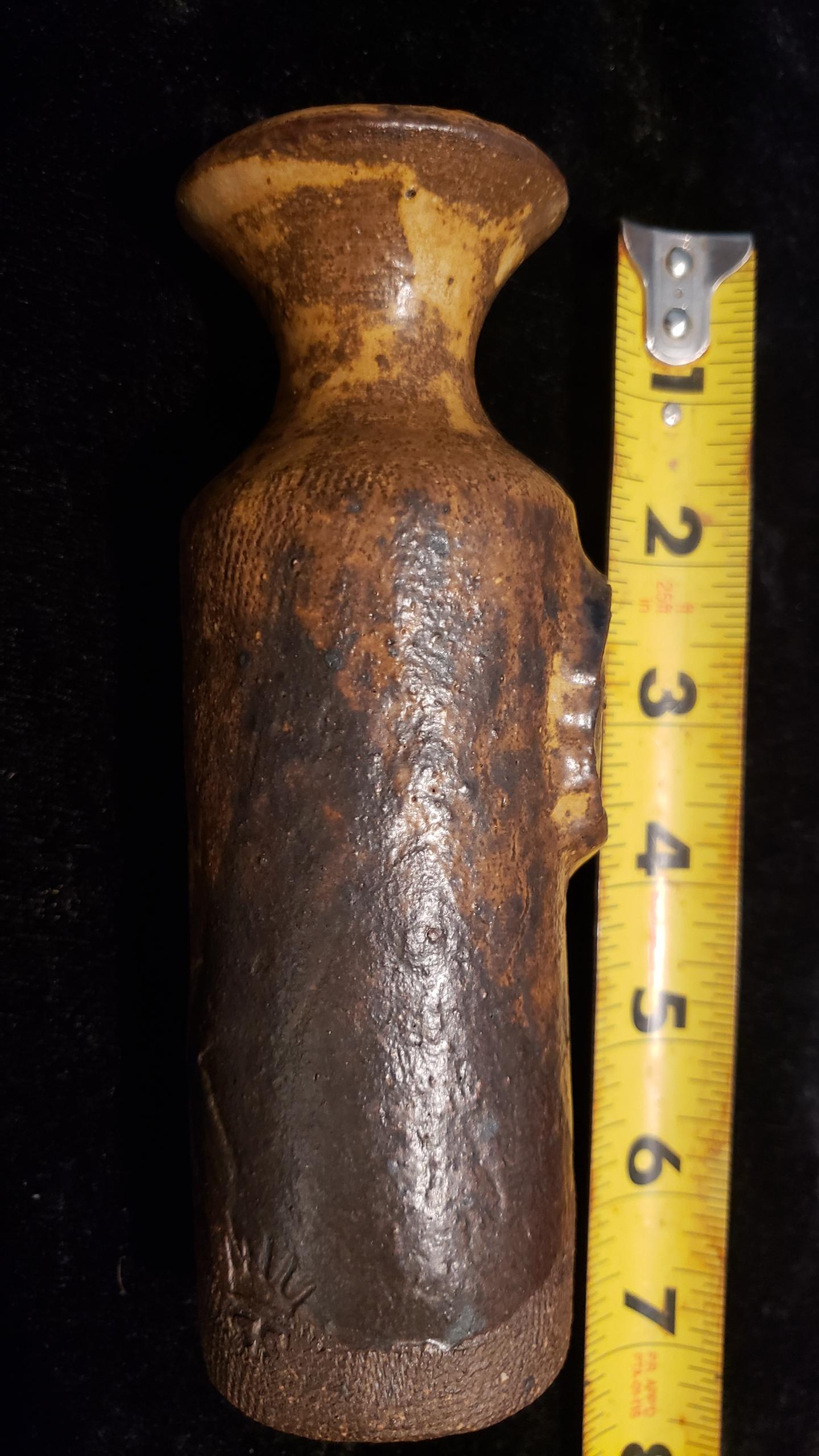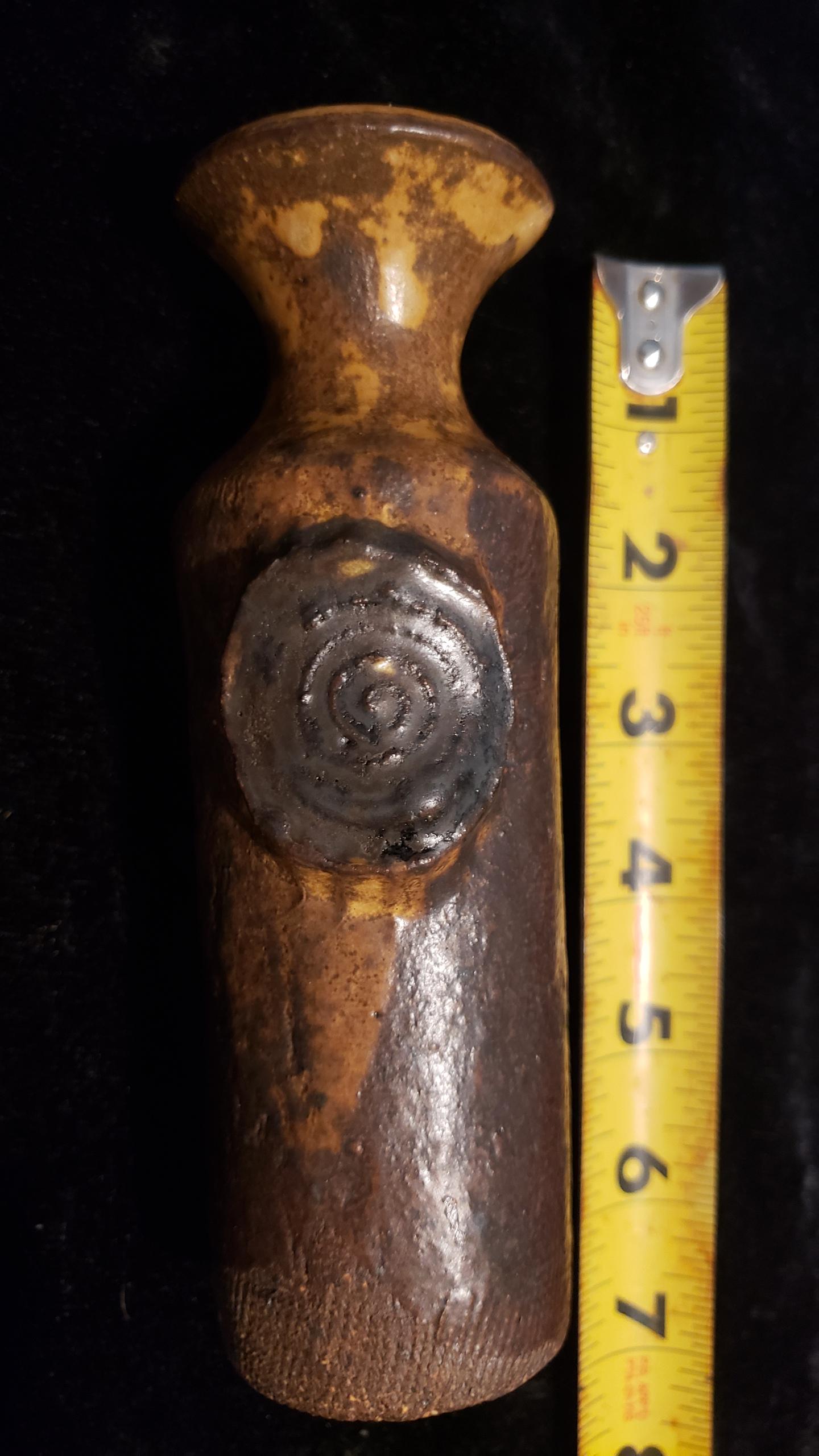 6.25" clay vase with maker's mark and infinity symbol.