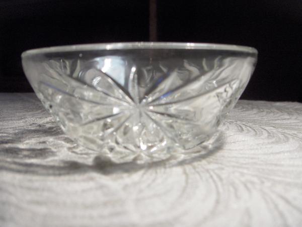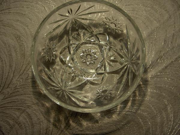 The clear glass bowl is 5" in diameter,and 2 1/2" high. it has a design on it but there is no lettering or numbers on it to help identify it.