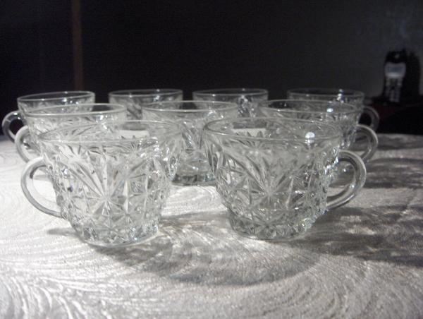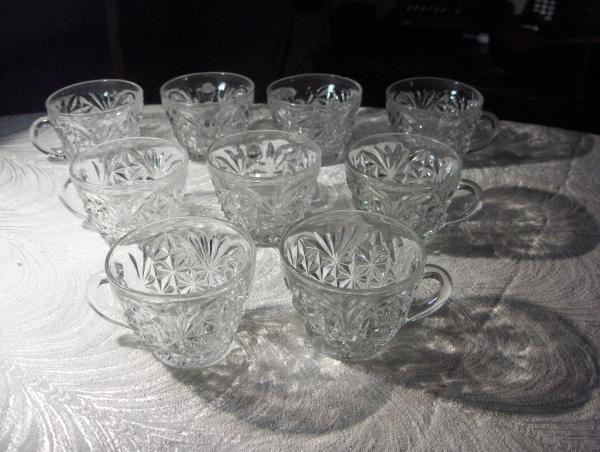 The 9 clear punch bowl glasses have the same design on them, the bottom of the glasses are 2" in diameter, the top of the glasses are 3" in diameter,and they are 2 1?2" high. There are no lettering or numbers on any of them to help identify them.