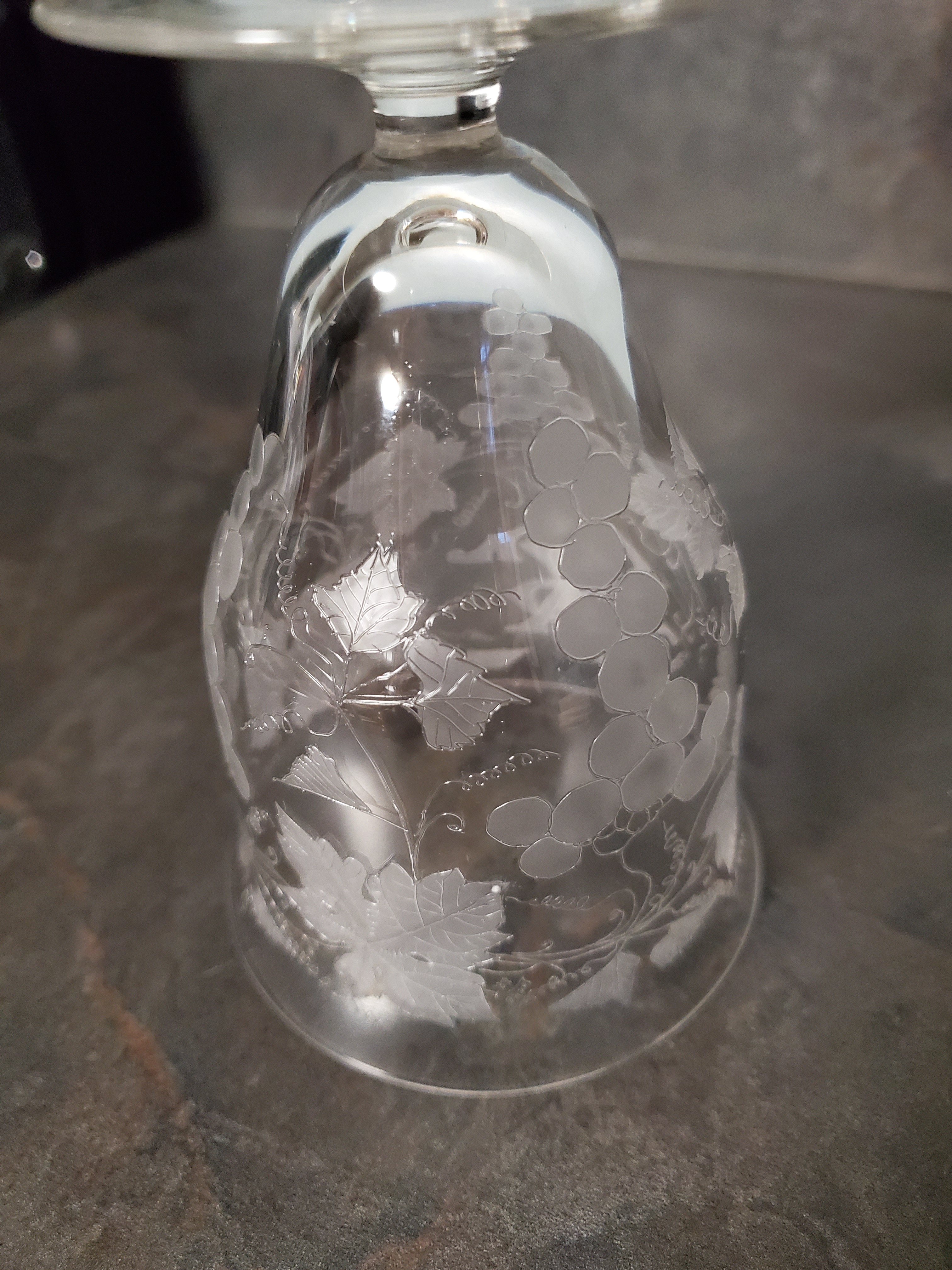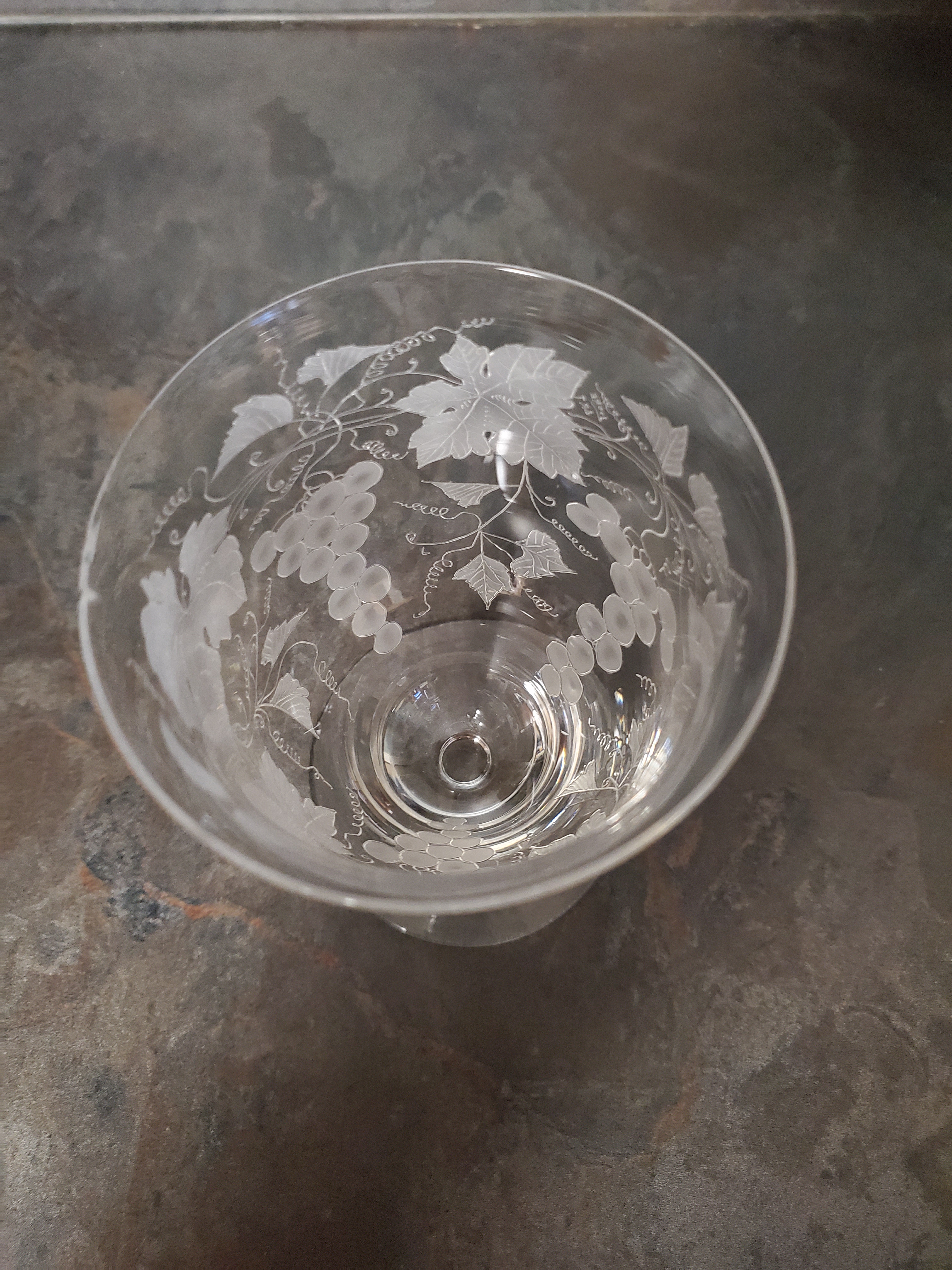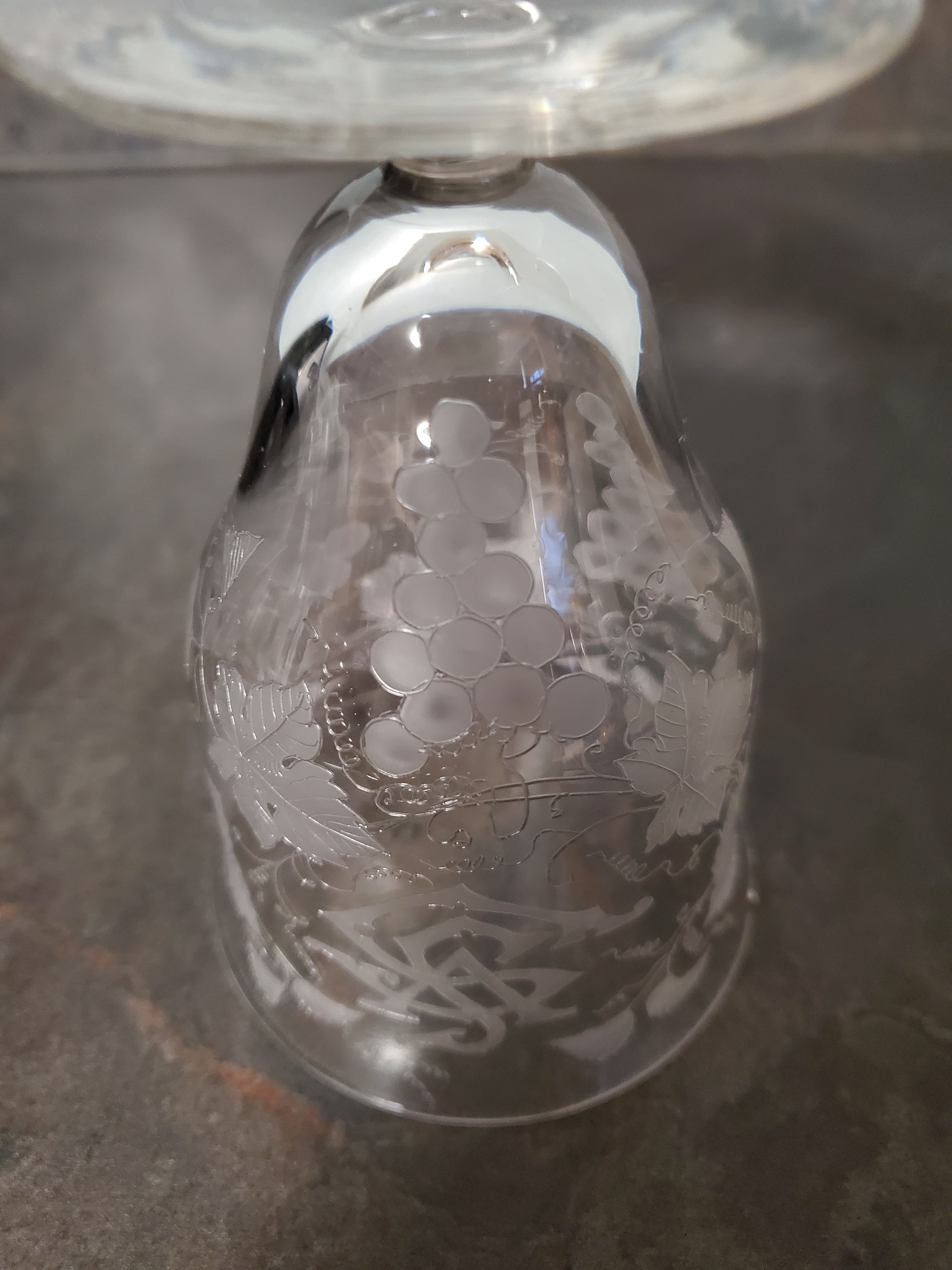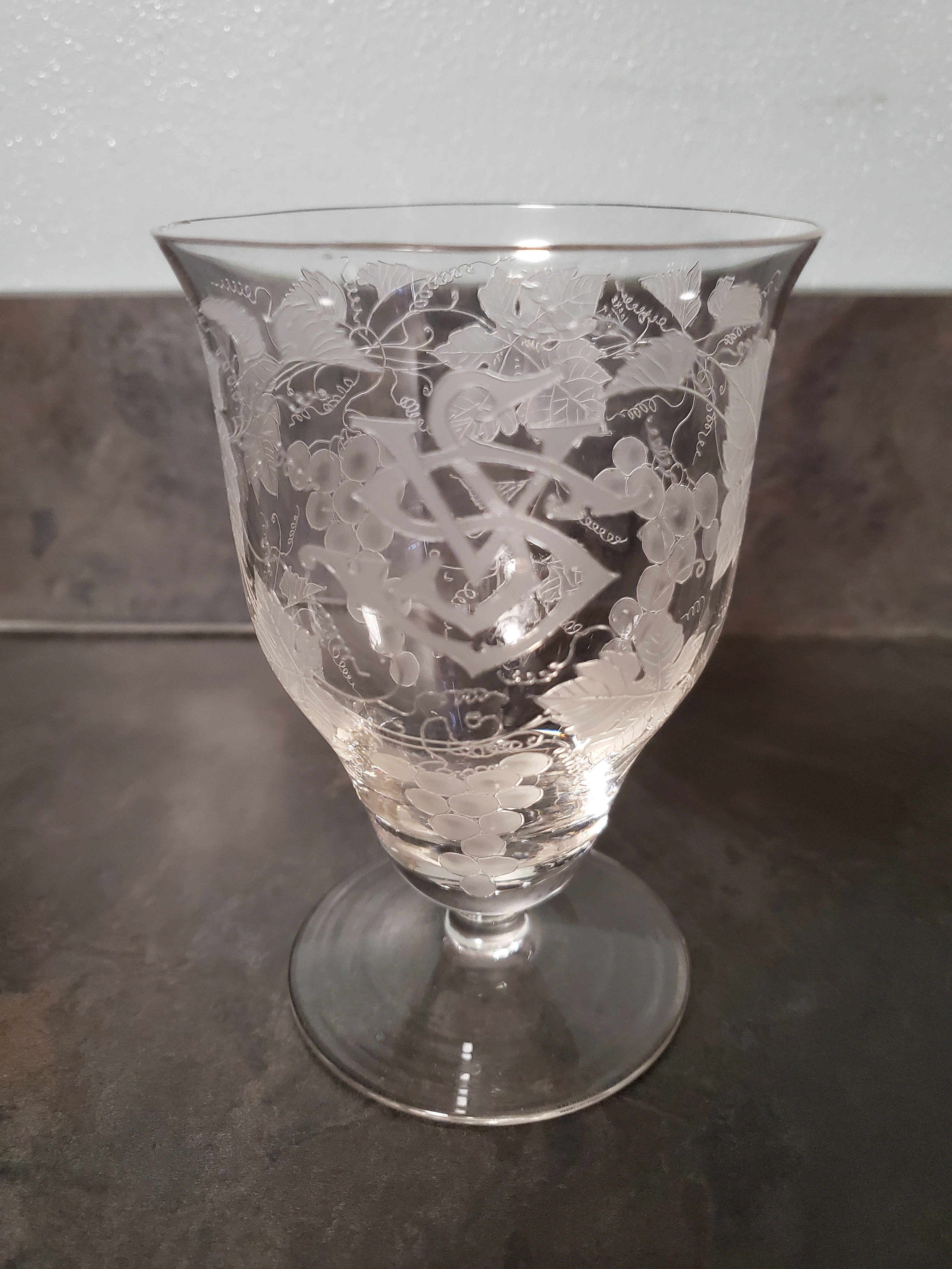 I've had this glass for at least 40 years.  It is pretty thin and fragile with etching of grape clusters, leaves and vines.  It also has the letters SVS etched on it, although I do not know the order of the letters.  It is 4 1/2 in. tall, 3 in. rim and 2 1/2 in. foot.