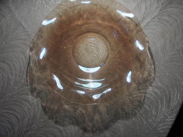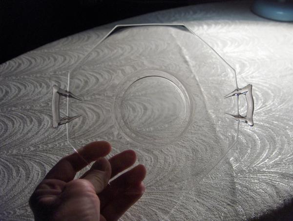 The hexagon shaped glass saucer that has a tinge of amethyst color to it has handles on each side. No lettering or markings to identify it. It is 6 1/2" in diameter.