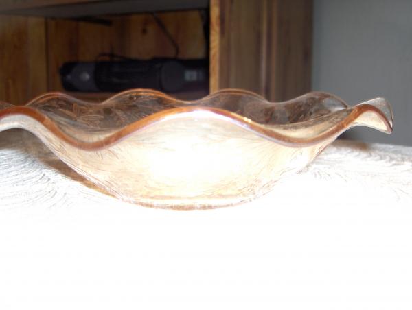 The orange colored bowl with luminescence appearance has a beautiful design of flowers and leaves all over it. The edges are scalloped, there are no markings to identify it. It is 9 1/2" in diameter, and 3 3/4" high.
