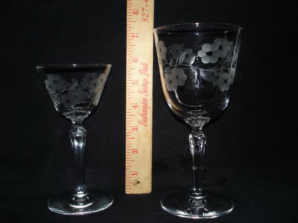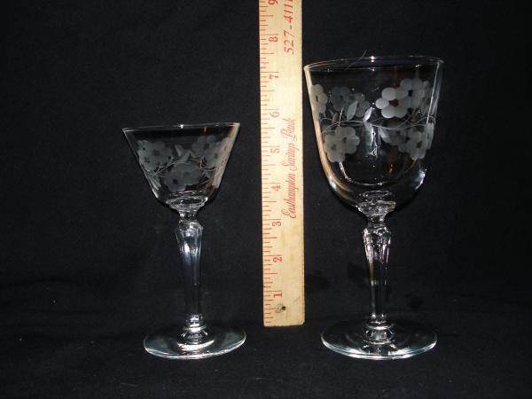 Wine glasses are 7" tall and etched with a floral/leaf pattern. They were a wedding gift to my parents in the 1940's. The cordial/apertiff glass is 5.5" tall. Several of these glasses were damaged when a family member mailed them to me. I would like an estimate of what replacement costs would be. Please email any information you have to [email protected]