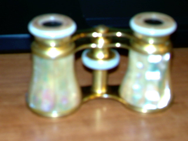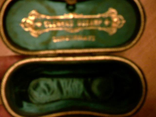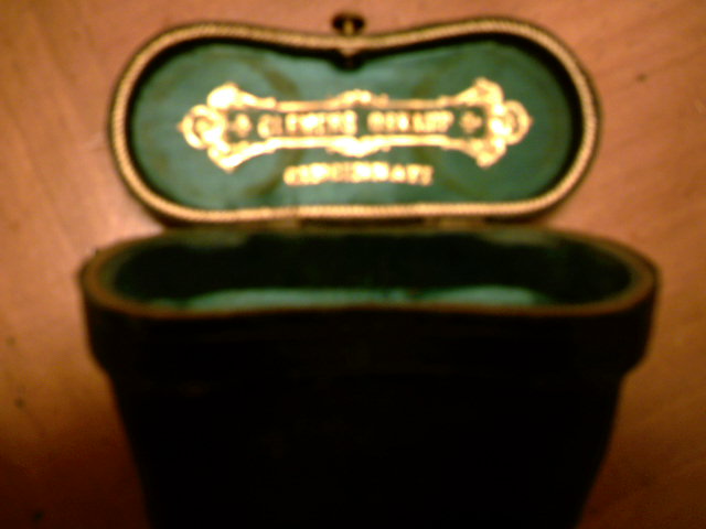 Mother of Pearl and brass opera binoculars made by old jewlery company from Cincinnati Ohio called Clemens Oskamp. Lemaire FI Paris is marked on left eye rim and Clemens Oskamp Cincinnati on the right eye rim. Doesnt have the option for the handle but does have original case made of leather that is green in color with company insignia on inside of lid and still in good condition. Binoculars in excellent condition.