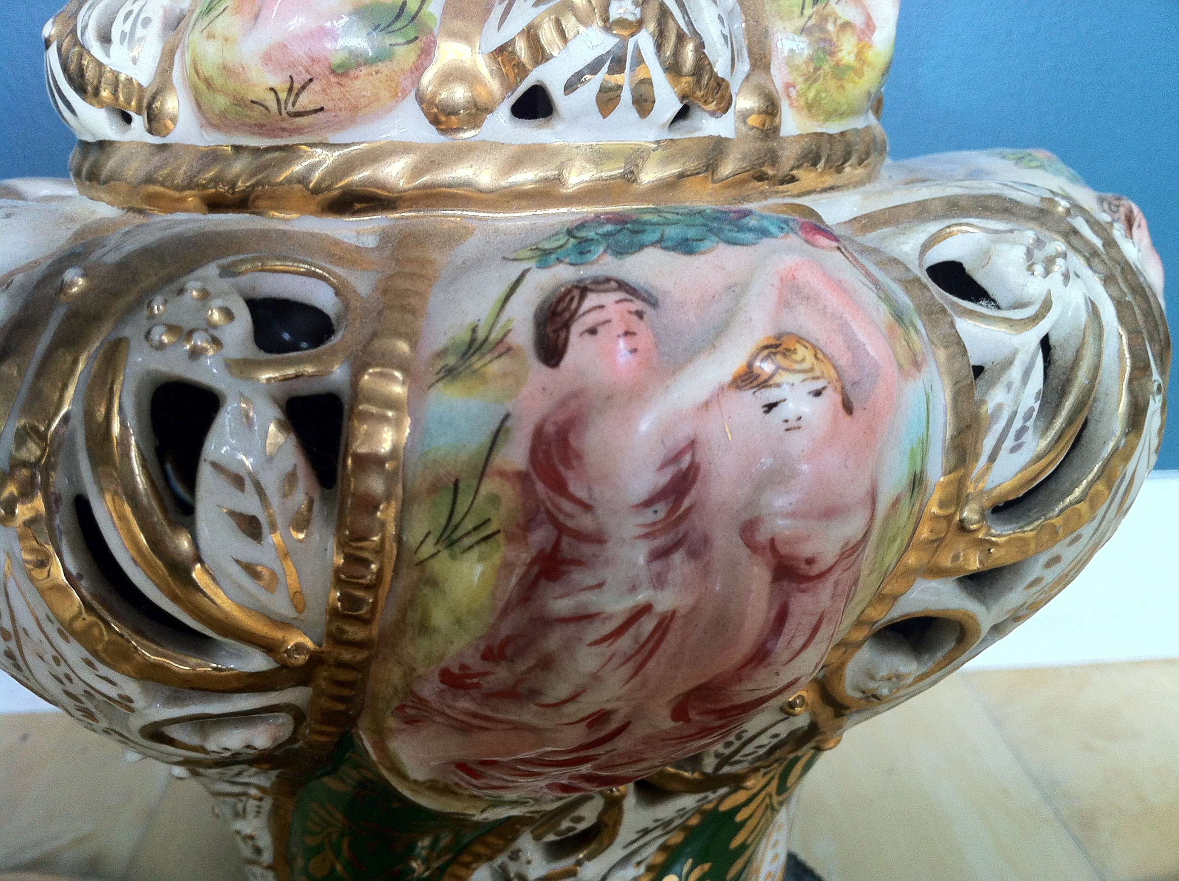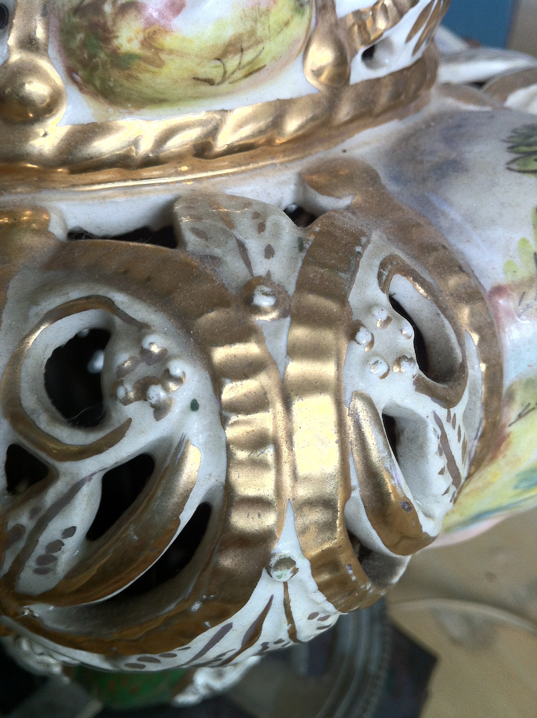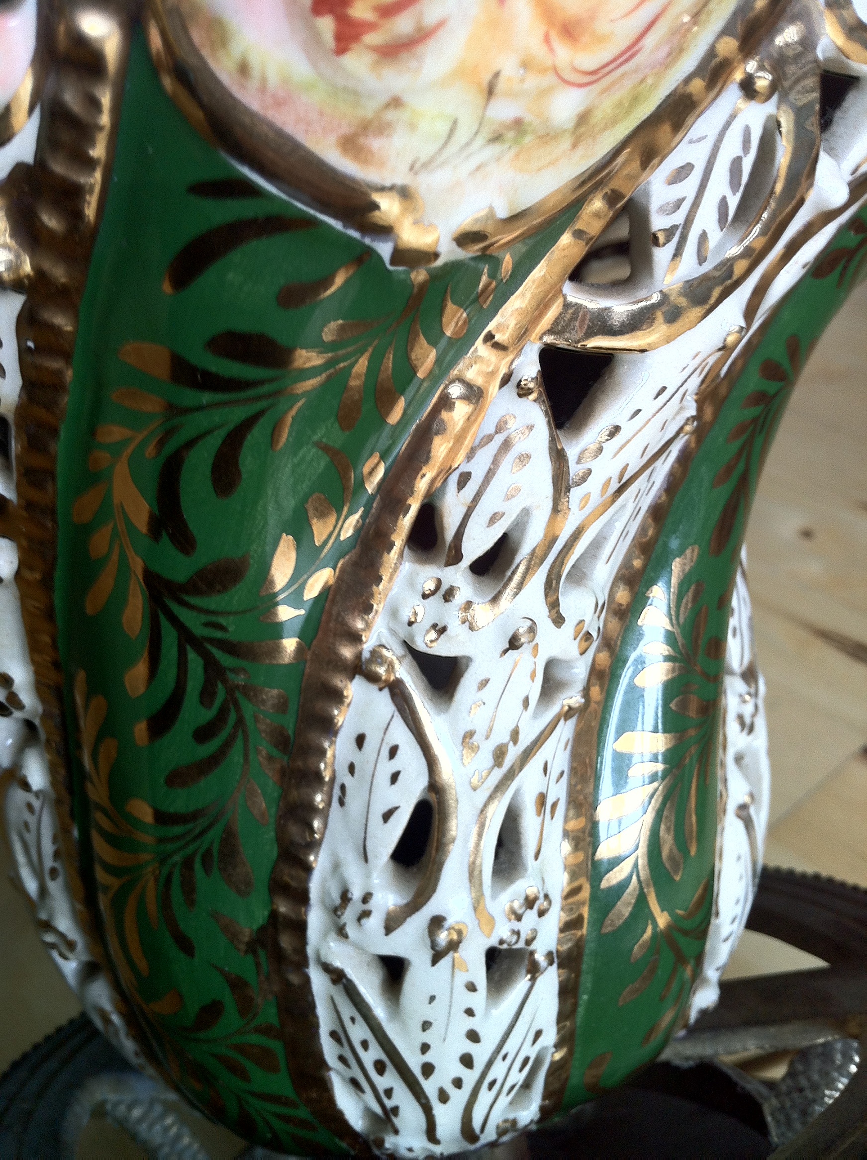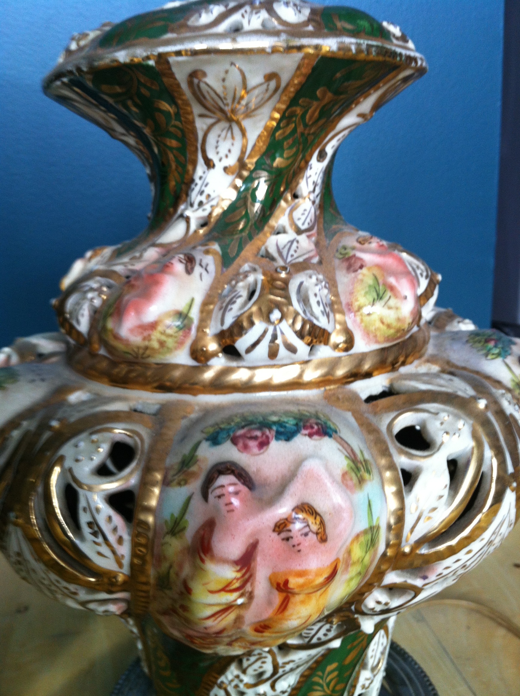 The lamp is approx. 28" tall bottom to tip, the ceramic lamp itself is around 12" tall. It looks as if the base has been replaced, due to the broken bottom shown in picture. There are no markings anywhere, other than the letters "ON" shown in picture. The base is screwed in tightly, and I cannot move it to see the rest of the marking. The colours are a cream base with arms of green throughout. It looks handpainted, mostly in pinks with yellow, green, blue and brown. There is a gold (gilt?) overlay and leafing.