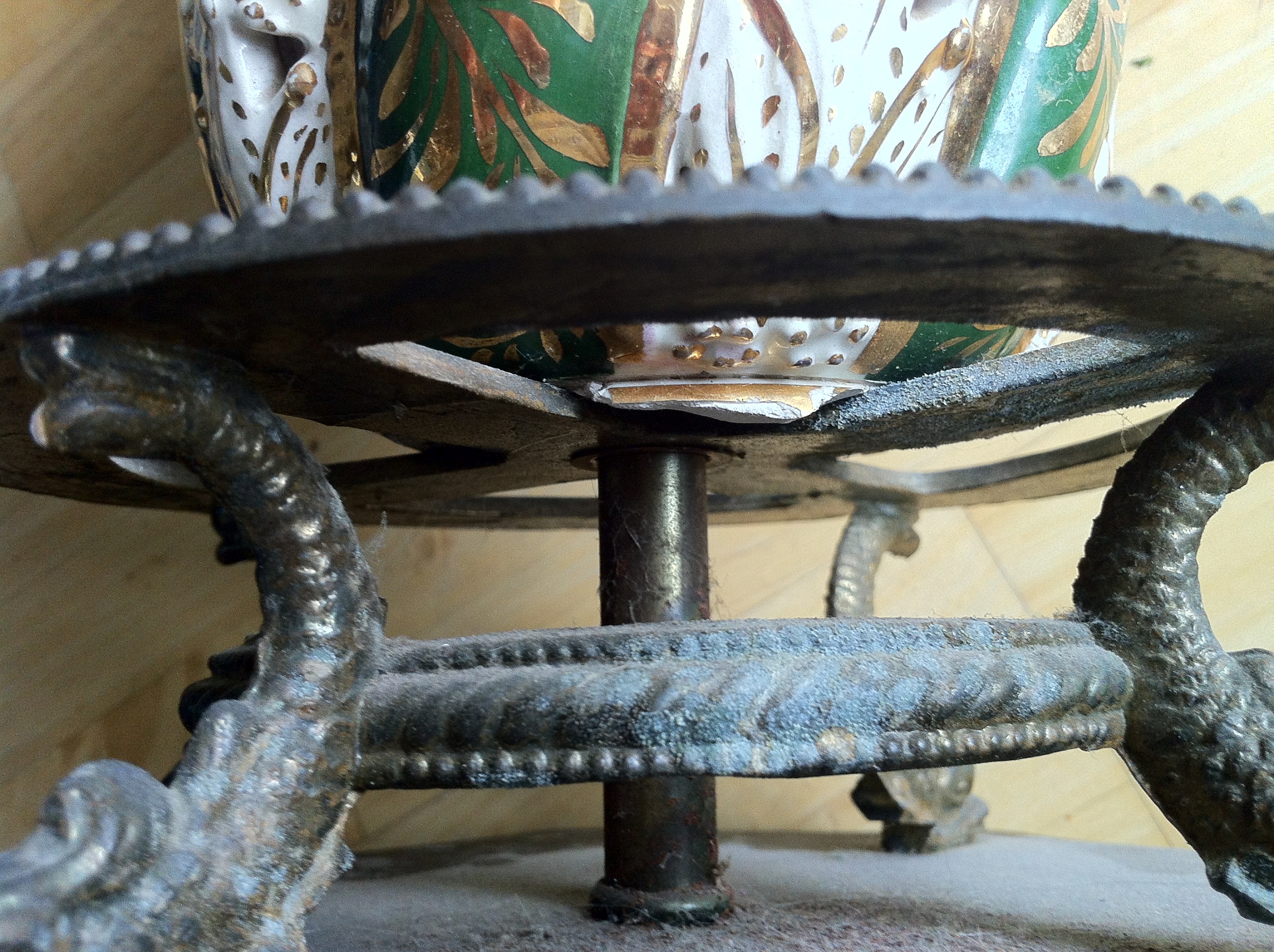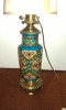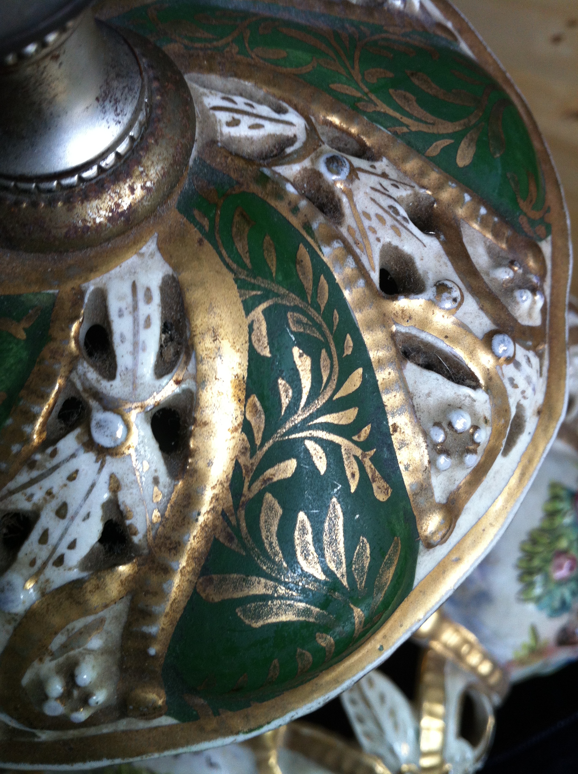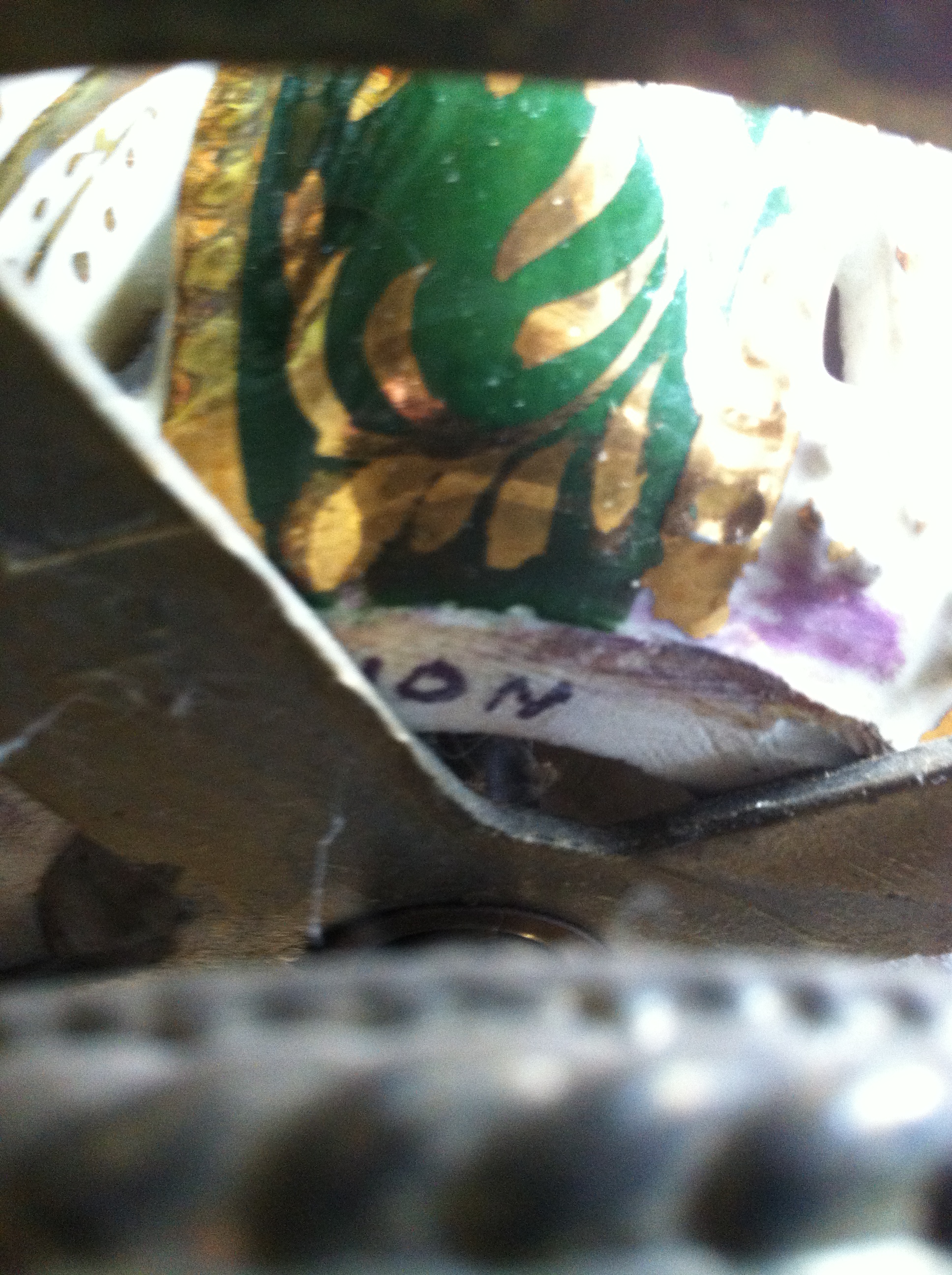 The lamp is approx. 28" tall bottom to tip, the ceramic lamp itself is around 12" tall. It looks as if the base has been replaced, due to the broken bottom shown in picture. There are no markings anywhere, other than the letters "ON" shown in picture. The base is screwed in tightly, and I cannot move it to see the rest of the marking. The colours are a cream base with arms of green throughout. It looks handpainted, mostly in pinks with yellow, green, blue and brown. There is a gold (gilt?) overlay and leafing.